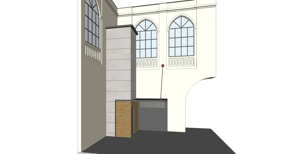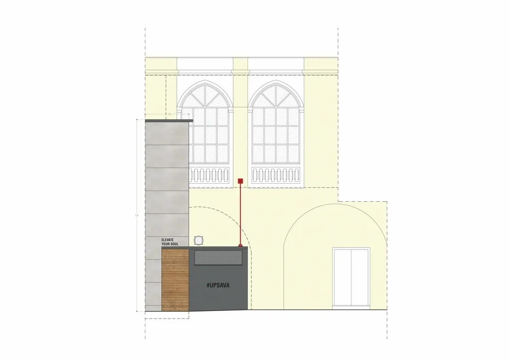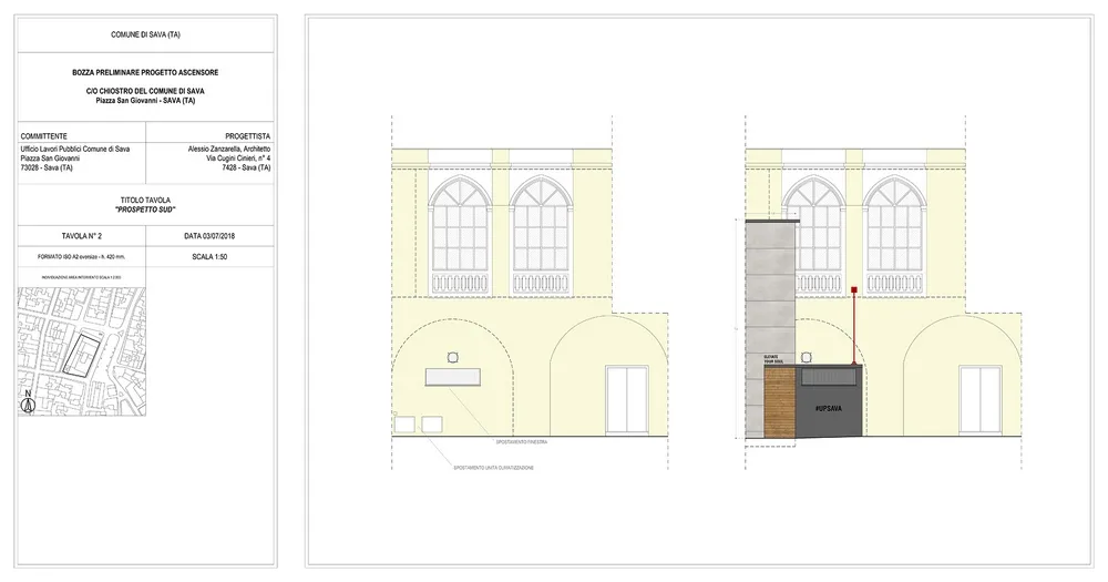 La mia prima bozza del progetto ASCENSORE (dopo aver ricevuto l'incarico dall'Ufficio Lavori Pubblici di Sava), da collocare nell'atrio del Municipio, utilizzando materiali insoliti dal gusto nordico (legno naturale, lamiera verniciata a caldo, pannelli di gres effetto cemento) anche per determinare uno "stacco netto" con il contesto, con uno spirito "conservazionista". La leggerezza del tirante con staffa di colore rosso, anch'esso verniciato a caldo, che regge lo sbalzo della tettoia, bilancia l'imponenza volumetrica del vano ascensore. Ora la bozza dovrà essere valutata dalla Soprintendenza dei Beni Culturali di Taranto. Mi auguro che sarà accolta.
