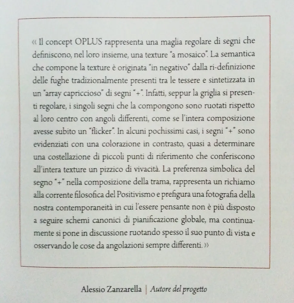 Il mio segno "+" (da cui il nome OPLUS+) ha colpito insomma; forse per la sua pulizia formale ma nello stesso tempo vibrante; o per il concetto che c'è dietro la definizione di questi segni ripetuti e ruotati in uno spazio immaginario infinito. Non è solo l'aver vinto il concorso che mi emoziona, ma anche il presentimento che questa nuova collezione sarà un successo anche commerciale per l'azienda Ornamenta®. Davvero felice!