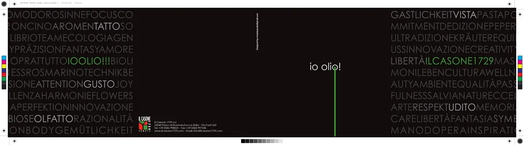 IO OLIO! è un'associazione fondata da Andrea Beck, proprietaria del resort CASONE1729 a Massarosa (LU), una comunità di artisti di varia nazionalità e in generale amanti dell'olio non solo come alimento, ma come stile di vita. L'architetto Zanzarella ha di recente elaborato il logo istituzionale, la comunicazione e ha progettato 2 pannelli luminosi da apporre sulle colonne in pietra situate in corrispondenza del meraviglioso spazio piscina, dove normalmente vengono tenuti i convegni. I 2 pannelli si illuminano con sistema backlight, facendo risaltare la geometria lineare, elemento caratterizzante della composizione grafica del logo.