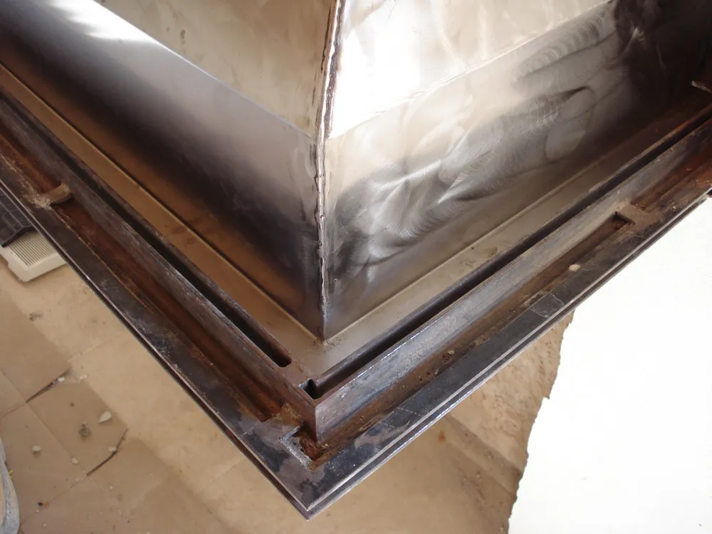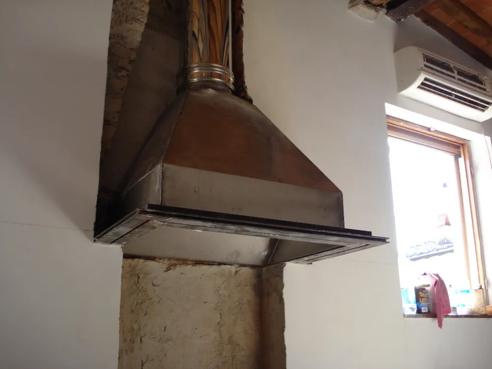 - cappa in acciaio con "fazzoletto" inclinato integrato per ostruire le correnti provenienti dall'alto e coibentata con lana di roccia;
