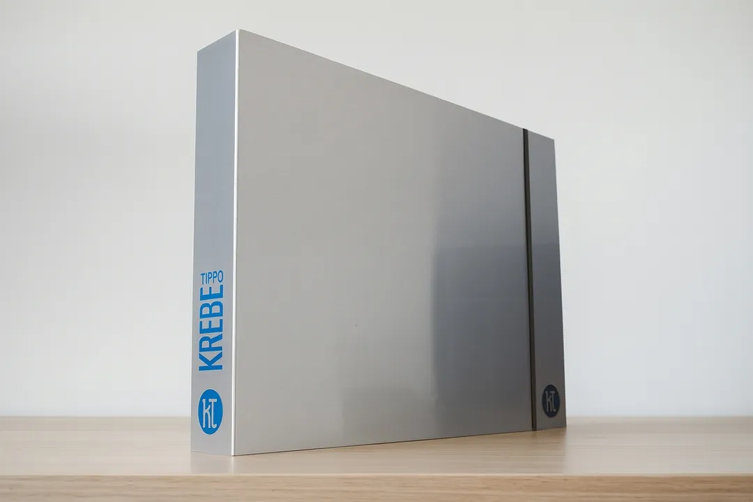 Siamo a dicembre e a inizio del nuovo anno 2010 l'azienda KREBE TIPPO finalmente promuoverà il suo nuovo logo disegnato e ideato dall'architetto Alessio Zanzarella. In questo articolo vi è una breve sintesi del percorso creativo e collaborativo che l'architetto ha intrapreso da ormai quasi un anno con l'azienda. Il logo KT sancisce la forza di questa azienda che per mezzo delle sue iniziali, vuole comunicare l'orgoglio e la consapevolezza della sua leadership in ambito "macchinari per il lavaggio industriale". L'architetto ha ideato anche le etichette in rilievo e le serigrafie da apporre sulle lavatrici dopo aver effettuato una meticolosa selezione dei colori e delle finiture, fino a ideare un logo pressofuso nell'acciaio. Oltre al logo istituzionale, Zanzarella ha disegnato anche il logo di una particolare funzione di cui queste macchine industriali sono dotate: il G FACTOR, che è un particolare procedimento grazie al quale nelle lavatrici KREBE TIPPO si attivano alcune peculiari performance. Nel percorso di direzione artistica rientrano diversi step di progettazione, come ad esempio il controllo e la gestione di tutte le stampe serigrafiche, con le relative prove di stampa, che saranno effettuate sui packaging. A chiudere il cerchio, la creazione del folder/catalogo istituzionale dell'azienda, ideato e creato dall'architetto con i programmi più avanzati di illustrazione grafica e che raccoglie tutte le informazioni tecniche relative ai macchinari prodotti dall'azienda in più di 10 lingue. Tra le immagini proposte, alcune schede grafiche del folder, concepito in colori tenui a seconda degli ambiti trattati. Per la copertina del catalogo, l'architetto ha scelto un materiale rigido, il d-bond in finitura "grigio specchio", tenuto chiuso da un elastico dello stesso colore del logo e sulla cui fascia interna sono stati fissati gli anelli che raccolgono le singole schede. In fondo alle immagini, alcune prime bozze di ideazione del logo.