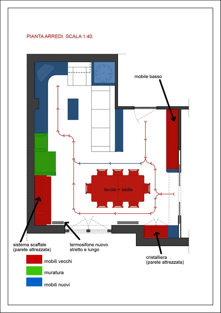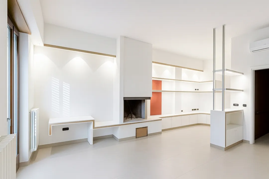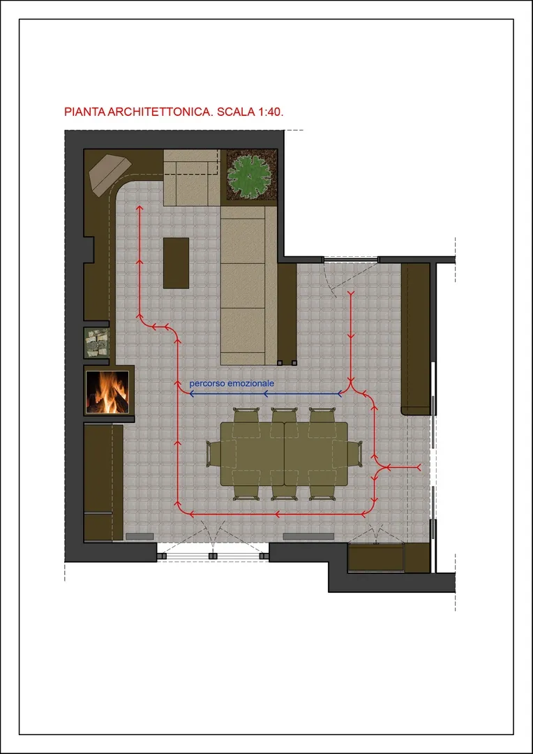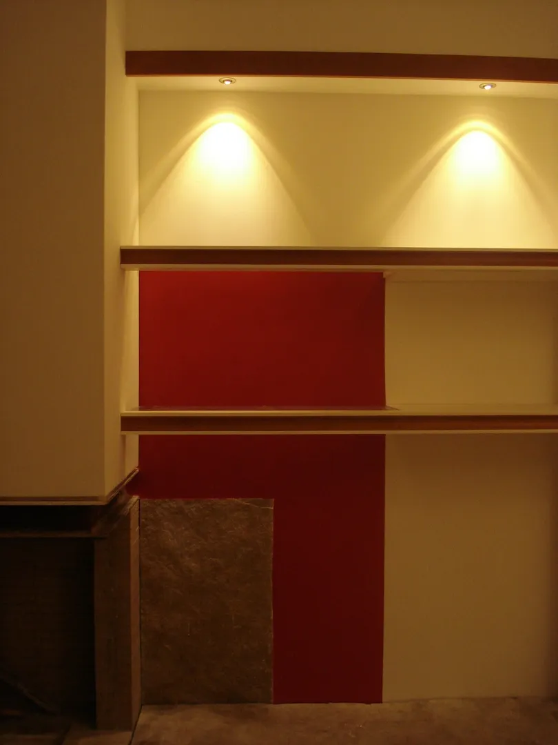 - per concludere, la creazione di un riquadro di pittura murale colore rosso carminio, che crea un'antitesi con la presenza adiacente del fuoco del camino.