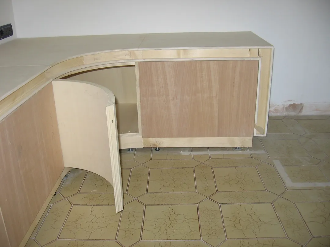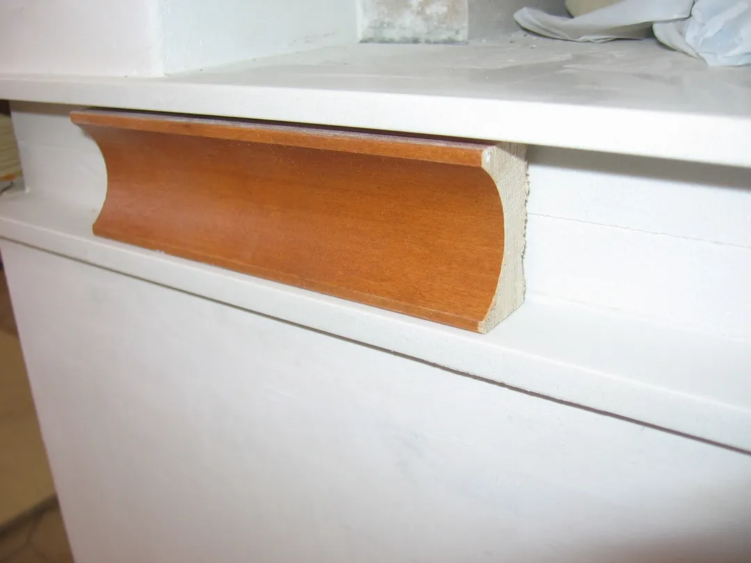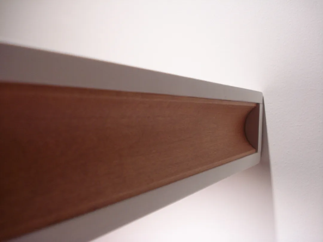 - la falegnameria con illuminazione integrata nei ripiani, a loro volta decorati sulle fasce frontali con un profilo di legno naturale raggiato;