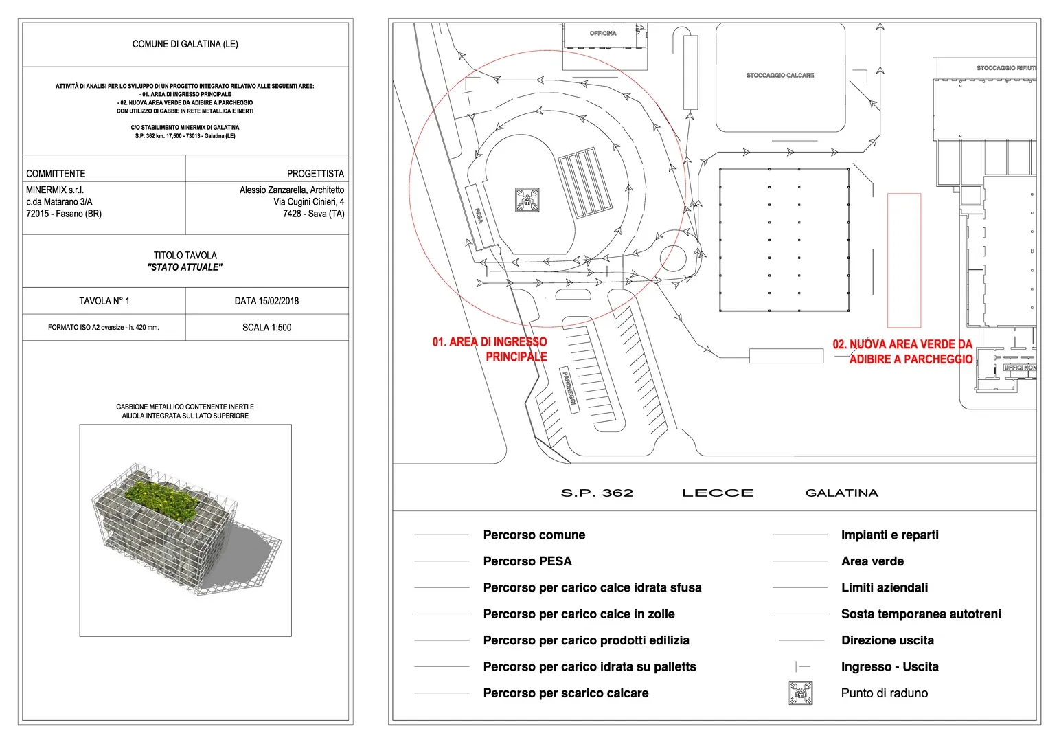 Consegnato il progetto di ri-organizzazione dell'area parcheggio della sede MINERMIX di Galatina (LE), azienda che si occupa di produzione di calce e inerti. L'architetto Zanzarella si è occupato di modellare e disporre in planimetria i gabbioni metallici acquistati dall'azienda per delimitare i transiti dei tir in uscita e in entrata in corrispondenza della vasta area di ingresso ai parcheggi.