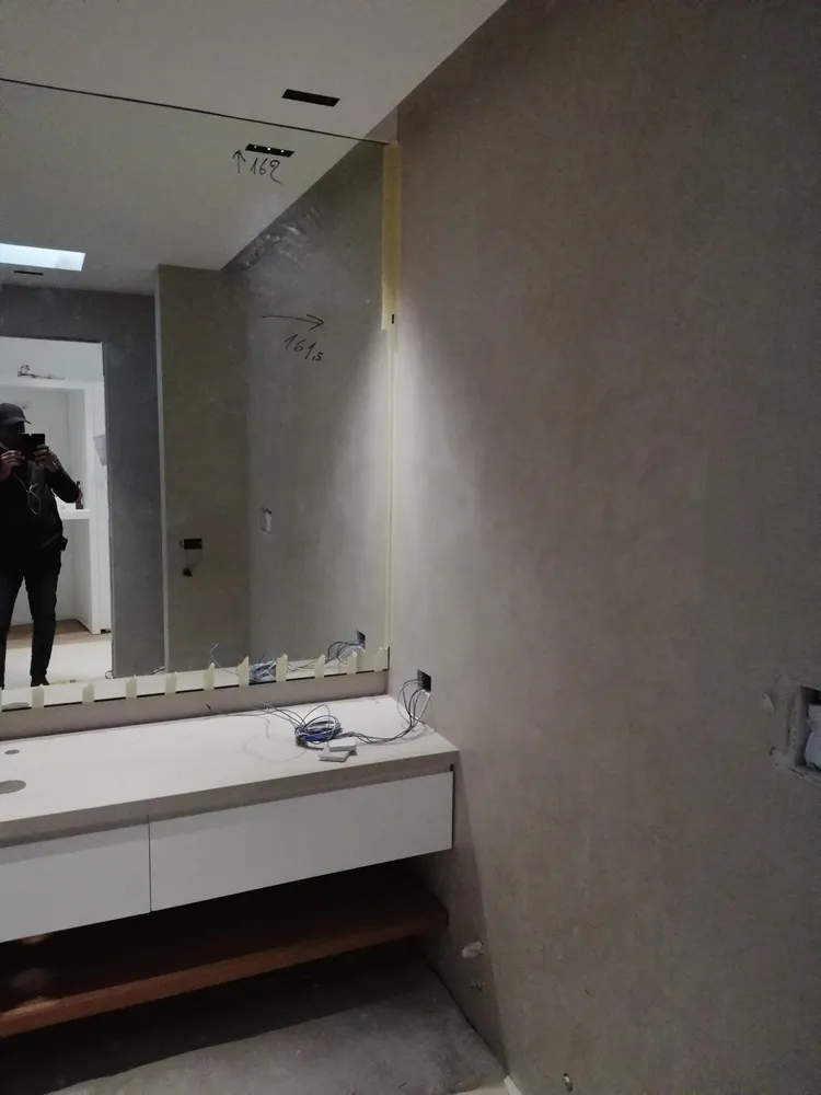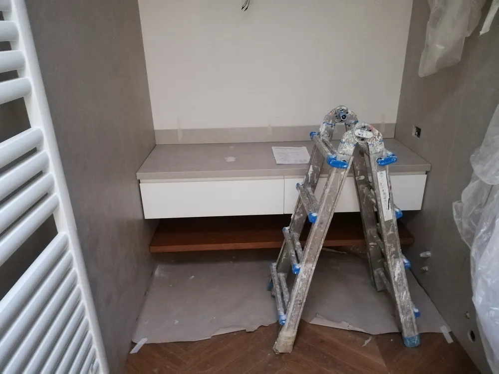 Dopo la posa del parquet (vedi LINK), in questo periodo i lavori si stanno concentrando nel bagno di ATTICO SABRINA. Da sempre la cliente ha voluto utilizzare il gres grande formato per rivestire le pareti del bagno a tutta altezza. In una prima bozza, di cui alcune immagini sono proposte di seguito, si era optato per una soluzione di grandi lastre effetto marmo. Ma alcune vicissitudini mi hanno condotto a scegliere un materiale di più facile approvvigionamento, comunque grande formato: si stratta della collezione FOKOS by Laminam, un materiale che simula l'effetto omogeneo del micro-cemento e che si accosta benissimo ai toni caldi del parquet.