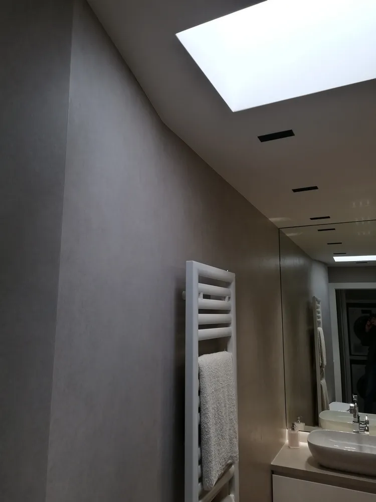 Gioca un ruolo importante anche la luce artificiale, determinata da faretti a incasso nel controsoffitto e da una gola con strip led in corrispondenza della parete dei sanitari.