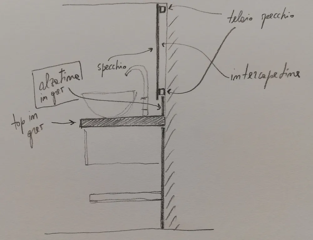 Il top lavabo è anch'esso realizzato in gres grande formato, della stessa tipologia di quello già usato sulle pareti, perfettamente sigillato sul suo perimetro. Al di sotto, i due cassetti in legno laccato e il piano impiallacciato in rovere come il parquet, sono integrati e creati "su misura".