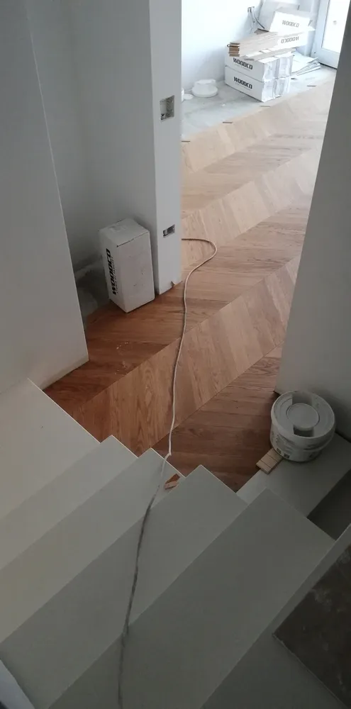 Oggi finalmente siamo in una situazione abbastanza avanzata, nonostante il covid e nonostante le difficoltà di movimento degli stessi operai all'interno del cantiere, per via degli spazi esigui. Dopo la preparazione del sottofondo, l'azienda Fidelia di Matera ha posato a "spina francese" il parquet DREAM ROVERE MIELE by Woodco. Un parquet dall'aspetto molto naturale, autentico; davvero elegantissimo.