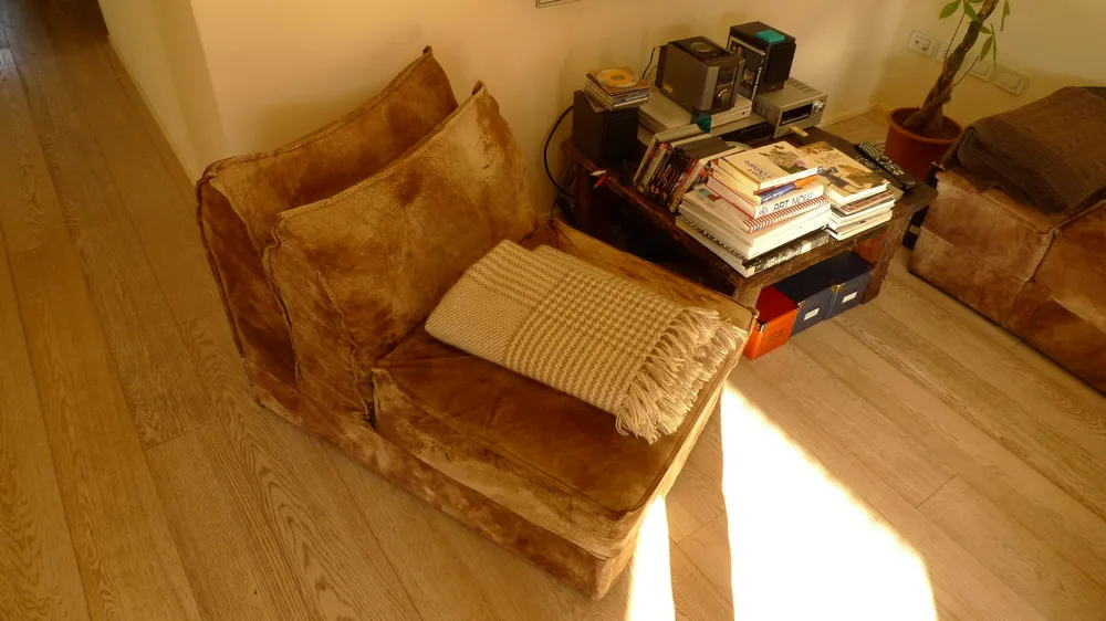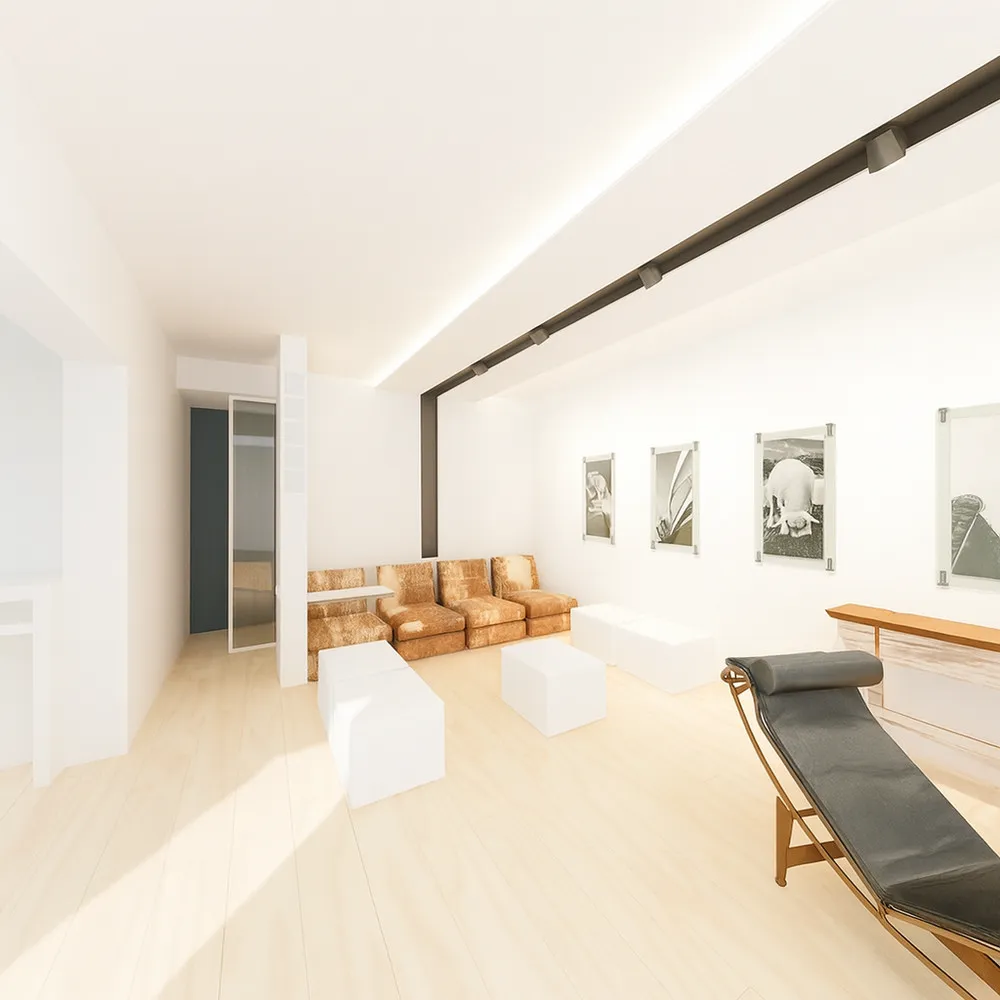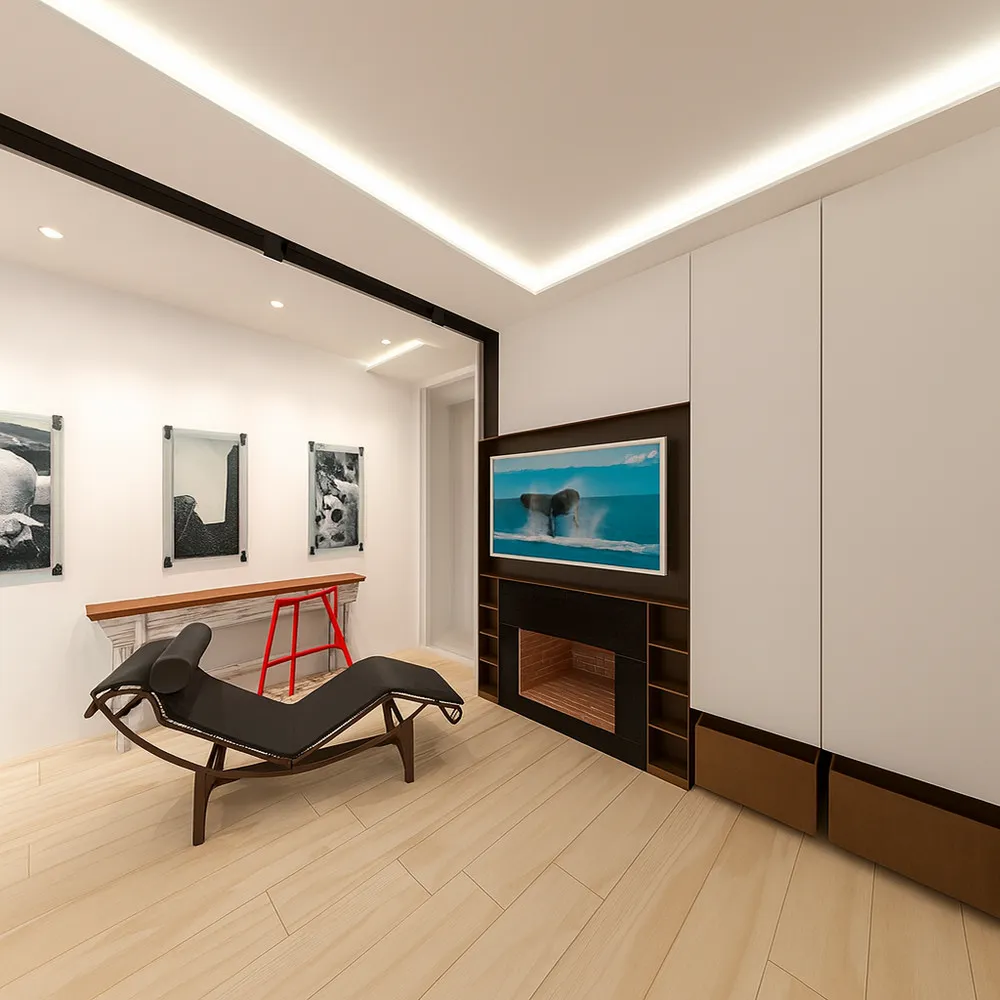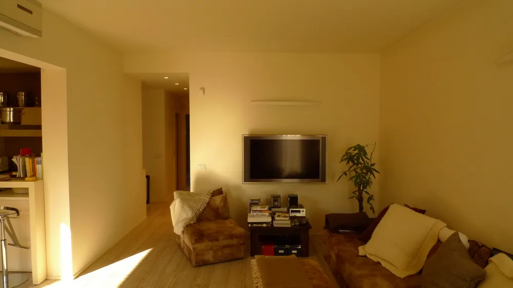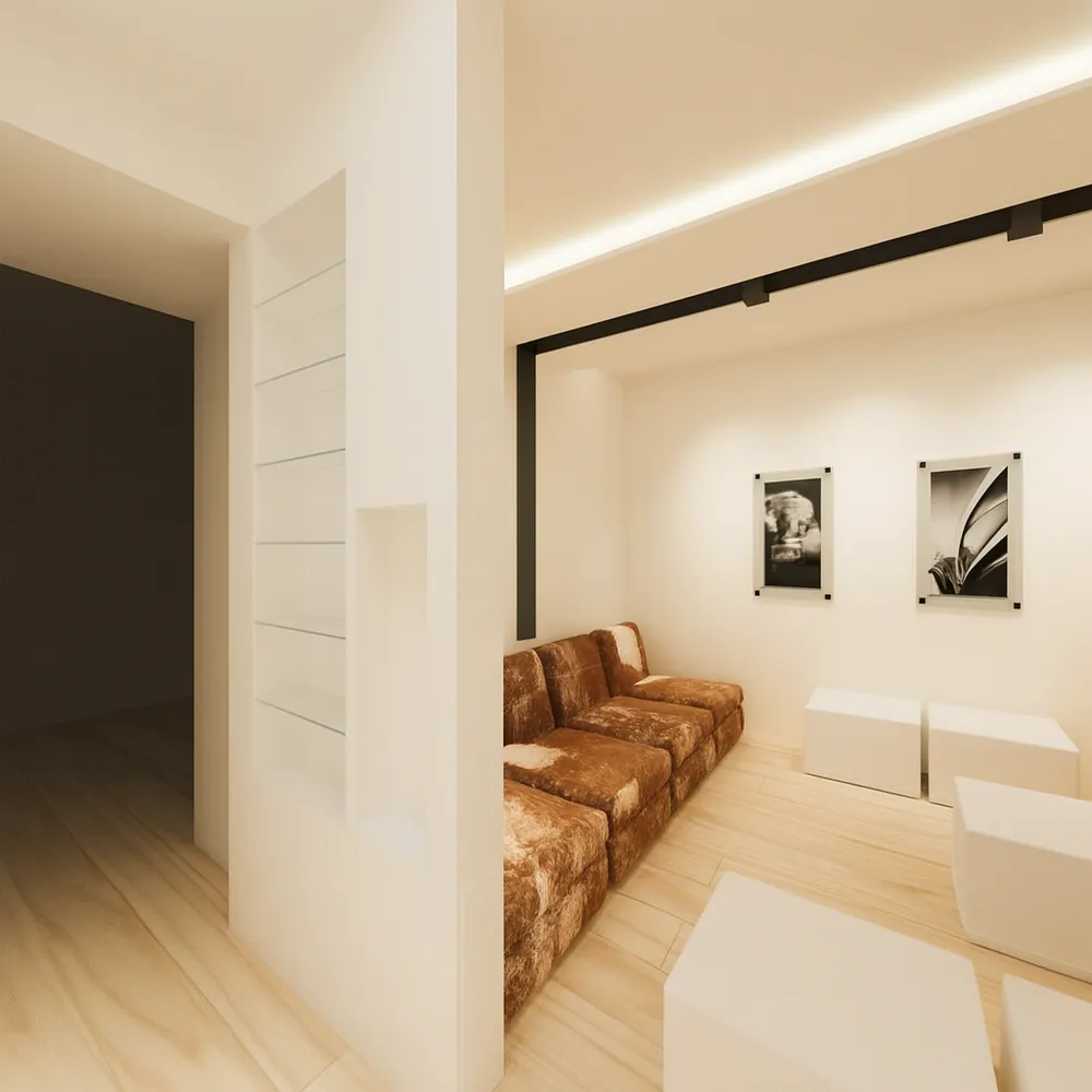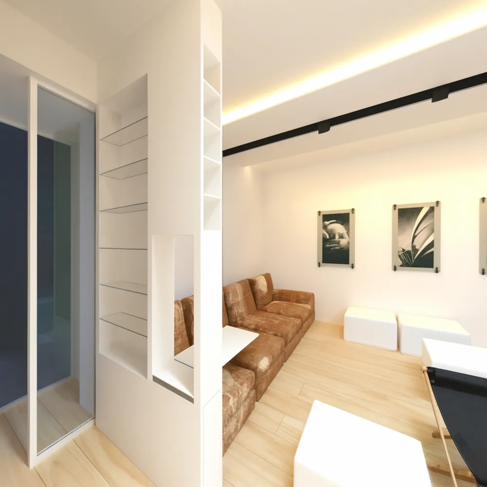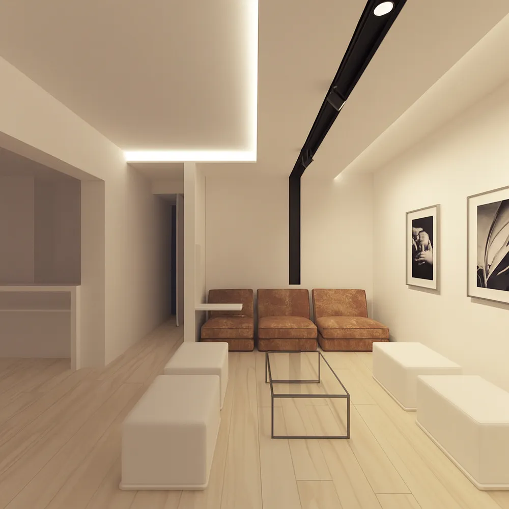 Proposta di riconfigurazione di un living per una abitazione a Fucecchio (FI). Caratteristica del concept ideato è la definizione di un segno che corre lungo l'intero controsoffitto e che è costituito dal profilo C094 prodotto da Viabizzuno, un estruso in alluminio che rende nullo lo spessore del cartongesso, facendolo apparire come una lamina sospesa. Lo stesso profilo, essendo elettrificato, funge da binario/cursore per l'inserimento di faretti orientabili che sembrano sospesi nel vuoto. Nella gallery anche alcune foto del living attuale con il divano in vitellino che la proprietaria, essendovi particolarmente affezionata, ha voluto assolutamente riutilizzare nel nuovo living.