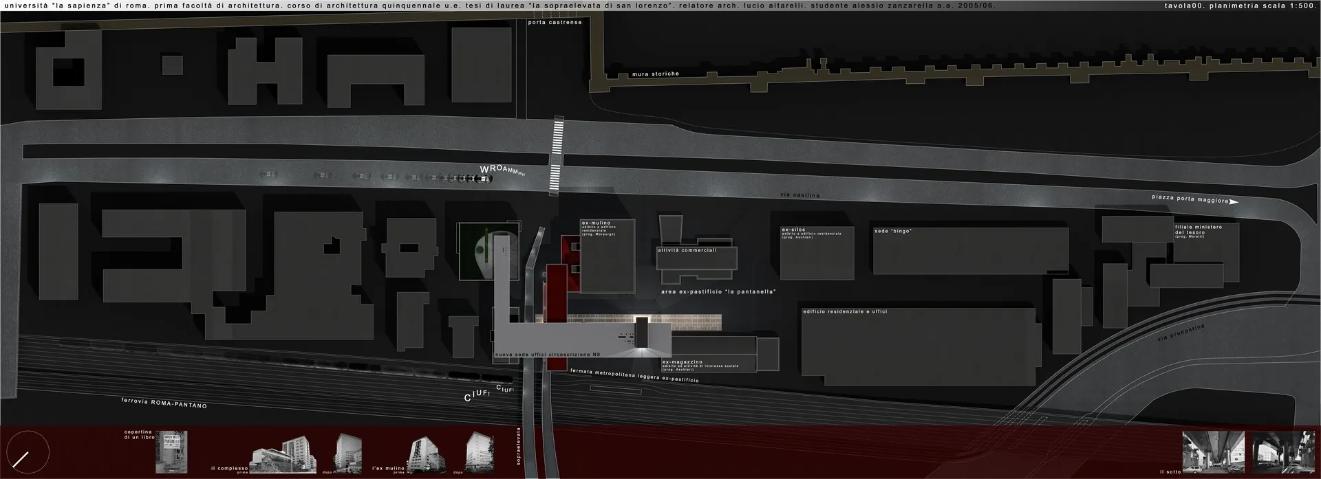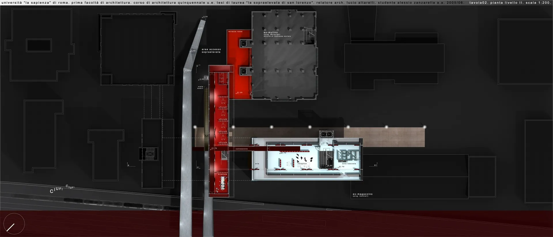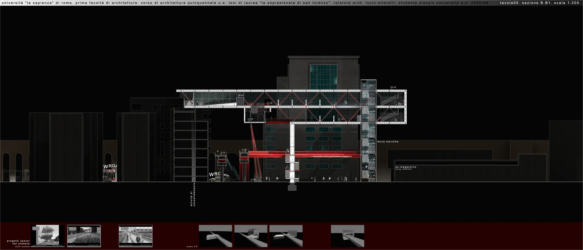 In questo contesto nasce la mia tesi, che tratta un tema che poi verrà approfondito nel progetto delle High Lines di New York dagli architetti Diller Scofidio + Renfro. Infatti il sistema architettonico è un impianto polifunzionale dedicato alle performance artistiche e alle arti in generale, localizzato a Roma sull'ingresso alla TANGENZIALE EST e collocato in una dimensione temporale futuribile in cui la famosa sopraelevata, elemento urbano spesso ricorrente nella storia del cinema post-moderno italiano, è diventata pedonale ed è percorsa a piedi solo per ammirare il dolce panorama della città eterna. L'edificio pone le sue fondamenta nell'ingresso alla tangenziale da Porta Maggiore, quasi "appoggiandosi" sugli edifici ormai un po’ usurati da un esistenzialismo urbano depresso, spezzando la continuità dell'asfalto con la rete della viabilità romana e rendendola raggiungibile solo a piedi per mezzo dell'ascensore o del vano scala.