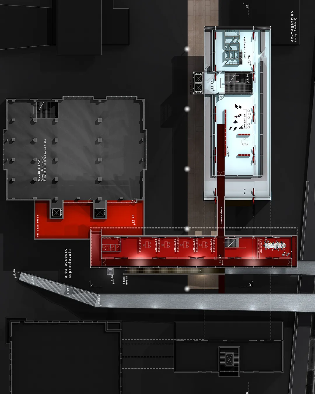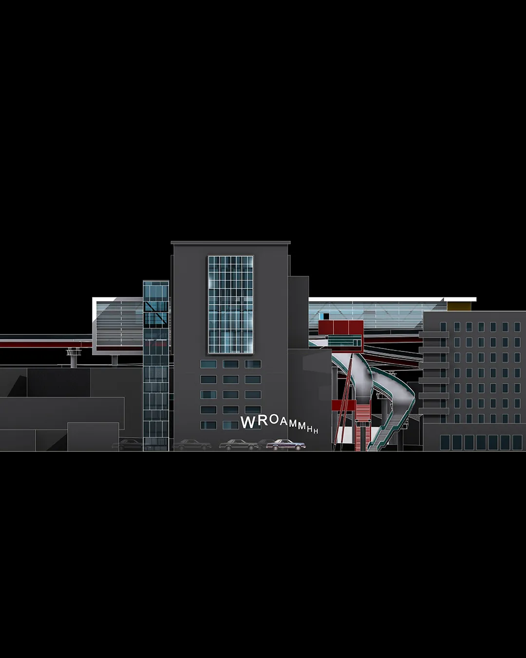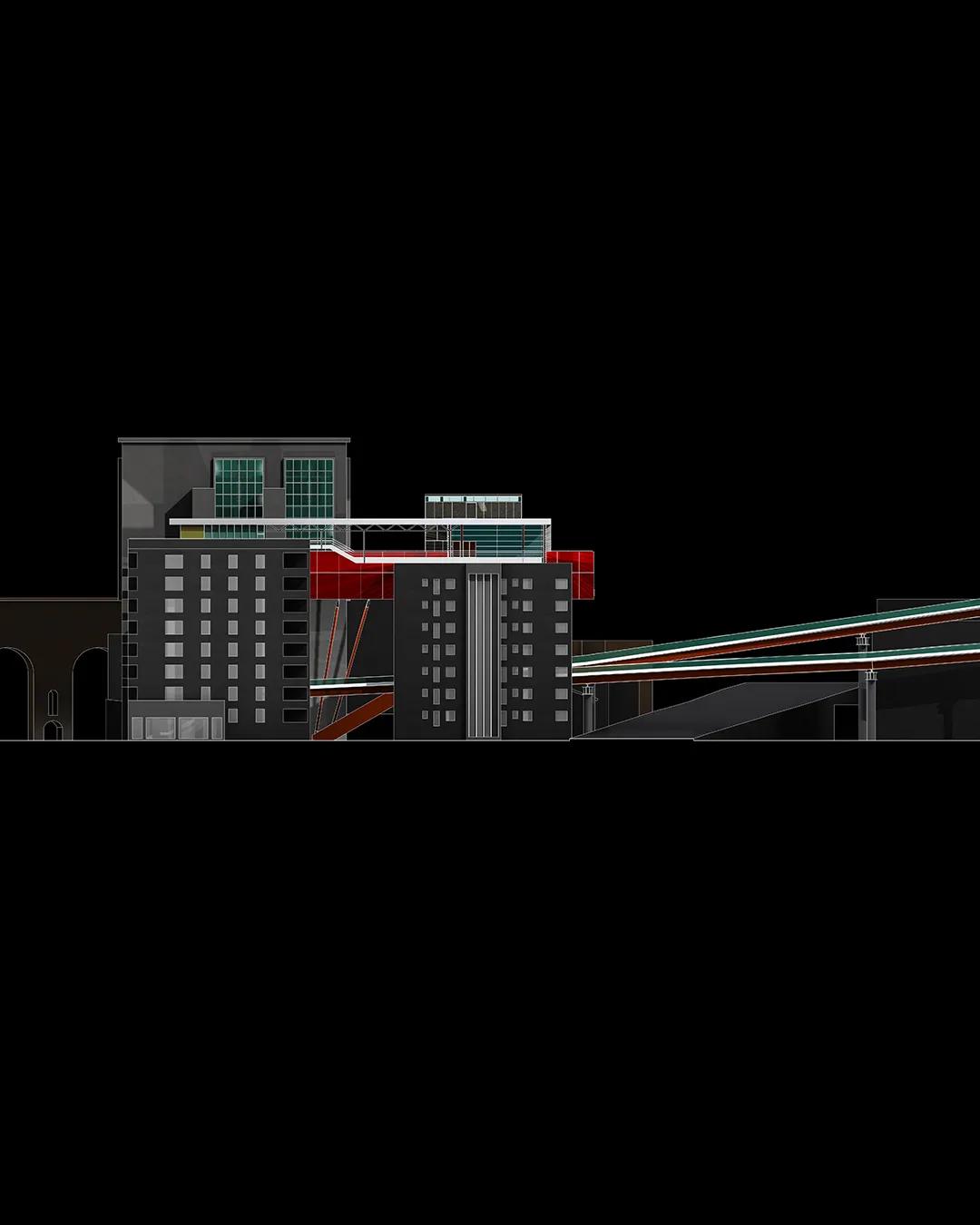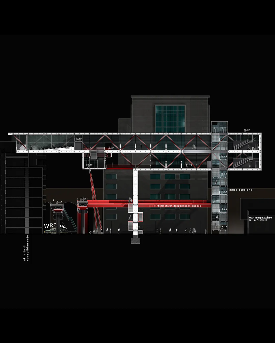 In questo contesto nasce la mia tesi, che tratta un tema che poi verrà approfondito nel progetto delle High Lines di New York dagli architetti Diller Scofidio + Renfro. Infatti il sistema architettonico è un impianto polifunzionale dedicato alle performance artistiche e alle arti in generale, localizzato a Roma sull'ingresso alla TANGENZIALE EST e collocato in una dimensione temporale futuribile in cui la famosa sopraelevata, elemento urbano spesso ricorrente nella storia del cinema post-moderno italiano, è diventata pedonale ed è percorsa a piedi solo per ammirare il dolce panorama della città eterna. L'edificio pone le sue fondamenta nell'ingresso alla tangenziale da Porta Maggiore, quasi "appoggiandosi" sugli edifici ormai un po’ usurati da un esistenzialismo urbano depresso, spezzando la continuità dell'asfalto con la rete della viabilità romana e rendendola raggiungibile solo a piedi per mezzo dell'ascensore o del vano scala.