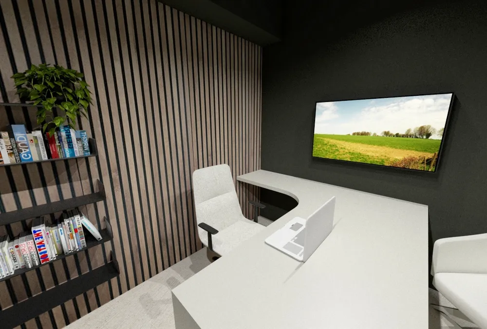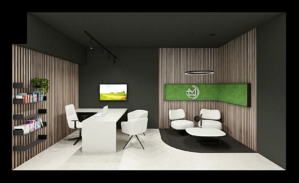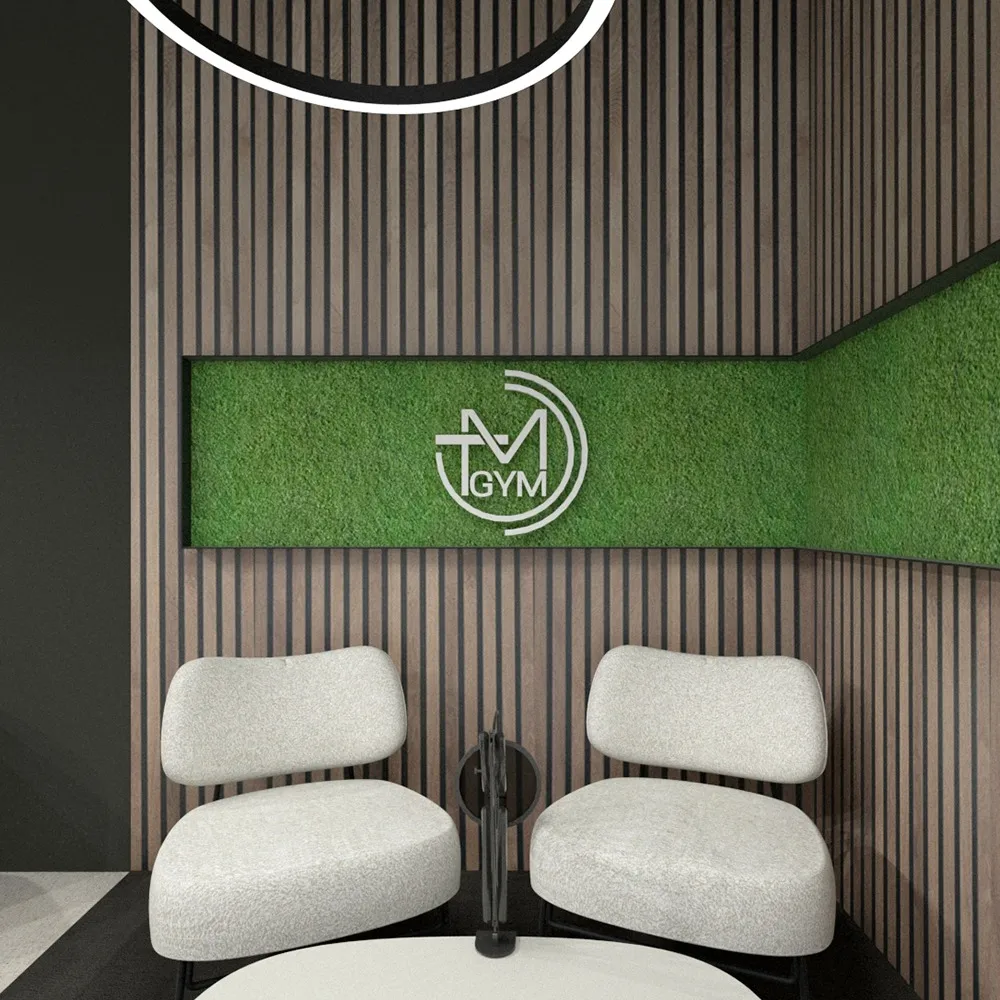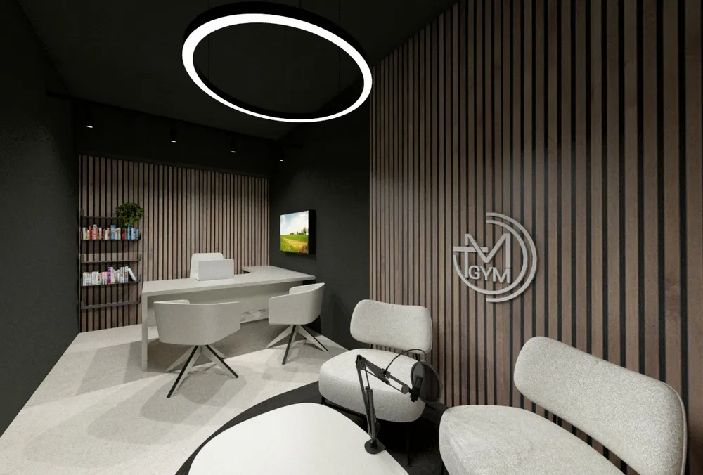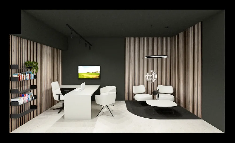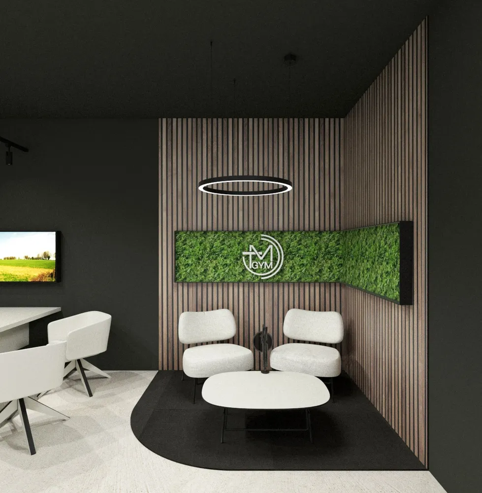 Presentazione di una proposta dello spazio "COACHING", interno alla palestra TMGYM, i cui lavori sono stati completati ad aprile di quest'anno (vedi LINK per scoprire il progetto completo). Lo spazio "COACHING" che costituisce l'ufficio privato di Tony Mancino, proprietario della palestra, è l'unico ambiente in cui ancora non sono stati effettuati lavori, in attesa di definirne meglio la sua funzione. Avendo una metratura piuttosto limitata, ho tentato di dilatare lo spazio sulla direttrice verticale, rivestendo le pareti a tutta altezza con i wood panels by Woodupp, già utilizzati anche nelle altre aree della palestra, per determinare una certa continuità stilistica; così come la pavimentazione in resina taupe-chiaro, anch'essa già adoperata nelle altre aree. Caratteristiche di questo piccolo spazio ufficio sono: l'inserimento di una superficie trattata a "giardino verticale", tanto voluta dal cliente; la creazione di una scrivania su misura illuminata con binario elettrificato; infine l'angolo podcast, con una sospensione led "a corona", utile per le dirette social.