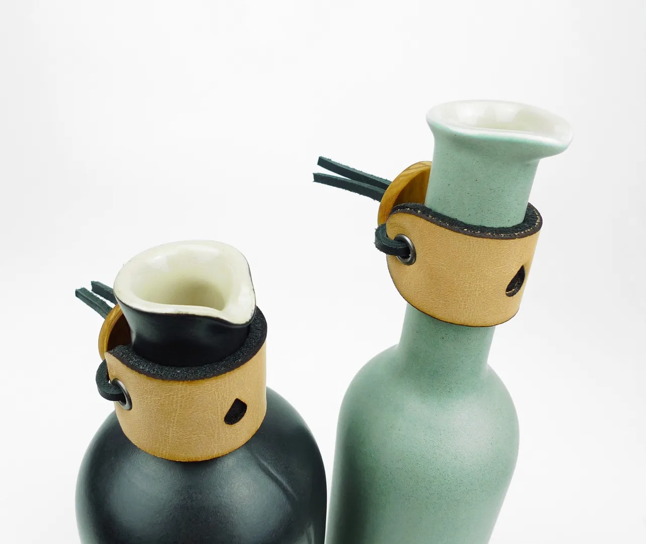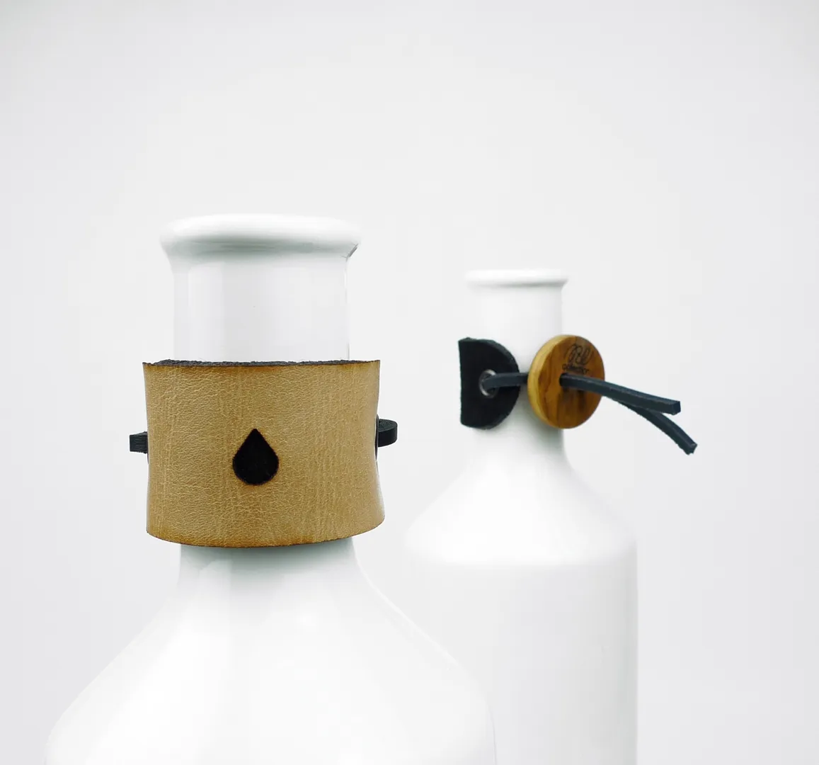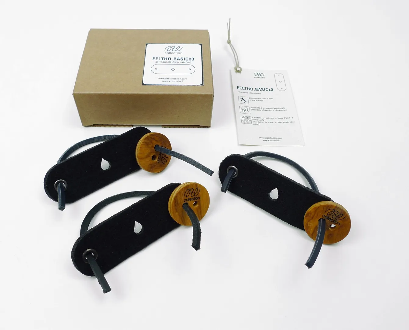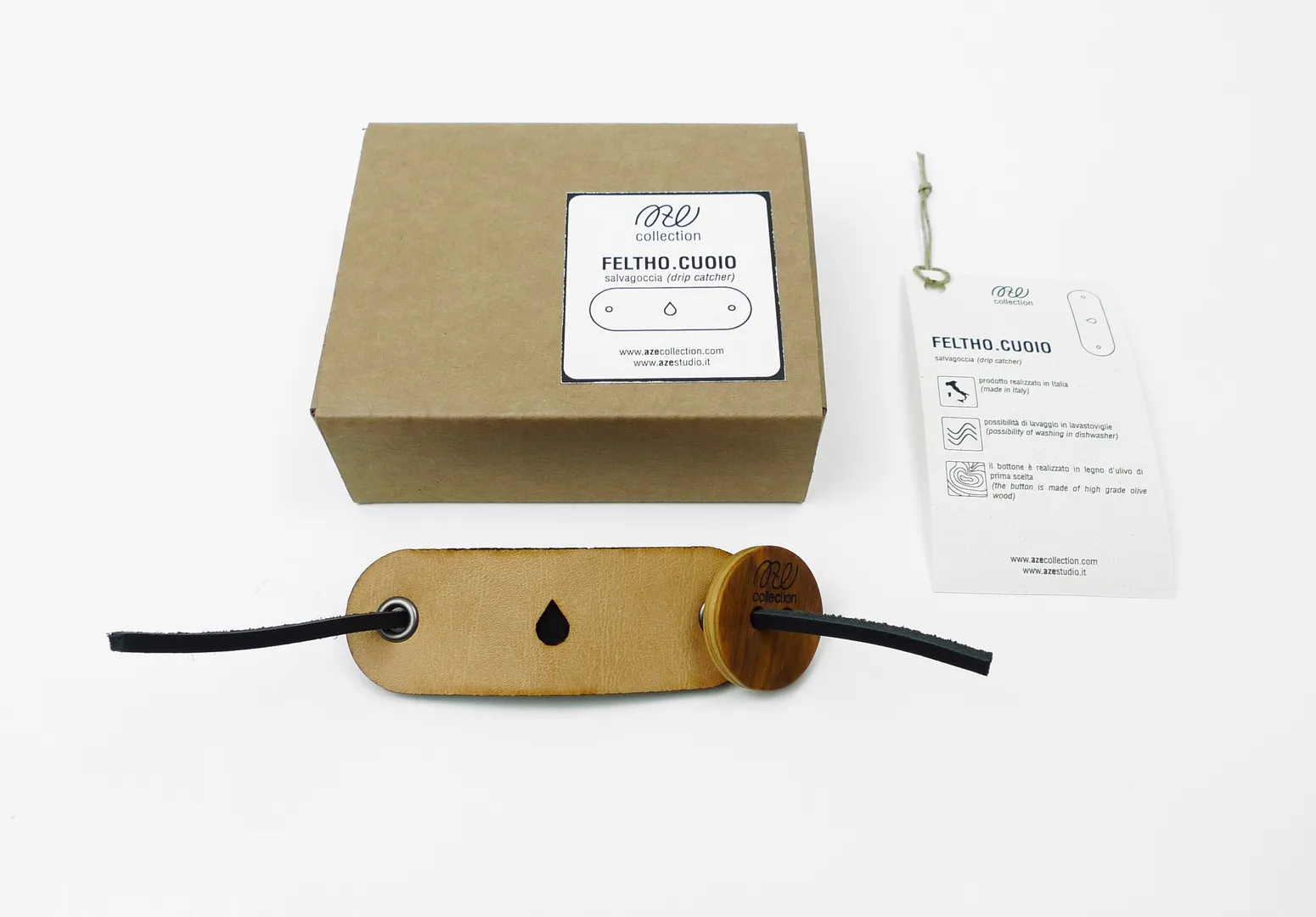 “FELTHO” è un salva-goccia, in accoppiato feltro + cuoio, facile da applicare su qualsiasi collo di bottiglia (anche sul collo della tipica “bordolese” da vino) e utile per assorbire anche l’ultima antipatica gocciolina. È dotato di laccetti, anch’essi in cuoio, passanti in una simpatica fibbia in legno d’ulivo che funge da serra-nodo e si può acquistare anche senza la mascherina in cuoio, per un utilizzo più easy.