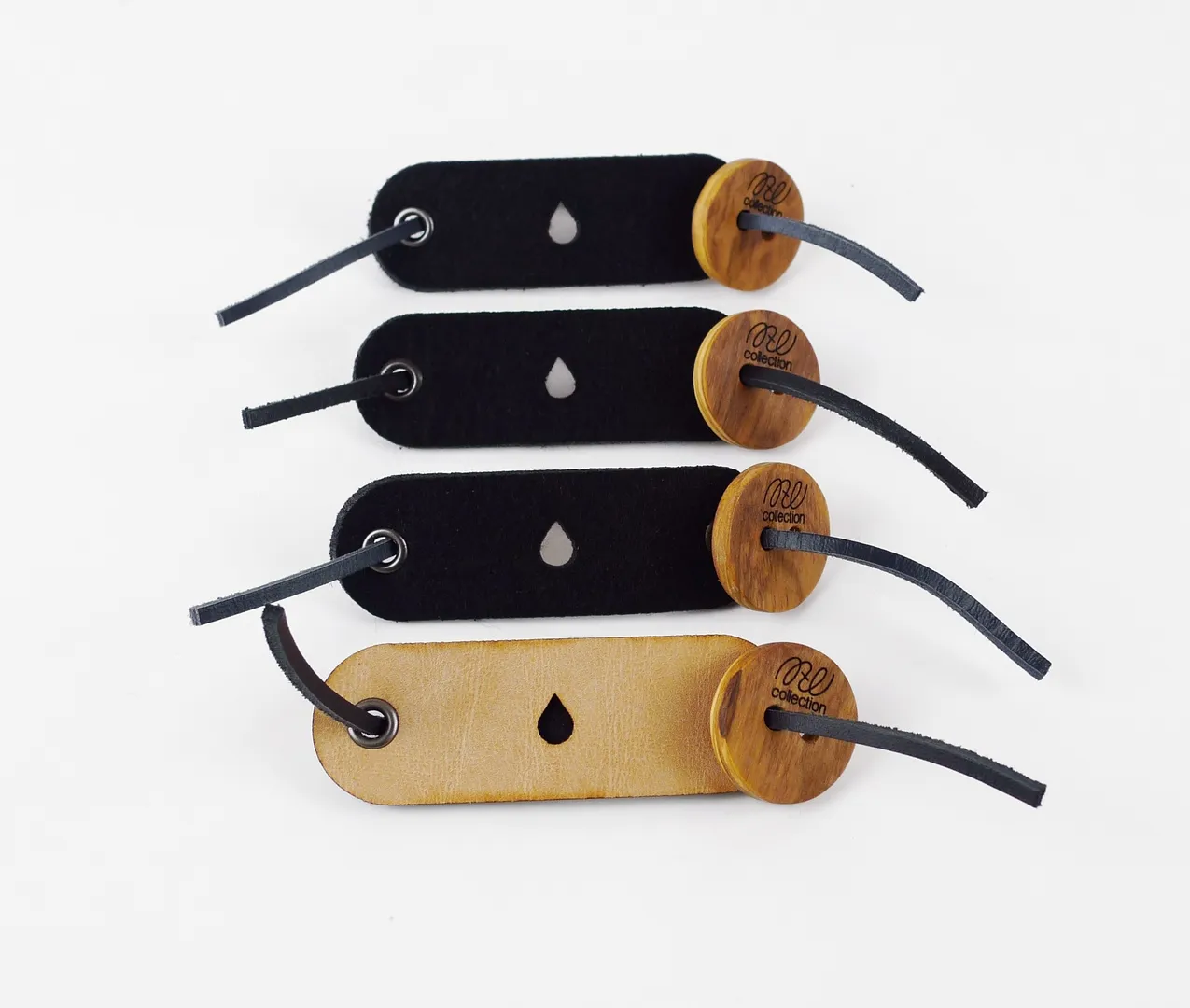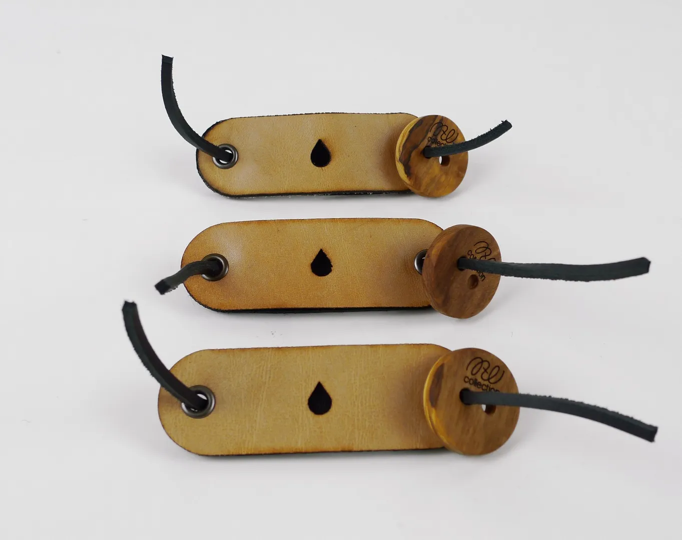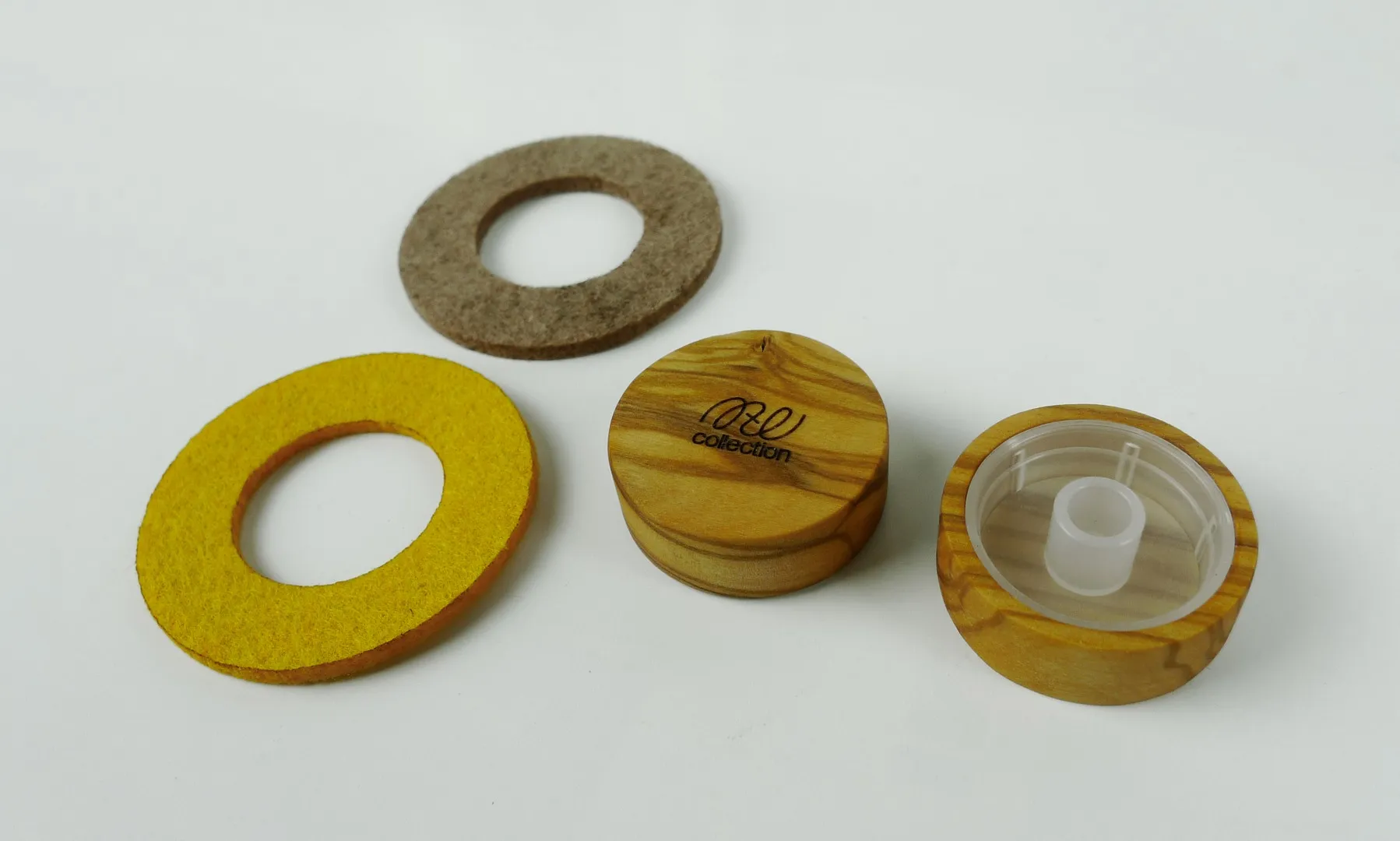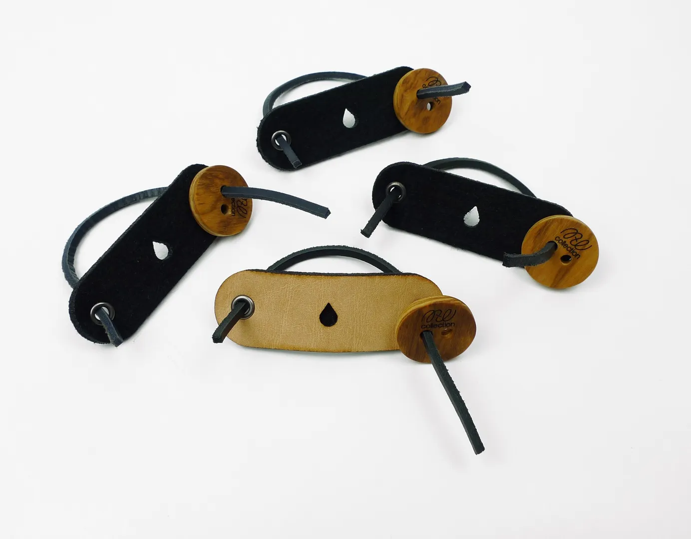 “FELTHO” è un salva-goccia, in accoppiato feltro + cuoio, facile da applicare su qualsiasi collo di bottiglia (anche sul collo della tipica “bordolese” da vino) e utile per assorbire anche l’ultima antipatica gocciolina. È dotato di laccetti, anch’essi in cuoio, passanti in una simpatica fibbia in legno d’ulivo che funge da serra-nodo e si può acquistare anche senza la mascherina in cuoio, per un utilizzo più easy.