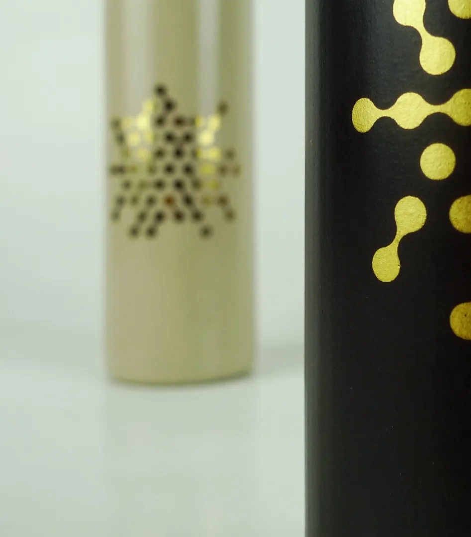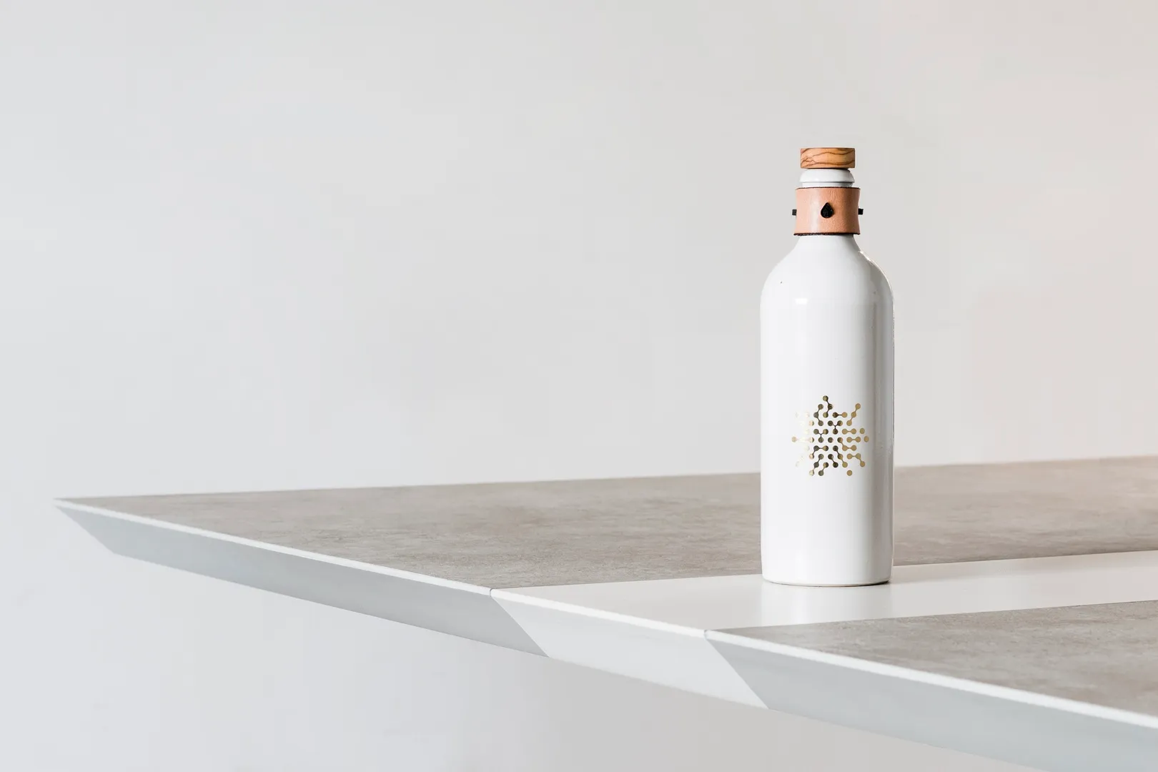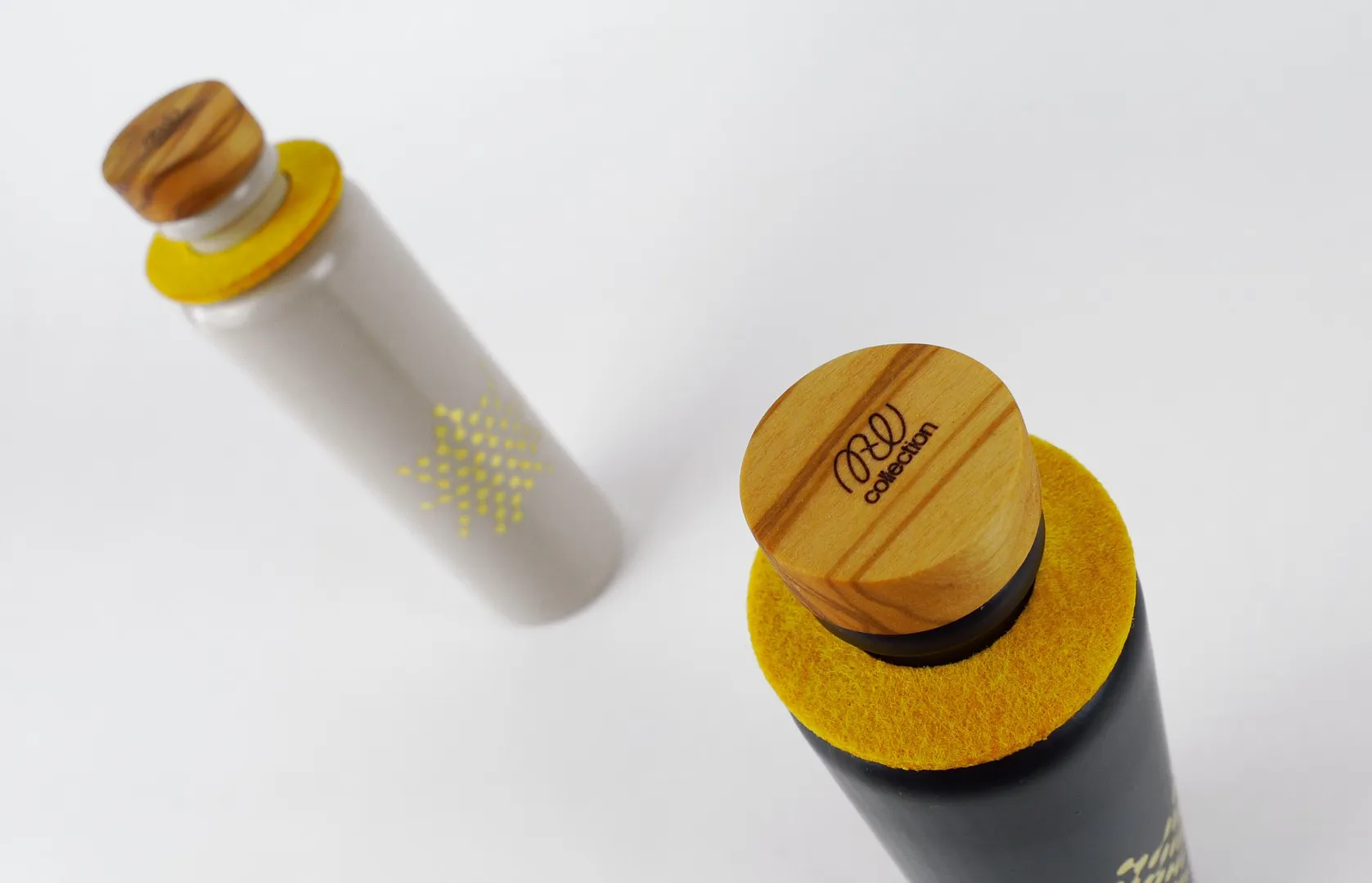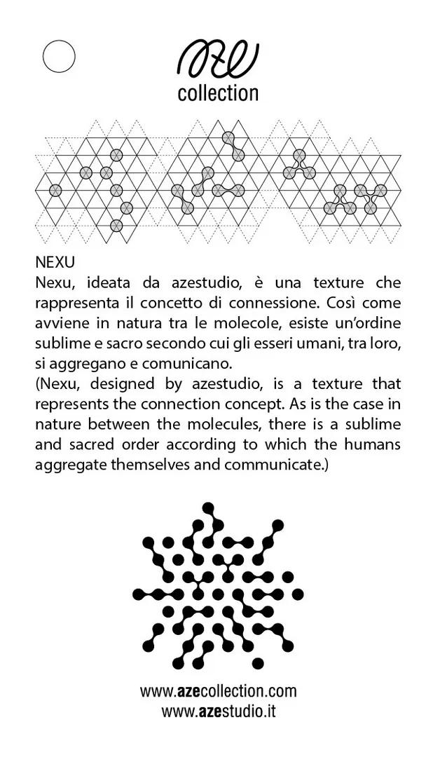 Un elemento caratteristico di queste collezioni di bottiglie è la decalcomania “NEXU” impressa a caldo con finitura oro, che ho realizzato con l’idea di rappresentare uno spargimento molecolare del “liquido” inteso come “portatore” di bellezza e “pugliesità”. Le bottiglie, vendute in un packaging finitura kraft, sono dotate di collo calibrato in modo da aderire perfettamente ad un tappo dosatore in anima di silicone il cui cappuccio è rivestito in massello di legno d’ulivo. Il packaging oltre alla bottiglia comprende anche un comodo dischetto in feltro salva-goccia, sagomato perfettamente sulla misura del collo.