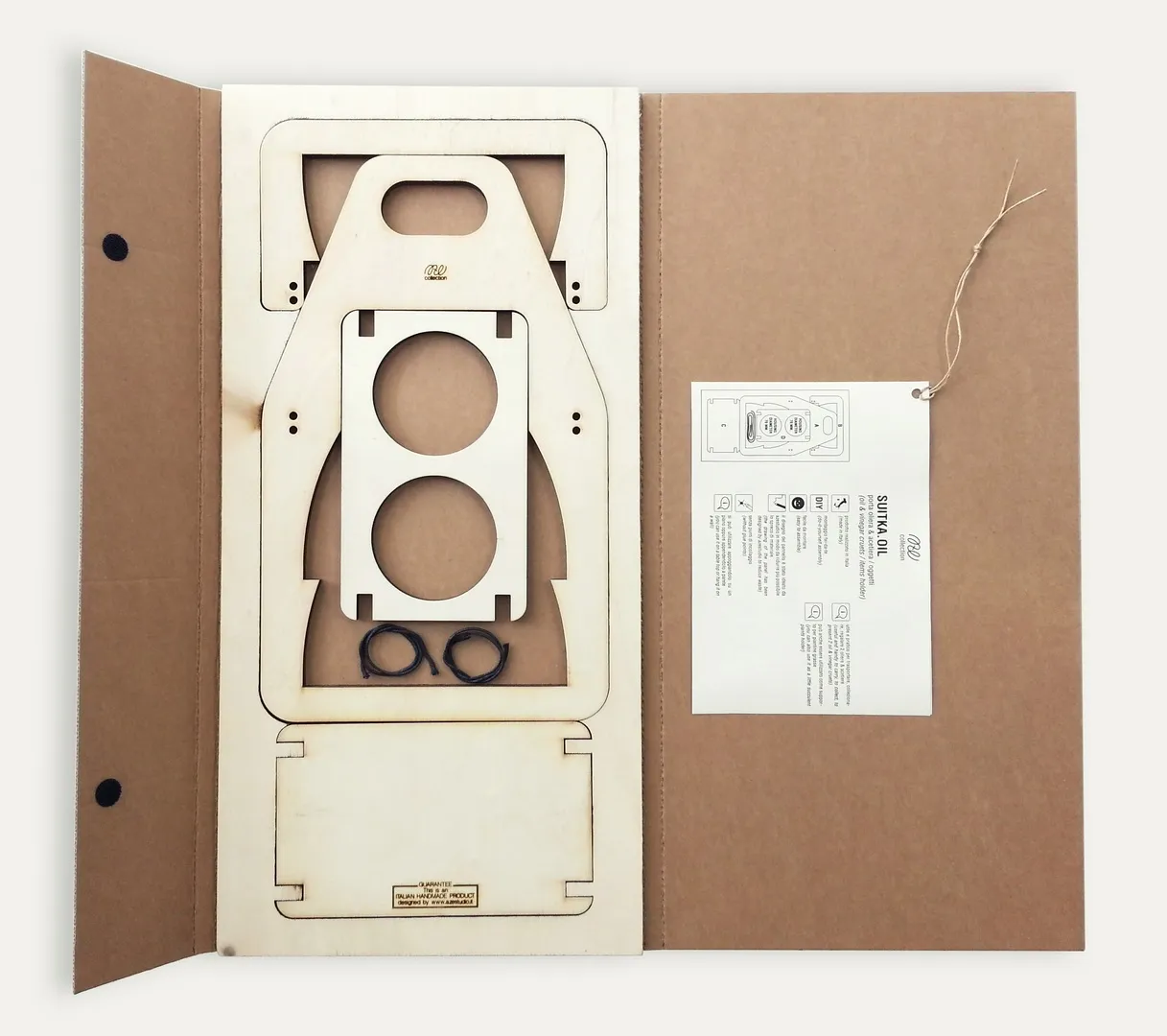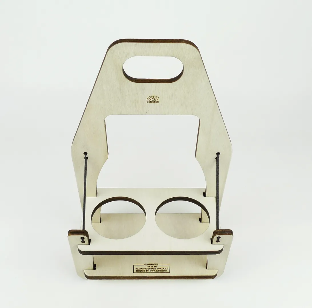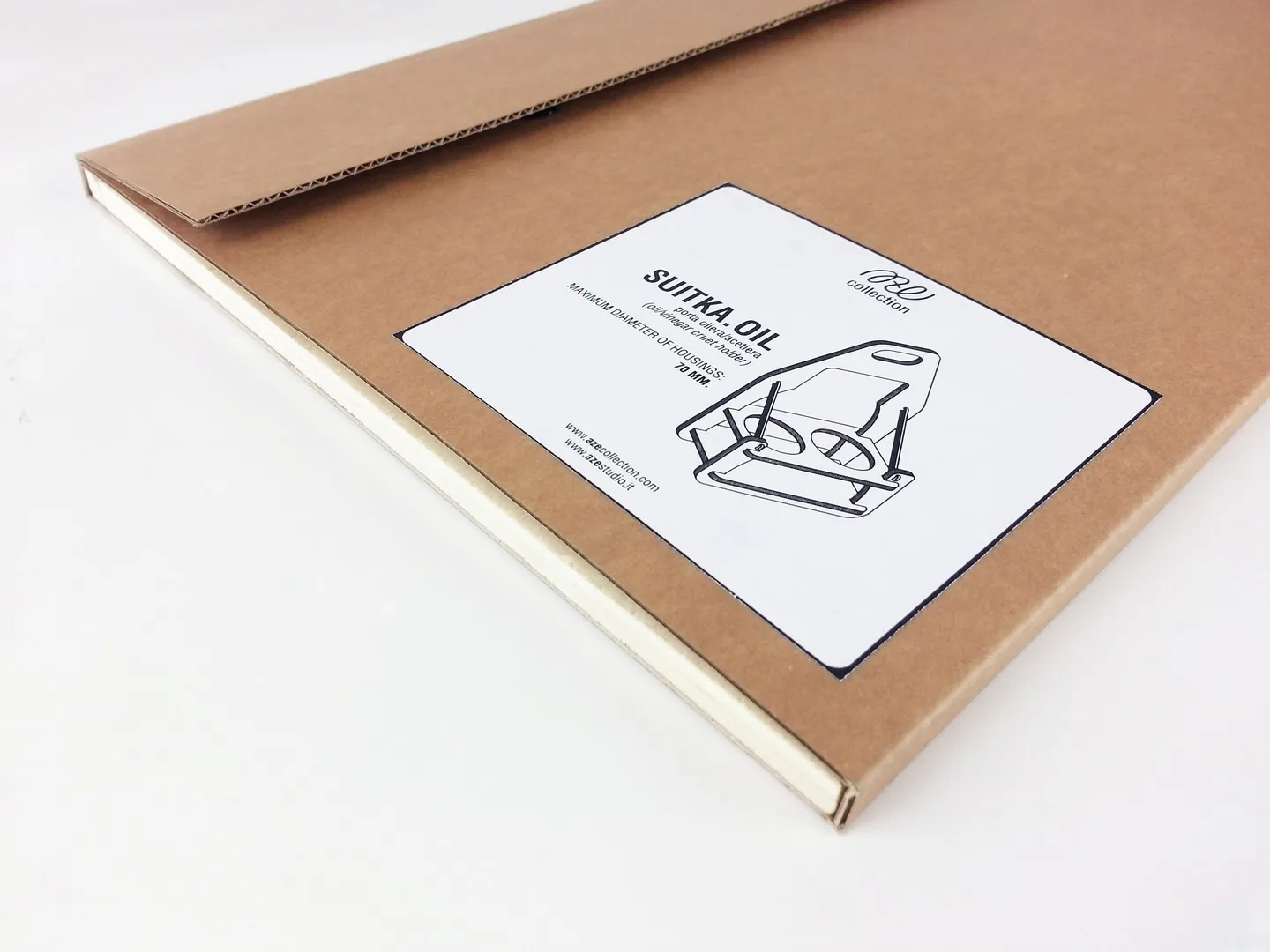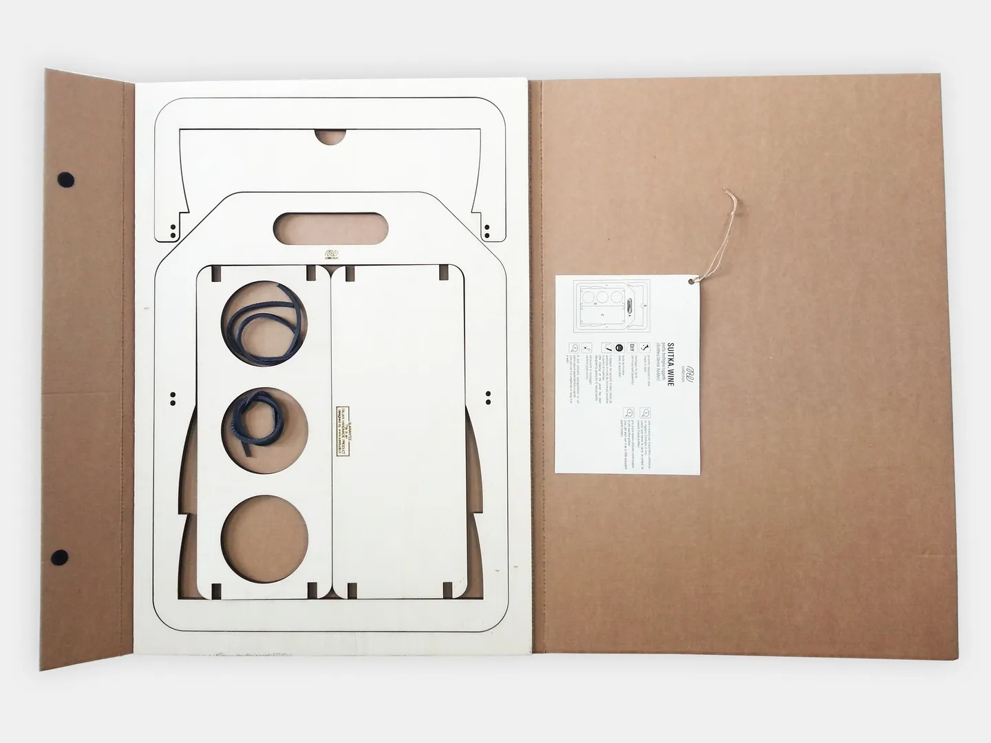 Quando ho ideato "SUITKA" ho pensato a tutte le occasioni in cui mi sono trovato a dover regalare 3 buone bottiglie di vino, senza sapere come poterle presentare, se non con la solita scatola di cartone che una volta aperta è pressoché inutilizzabile. Così nasce questo progetto, dall'esigenza appunto di voler trovare un sistema carino, efficiente, comunque a basso costo, per trasportare al sicuro delle bottiglie. "SUITKA" è una suitcase per trasportare, grazie al suo comodo manico, elementi cilindrici: quindi bottiglie, piccoli vasi oppure riviste arrotolate; ma proprio grazie alla feritoia del manico, "SUITKA" può anche essere appesa a parete diventando un porta-oggetti funzionale non solo per un utilizzo temporaneo come "trasportino". Così come "SKERU", anche "SUITKA" è stata disegnata sfruttando al massimo la dimensione originaria del materiale multistrato di betulla spessore 6 mm. Infatti anche in questo caso non vi è alcun spreco di materiale, se consideriamo che anche la sagoma del pannello restante dal taglio a laser, una volta incollata nel packaging, garantisce una trasportabilità impeccabile dell'oggetto, diventandone l'alloggiamento. Anche "SUITKA" è un oggetto montabile fai-da-te incastrando i vari pezzi che lo compongono e tenendoli insieme grazie a dei laccetti in cuoio in dotazione anch'essi all'interno della scatola.