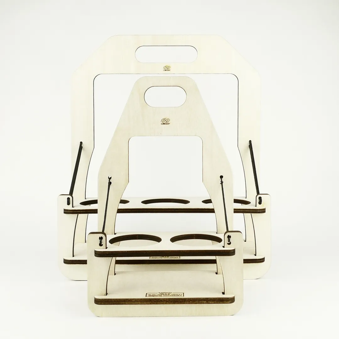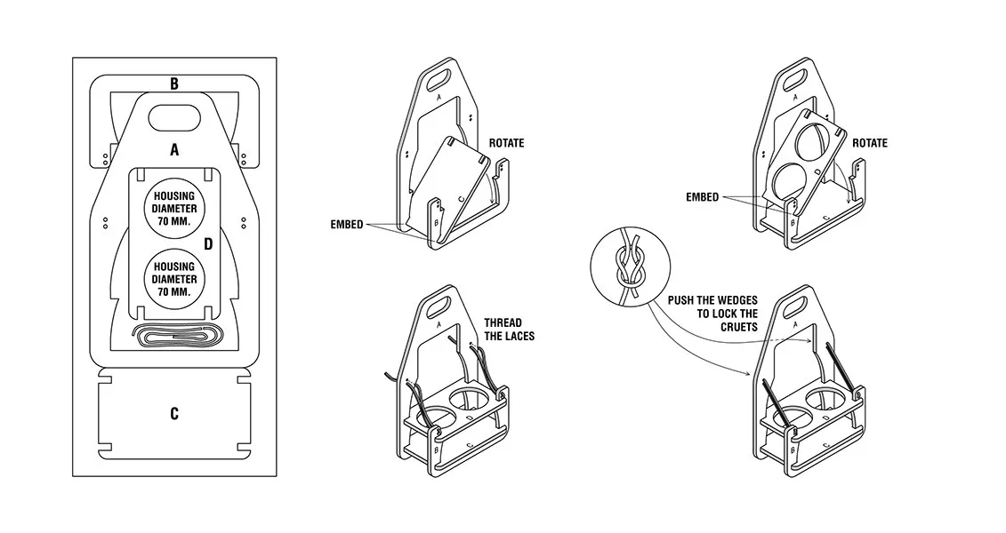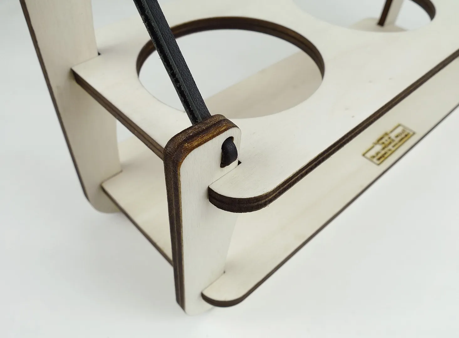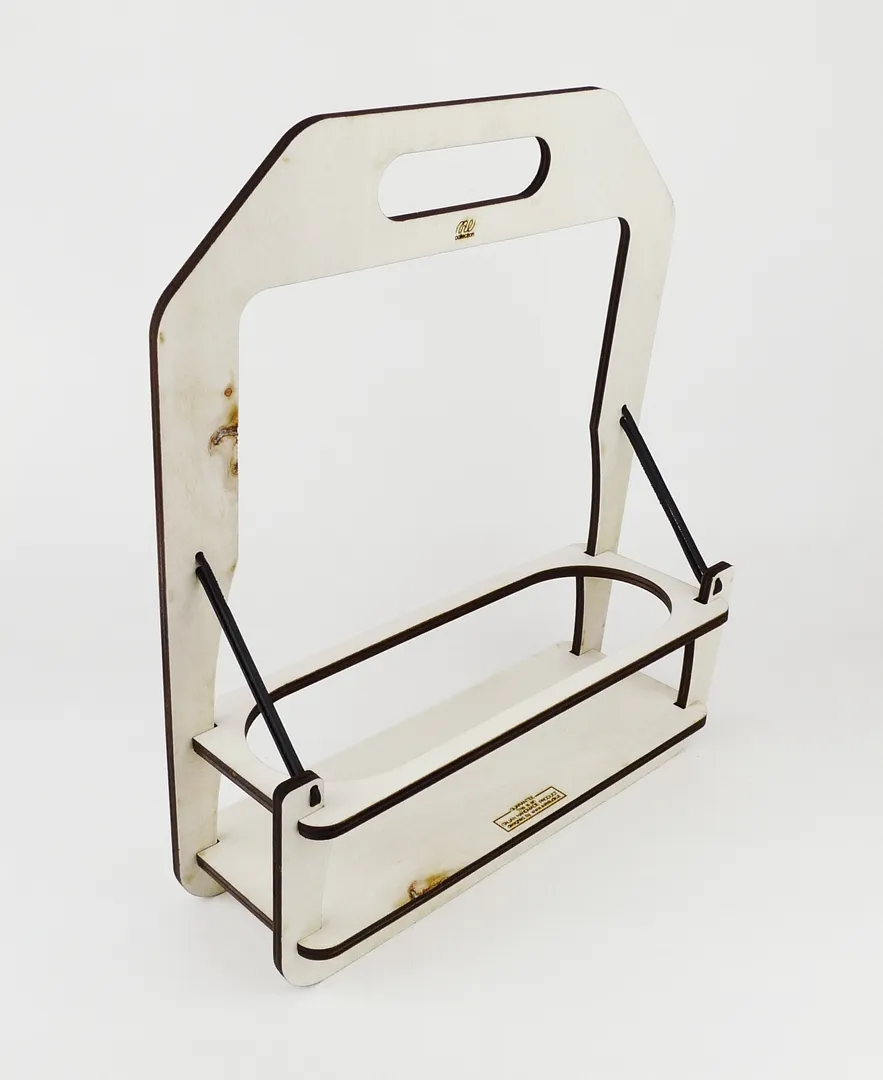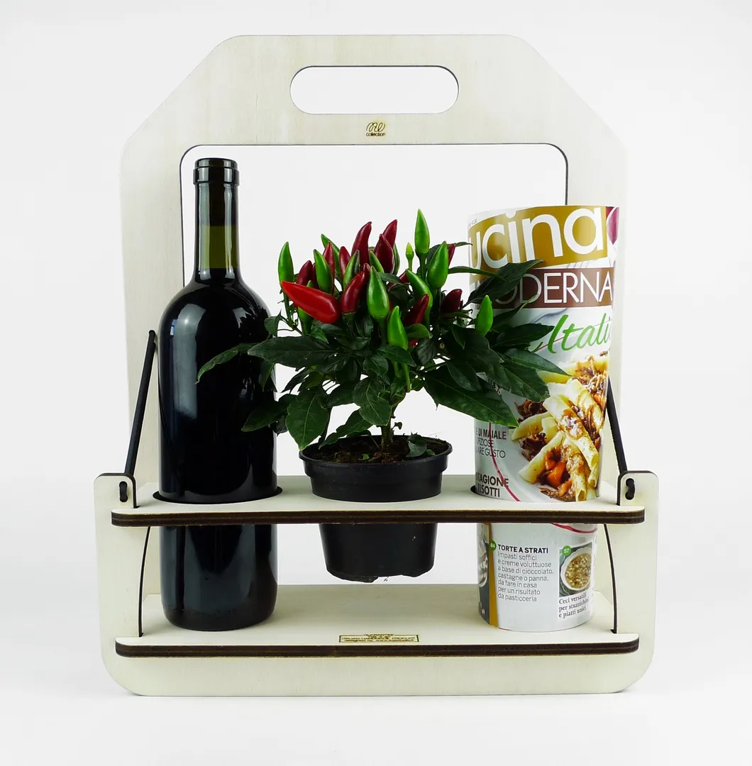 Quando ho ideato "SUITKA" ho pensato a tutte le occasioni in cui mi sono trovato a dover regalare 3 buone bottiglie di vino, senza sapere come poterle presentare, se non con la solita scatola di cartone che una volta aperta è pressoché inutilizzabile. Così nasce questo progetto, dall'esigenza appunto di voler trovare un sistema carino, efficiente, comunque a basso costo, per trasportare al sicuro delle bottiglie. "SUITKA" è una suitcase per trasportare, grazie al suo comodo manico, elementi cilindrici: quindi bottiglie, piccoli vasi oppure riviste arrotolate; ma proprio grazie alla feritoia del manico, "SUITKA" può anche essere appesa a parete diventando un porta-oggetti funzionale non solo per un utilizzo temporaneo come "trasportino". Così come "SKERU", anche "SUITKA" è stata disegnata sfruttando al massimo la dimensione originaria del materiale multistrato di betulla spessore 6 mm. Infatti anche in questo caso non vi è alcun spreco di materiale, se consideriamo che anche la sagoma del pannello restante dal taglio a laser, una volta incollata nel packaging, garantisce una trasportabilità impeccabile dell'oggetto, diventandone l'alloggiamento. Anche "SUITKA" è un oggetto montabile fai-da-te incastrando i vari pezzi che lo compongono e tenendoli insieme grazie a dei laccetti in cuoio in dotazione anch'essi all'interno della scatola.