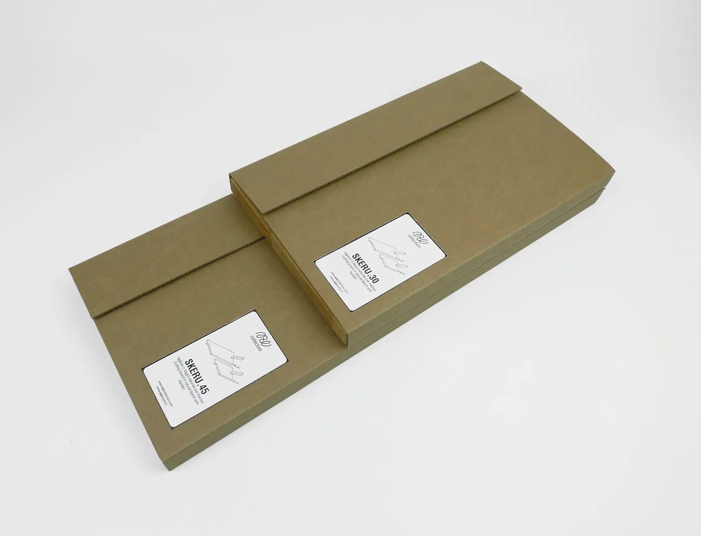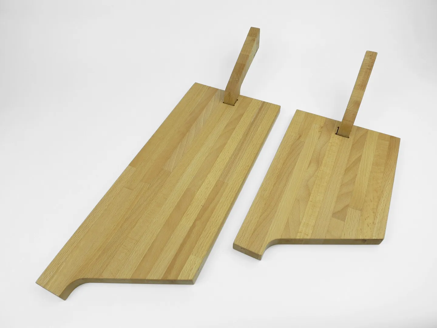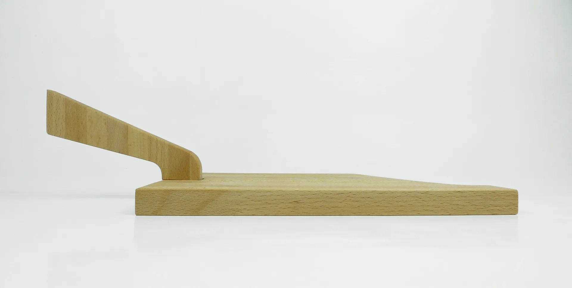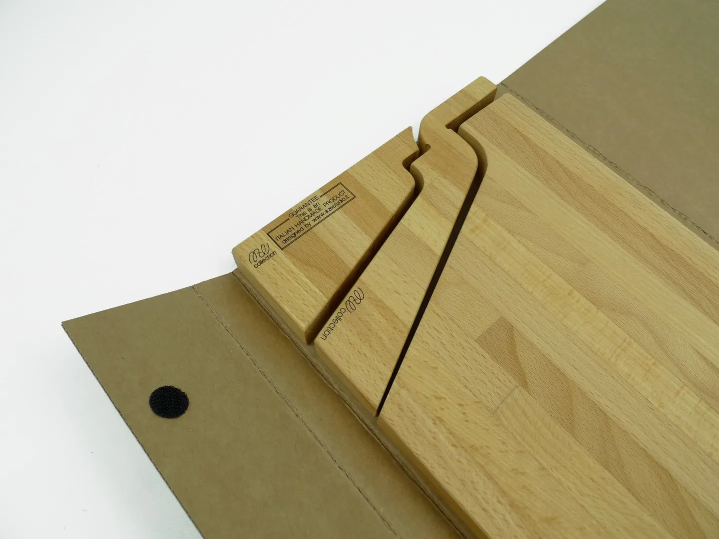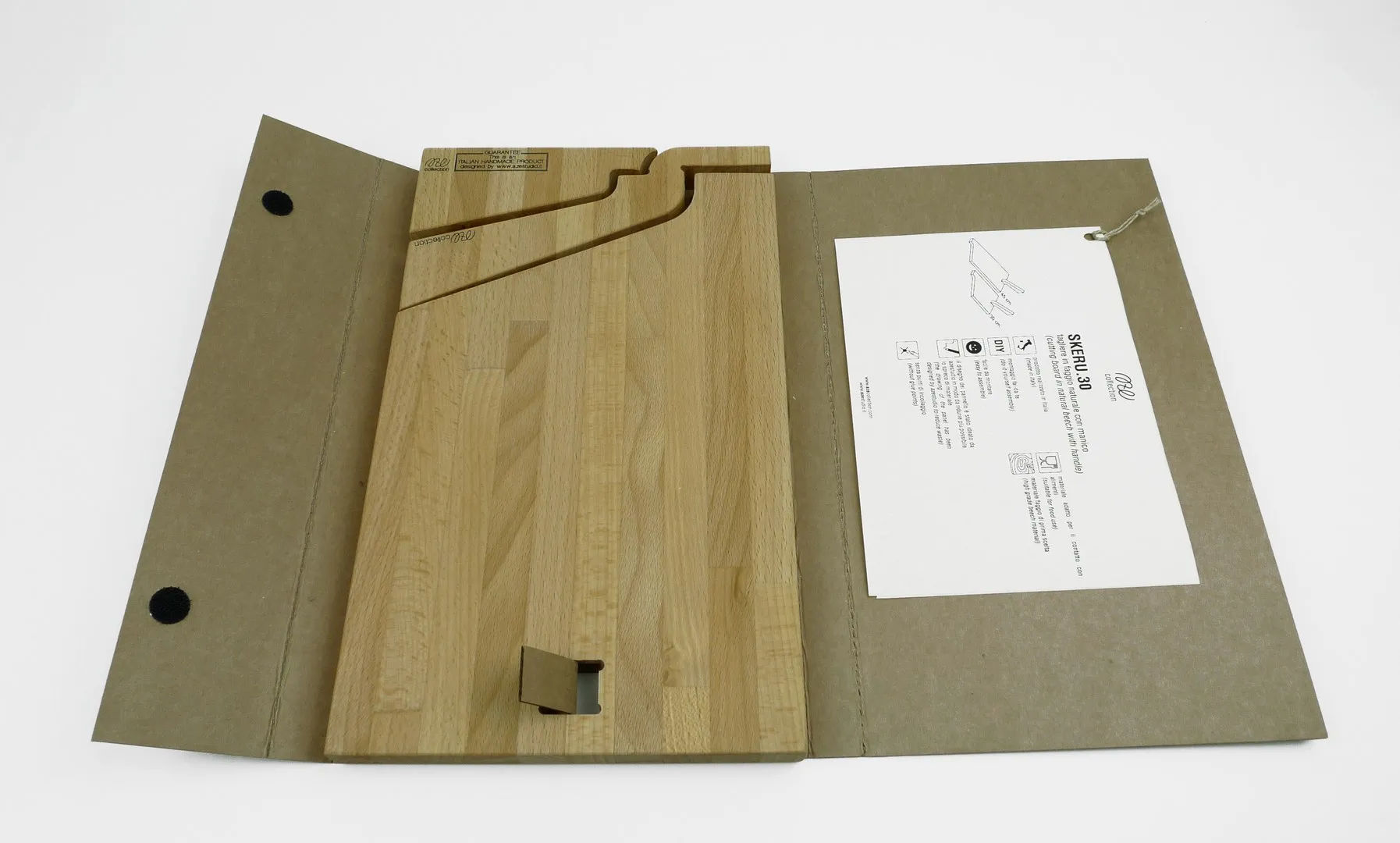 "SKERU" è un tagliere provvisto di manico, che è stato da me ideato con il presupposto di produrre entrambe le forme (il piano orizzontale + il manico) da un unico massello di legno da 3 cm. Concepito in 2 misure da 30 e 45 cm, "SKERU" è lavorato a controllo numerico e ha una linea di produzione che prevede uno spreco quasi nullo, nel senso che già il pannello di legno lamellare all'origine è sezionato in modo da sfruttare al massimo le sue dimensioni. Il manico di ciascun tagliere, seguendo lo stesso principio, è ottenuto dalla sezione rispettiva e studiato in modo tale che possa alloggiarsi nella superficie del tagliere, passando per il traforo sagomato anch'esso con controllo numerico. Lo spicchio di legno rimanente dalla lavorazione viene poi utilizzato incollandolo nel suo packaging (della serie “non si butta via nulla”) per garantirne stabilità e ridurre più possibile il movimento dell'oggetto durante il trasporto. Nell'illustrazione viene esemplificato il movimento rotatorio del manico durante il suo inserimento nel piano orizzontale.