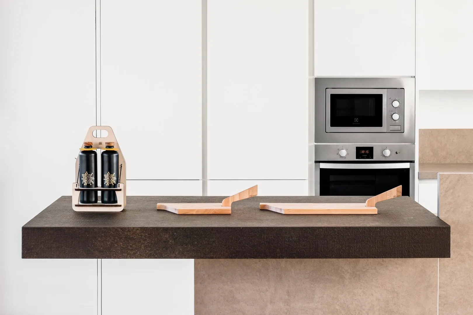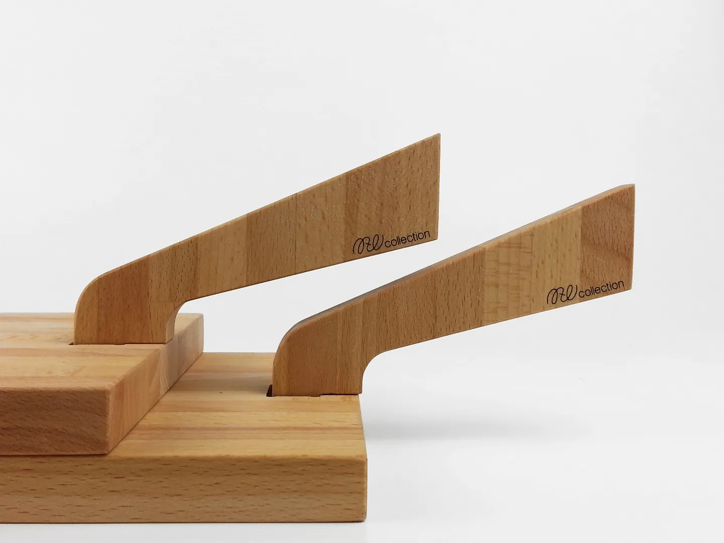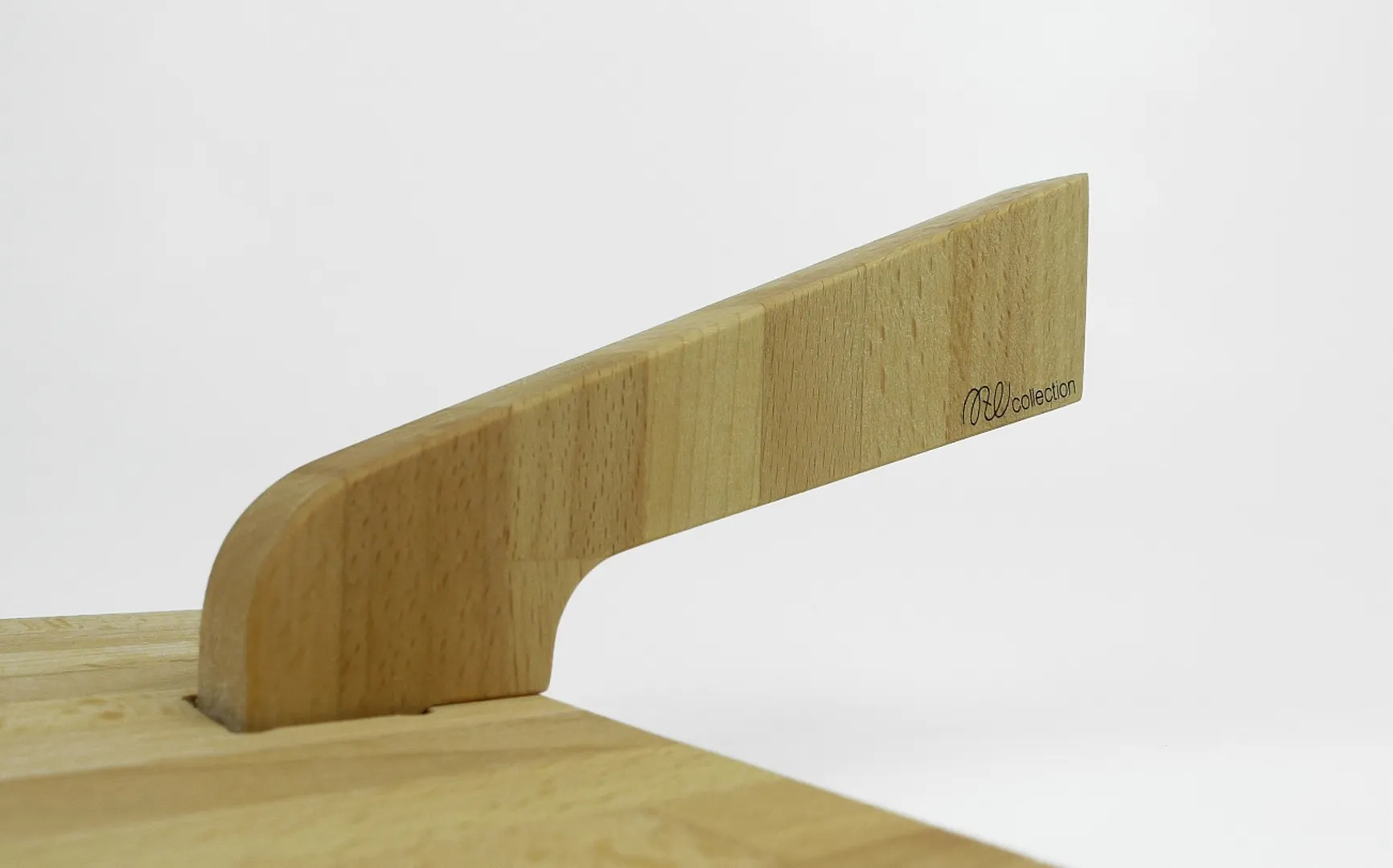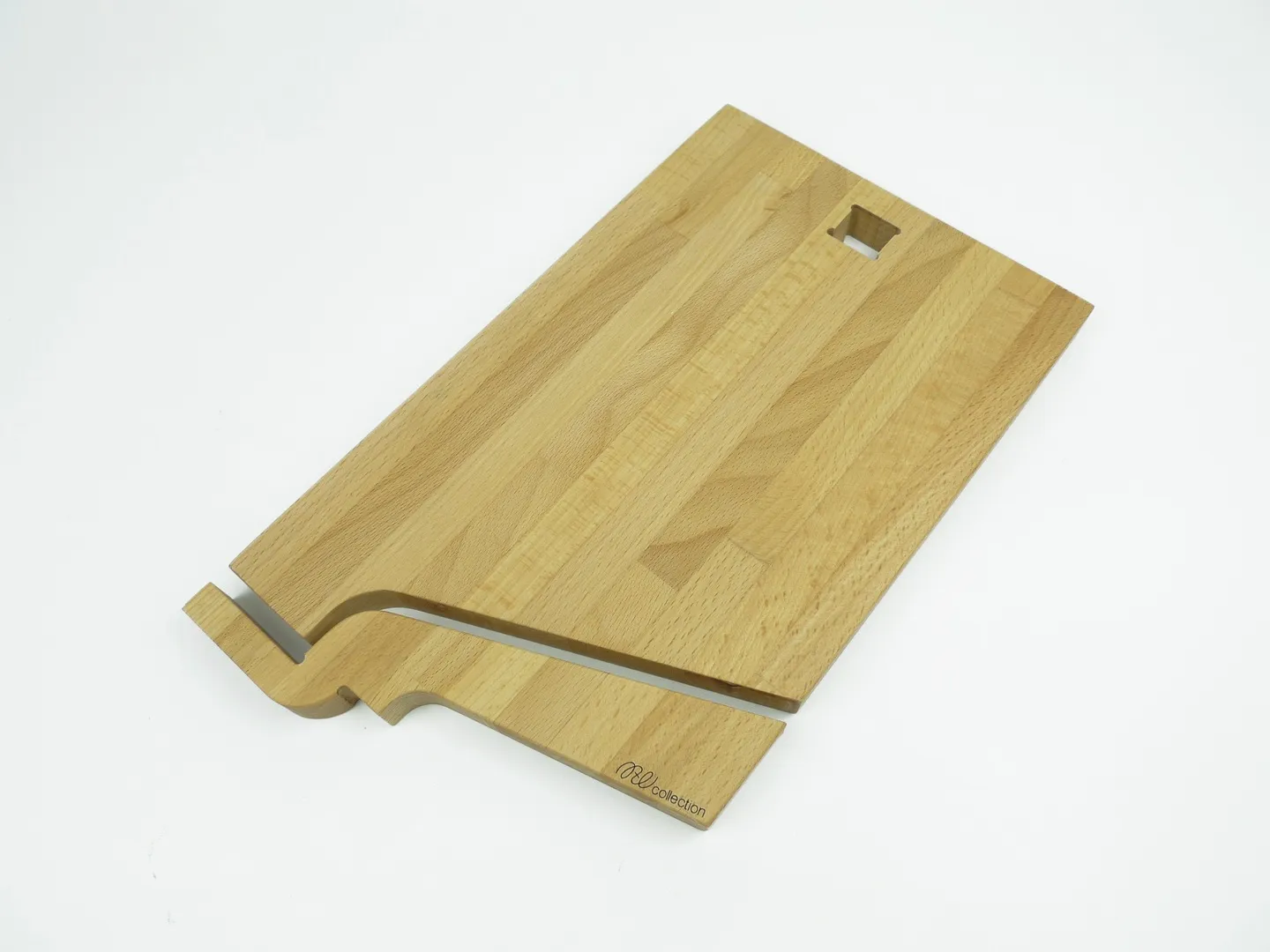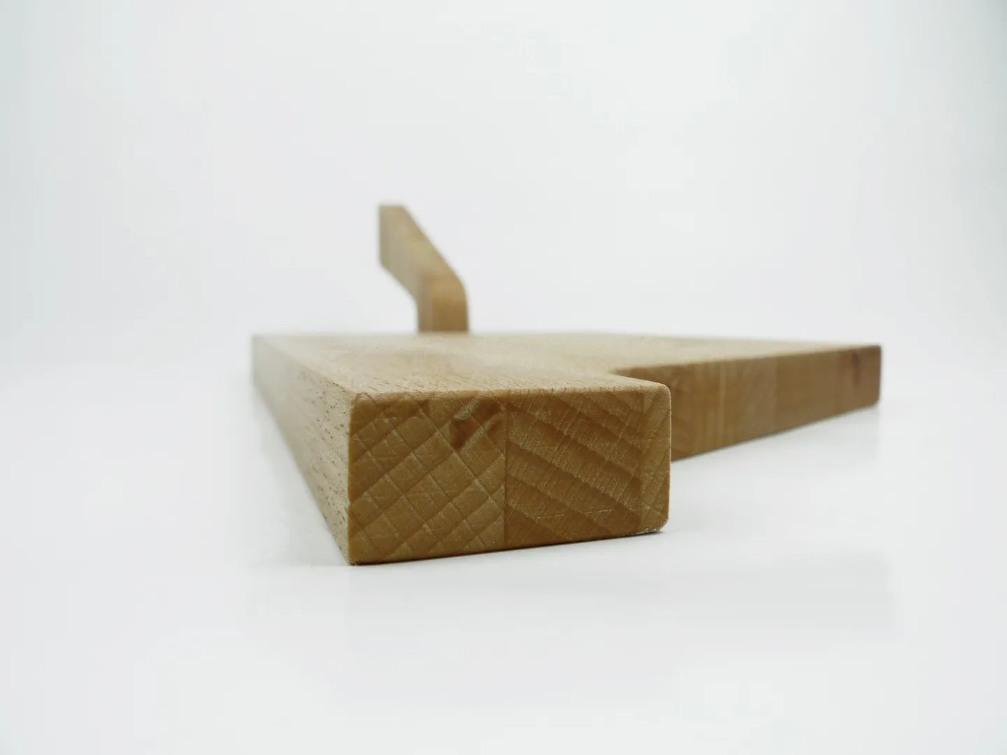 "SKERU" è un tagliere provvisto di manico, che è stato da me ideato con il presupposto di produrre entrambe le forme (il piano orizzontale + il manico) da un unico massello di legno da 3 cm. Concepito in 2 misure da 30 e 45 cm, "SKERU" è lavorato a controllo numerico e ha una linea di produzione che prevede uno spreco quasi nullo, nel senso che già il pannello di legno lamellare all'origine è sezionato in modo da sfruttare al massimo le sue dimensioni. Il manico di ciascun tagliere, seguendo lo stesso principio, è ottenuto dalla sezione rispettiva e studiato in modo tale che possa alloggiarsi nella superficie del tagliere, passando per il traforo sagomato anch'esso con controllo numerico. Lo spicchio di legno rimanente dalla lavorazione viene poi utilizzato incollandolo nel suo packaging (della serie “non si butta via nulla”) per garantirne stabilità e ridurre più possibile il movimento dell'oggetto durante il trasporto. Nell'illustrazione viene esemplificato il movimento rotatorio del manico durante il suo inserimento nel piano orizzontale.