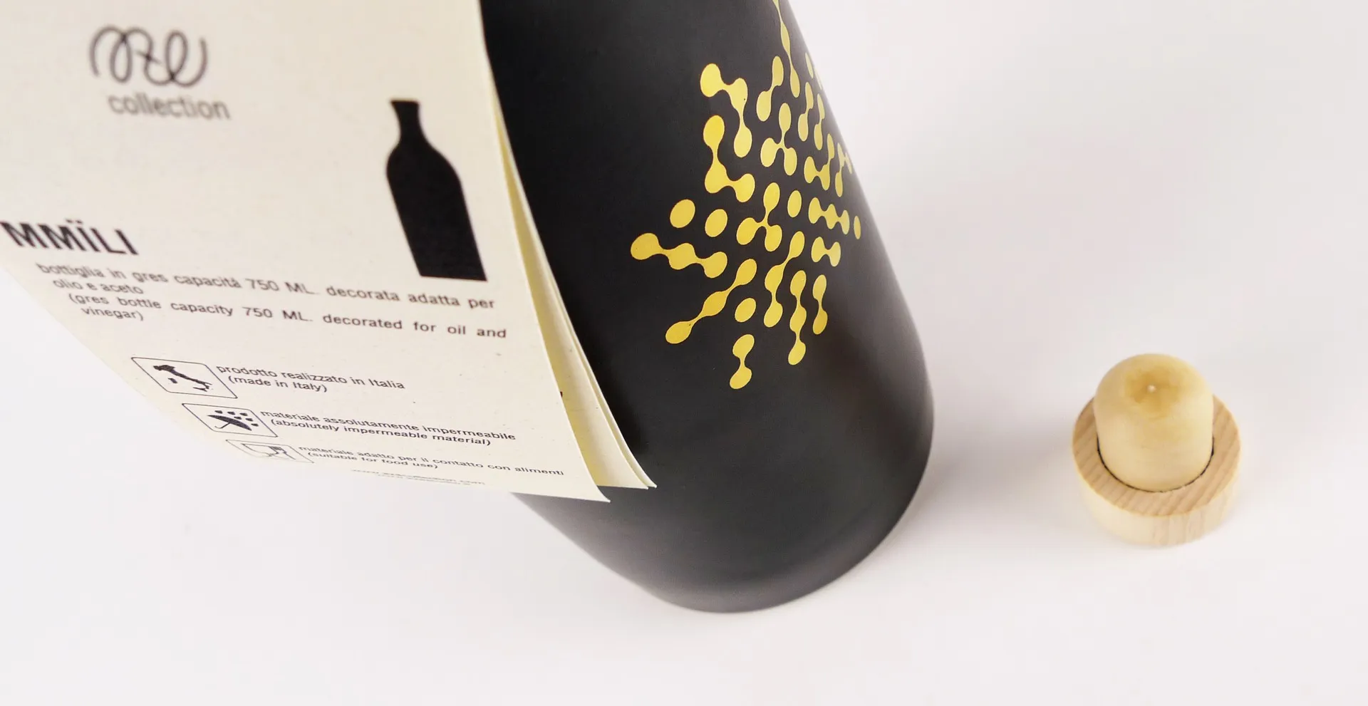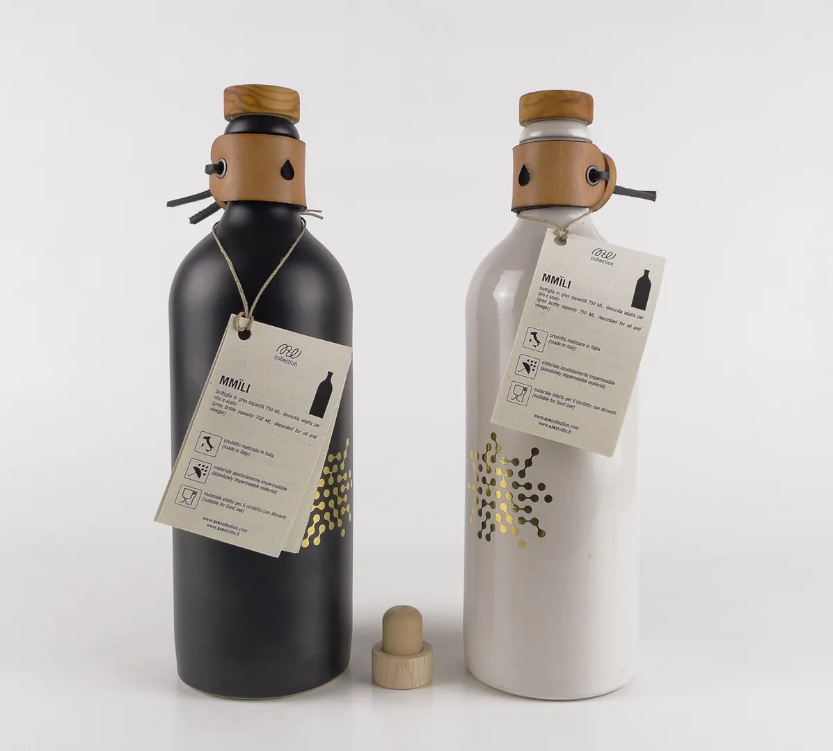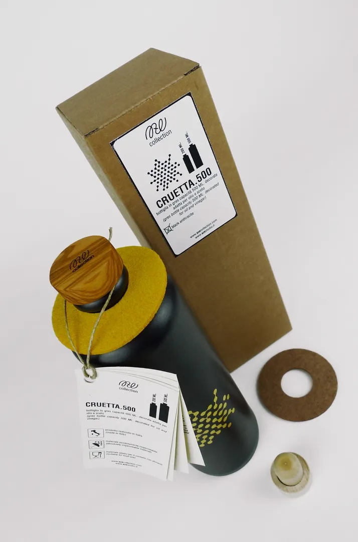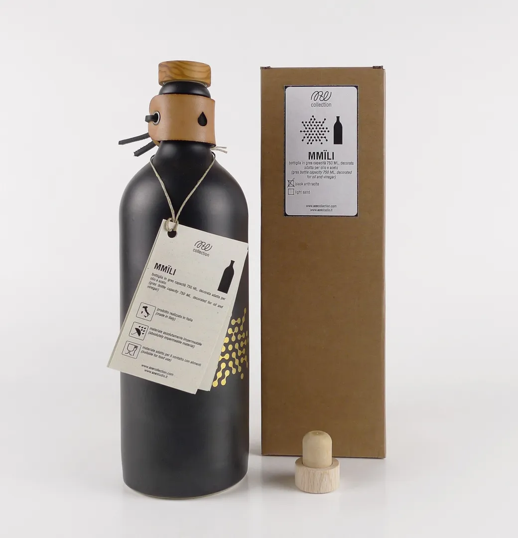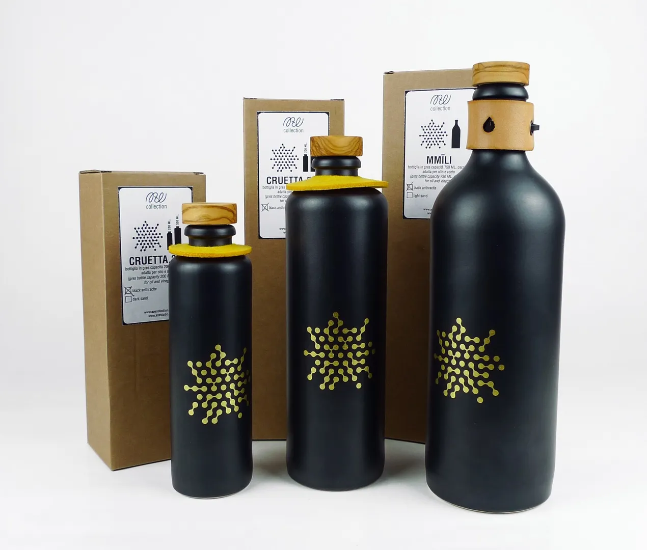 E ora passiamo ad analizzare i prodotti AZE COLLECTION, tutti corredati di packaging e etichette illustrative che ne spiegano i dettagli; cominceremo da "CRUETTA" e "MMÏLI", due collezioni di bottiglie in gres porcellanato cotte ad alta temperatura (1380°), adatte per contenere olio o liquori. Le bottiglie “CRUETTA” sono state ideate da 250 ml e 500 ml in materiale gres (“MMÏLI” nella versione da 1 litro) perché grazie a questo materiale le "pareti" della bottiglia hanno un coefficiente di assorbimento pari a zero; pertanto il materiale con cui sono composte non permette la "trasudazione", fenomeno che invece è molto facile che possa avvenire con materiali come la ceramica maiolica che cuoce invece ad una temperatura intorno ai 900°. Sono bottiglie che oltre ad assolvere la loro funzione contenitiva di liquidi, impreziosiscono la tavola in modo originale.