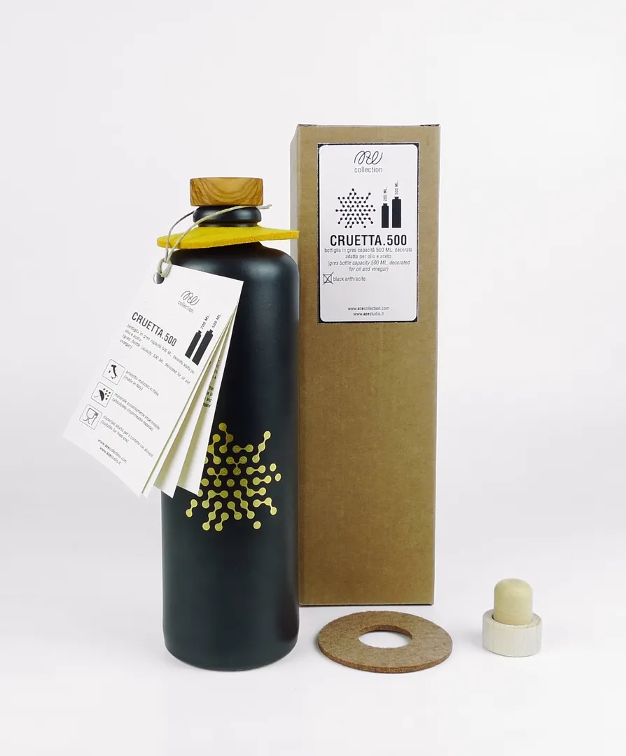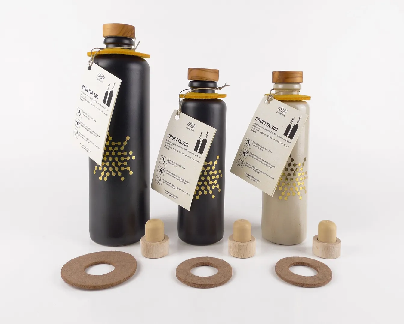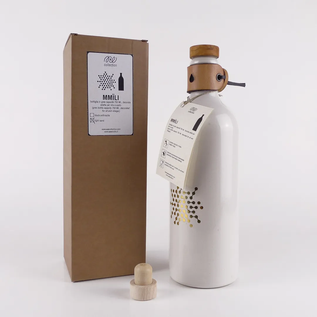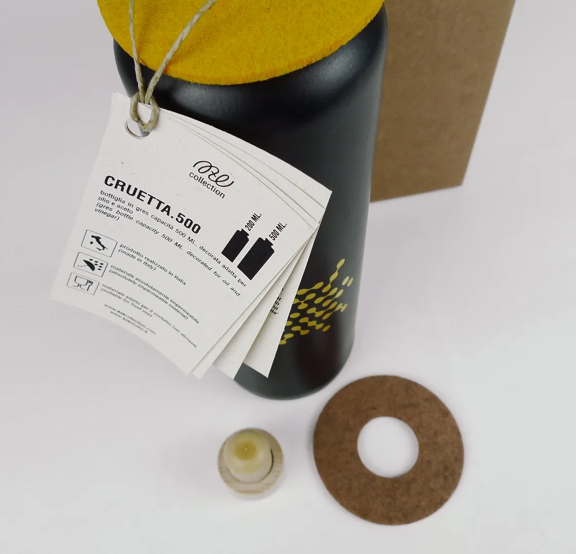 E ora passiamo ad analizzare i prodotti AZE COLLECTION, tutti corredati di packaging e etichette illustrative che ne spiegano i dettagli; cominceremo da "CRUETTA" e "MMÏLI", due collezioni di bottiglie in gres porcellanato cotte ad alta temperatura (1380°), adatte per contenere olio o liquori. Le bottiglie “CRUETTA” sono state ideate da 250 ml e 500 ml in materiale gres (“MMÏLI” nella versione da 1 litro) perché grazie a questo materiale le "pareti" della bottiglia hanno un coefficiente di assorbimento pari a zero; pertanto il materiale con cui sono composte non permette la "trasudazione", fenomeno che invece è molto facile che possa avvenire con materiali come la ceramica maiolica che cuoce invece ad una temperatura intorno ai 900°. Sono bottiglie che oltre ad assolvere la loro funzione contenitiva di liquidi, impreziosiscono la tavola in modo originale.