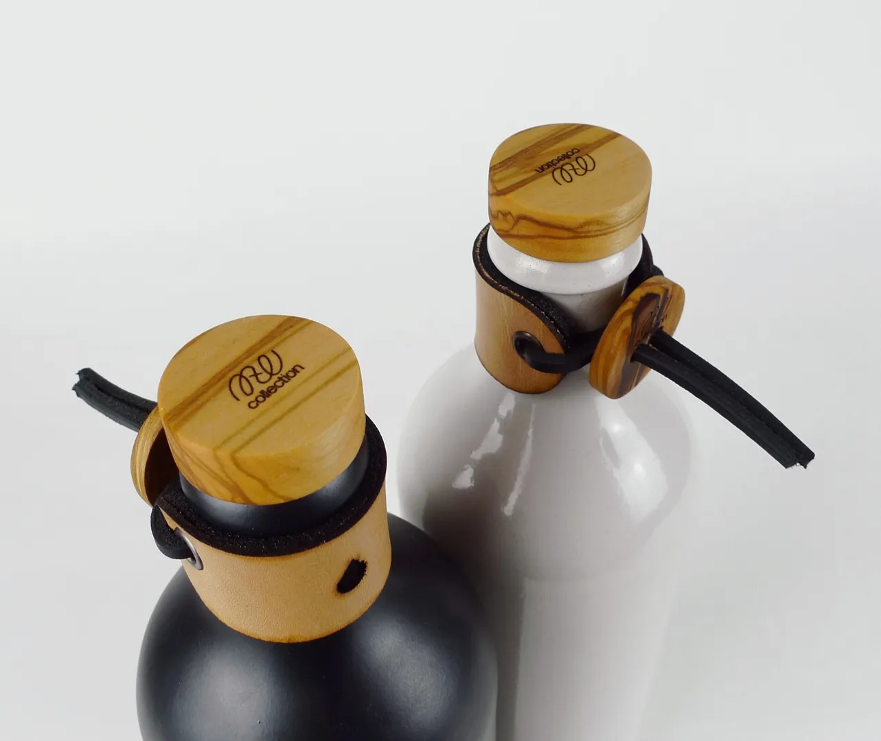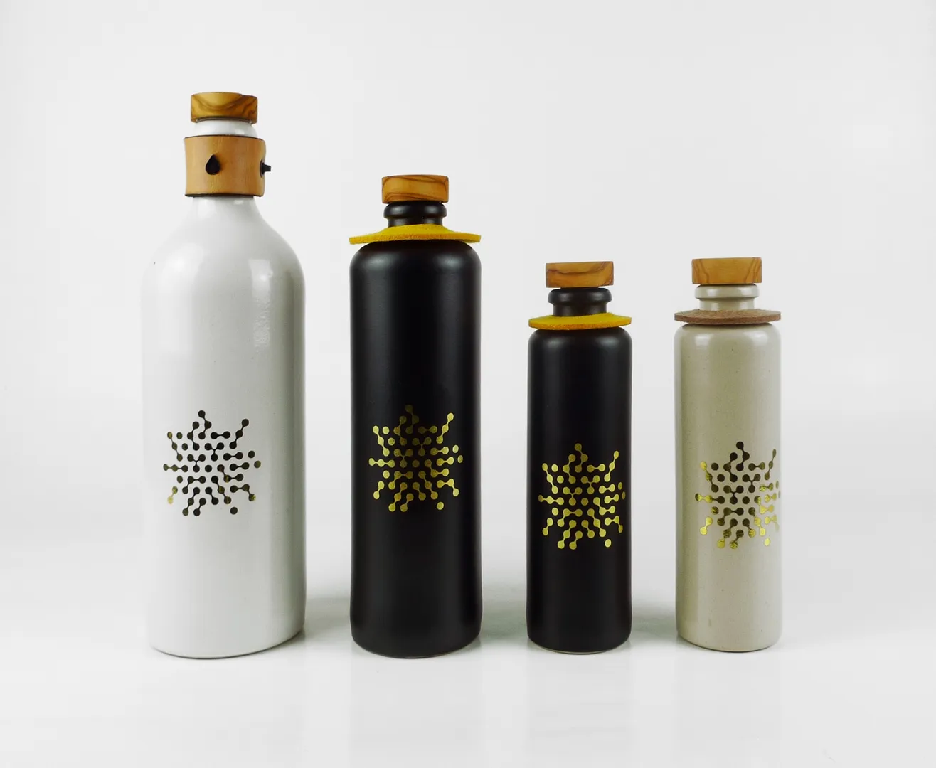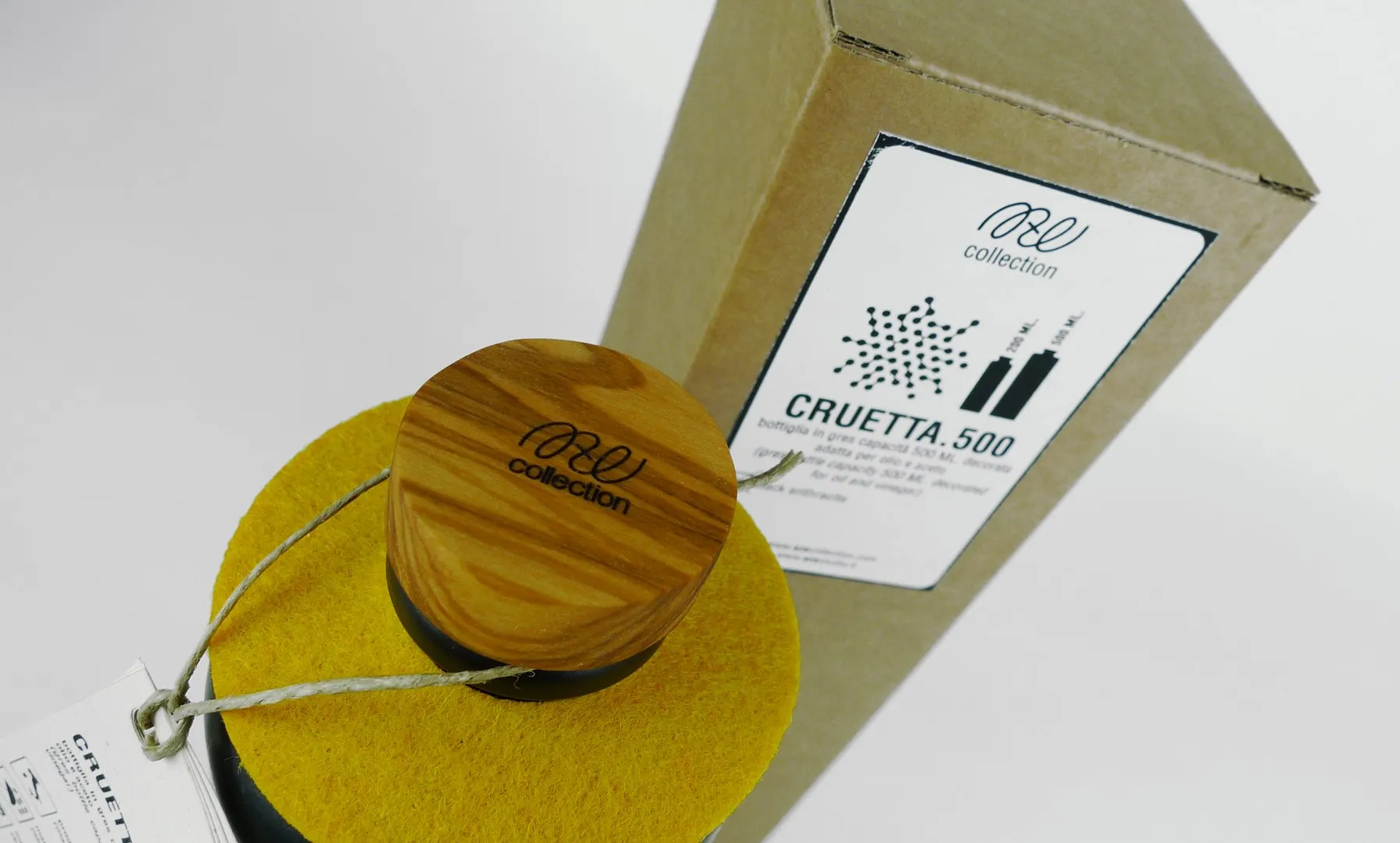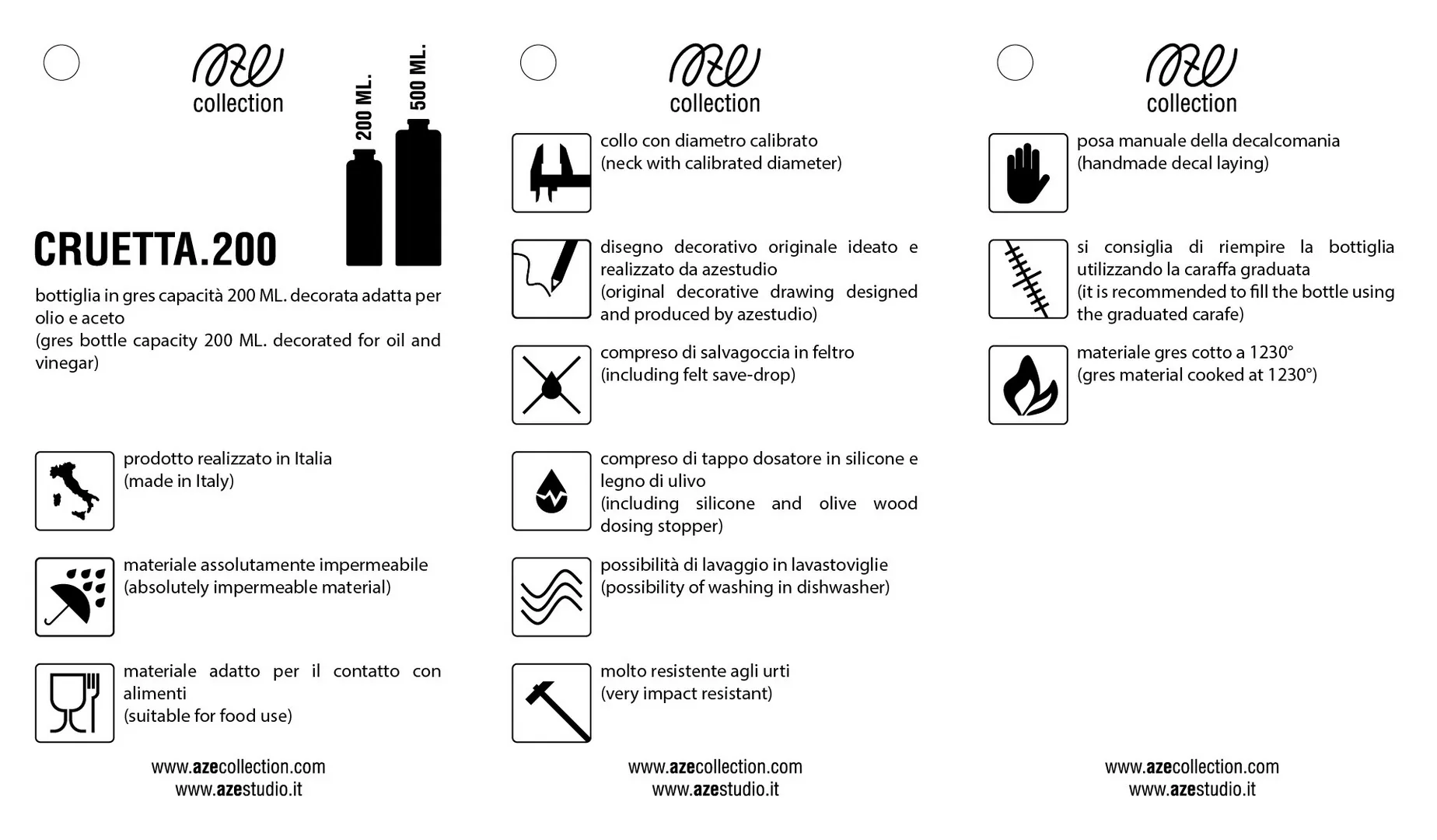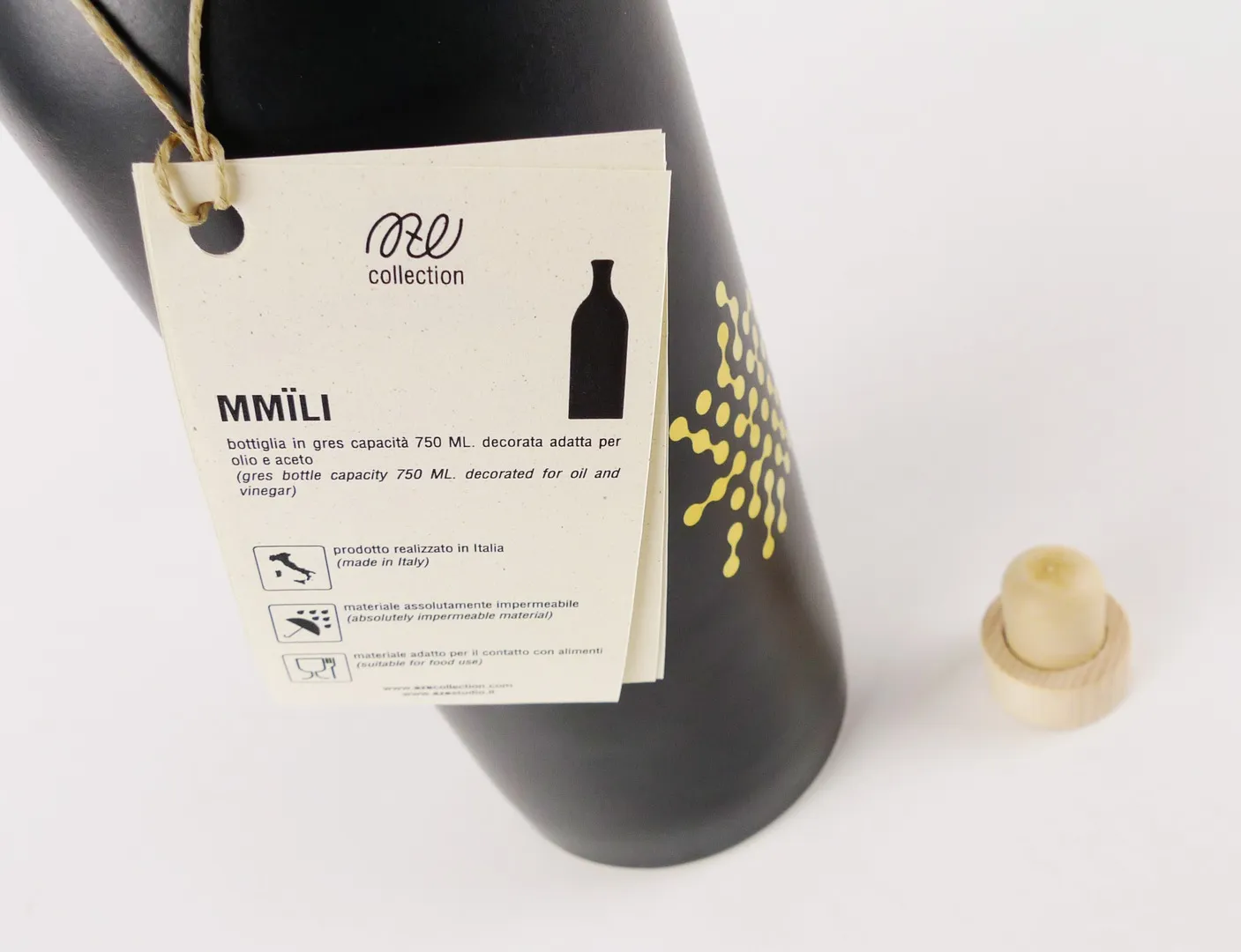 E ora passiamo ad analizzare i prodotti AZE COLLECTION, tutti corredati di packaging e etichette illustrative che ne spiegano i dettagli; cominceremo da "CRUETTA" e "MMÏLI", due collezioni di bottiglie in gres porcellanato cotte ad alta temperatura (1380°), adatte per contenere olio o liquori. Le bottiglie “CRUETTA” sono state ideate da 250 ml e 500 ml in materiale gres (“MMÏLI” nella versione da 1 litro) perché grazie a questo materiale le "pareti" della bottiglia hanno un coefficiente di assorbimento pari a zero; pertanto il materiale con cui sono composte non permette la "trasudazione", fenomeno che invece è molto facile che possa avvenire con materiali come la ceramica maiolica che cuoce invece ad una temperatura intorno ai 900°. Sono bottiglie che oltre ad assolvere la loro funzione contenitiva di liquidi, impreziosiscono la tavola in modo originale.