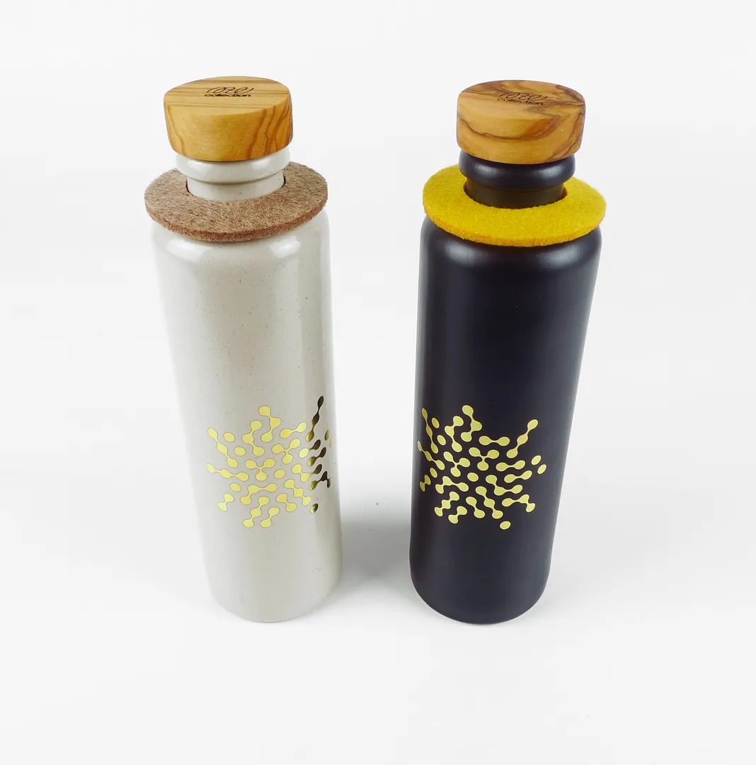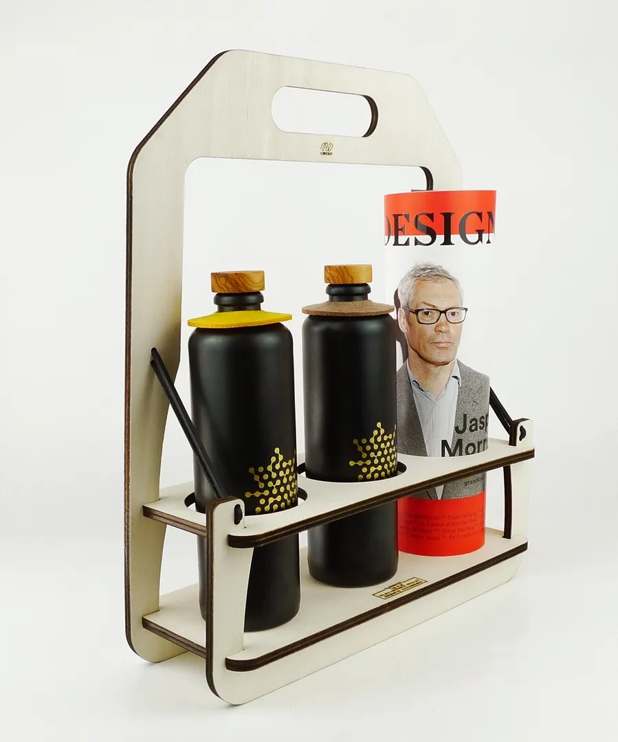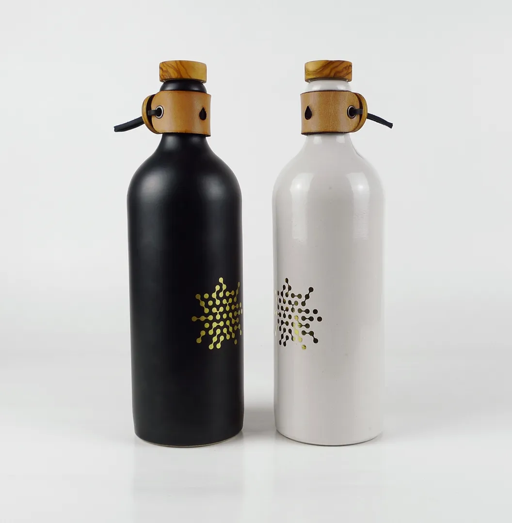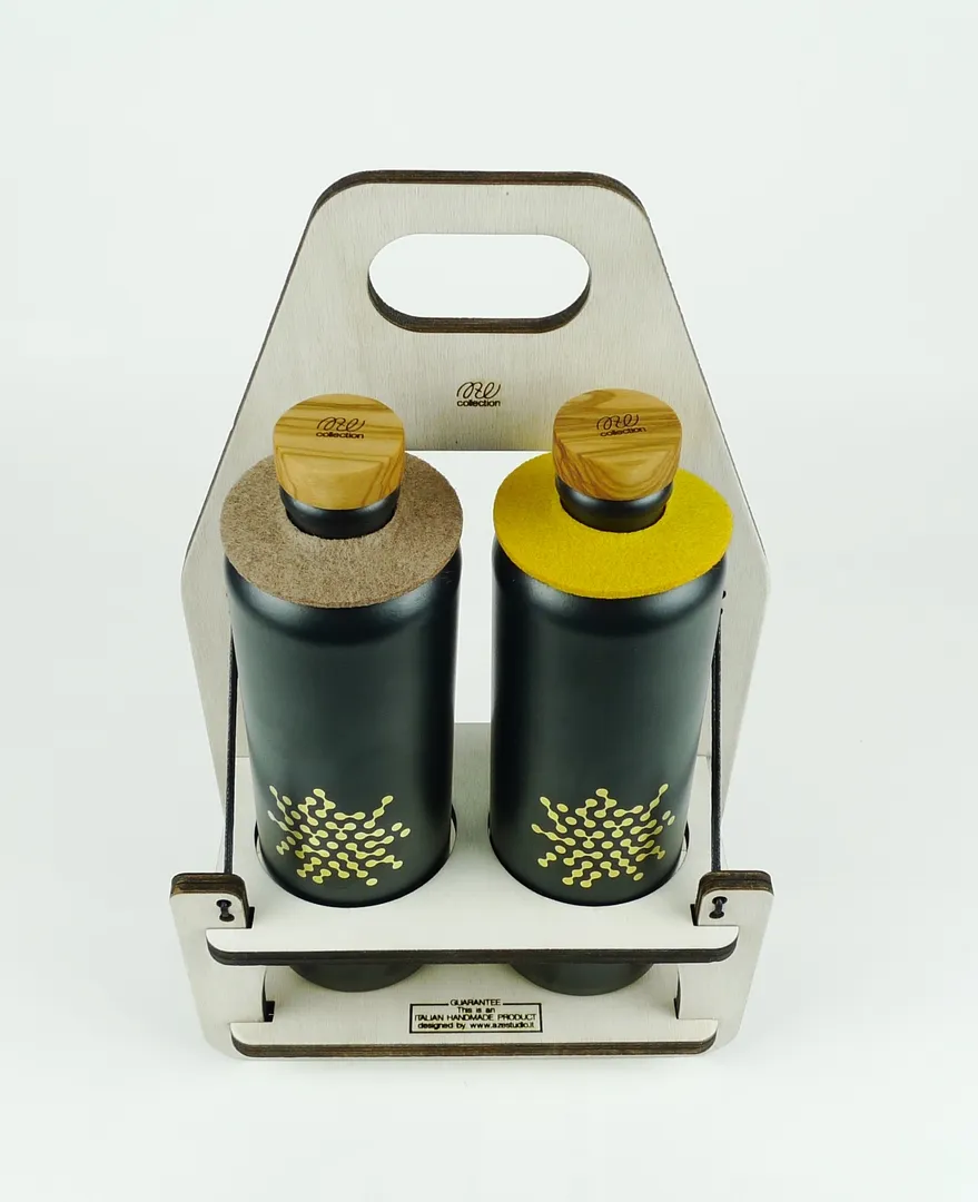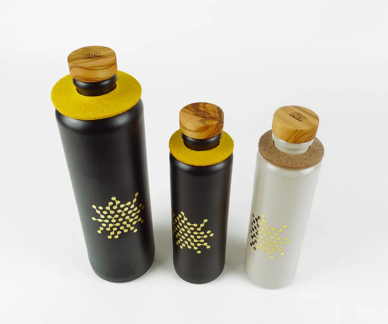 E ora passiamo ad analizzare i prodotti AZE COLLECTION, tutti corredati di packaging e etichette illustrative che ne spiegano i dettagli; cominceremo da "CRUETTA" e "MMÏLI", due collezioni di bottiglie in gres porcellanato cotte ad alta temperatura (1380°), adatte per contenere olio o liquori. Le bottiglie “CRUETTA” sono state ideate da 250 ml e 500 ml in materiale gres (“MMÏLI” nella versione da 1 litro) perché grazie a questo materiale le "pareti" della bottiglia hanno un coefficiente di assorbimento pari a zero; pertanto il materiale con cui sono composte non permette la "trasudazione", fenomeno che invece è molto facile che possa avvenire con materiali come la ceramica maiolica che cuoce invece ad una temperatura intorno ai 900°. Sono bottiglie che oltre ad assolvere la loro funzione contenitiva di liquidi, impreziosiscono la tavola in modo originale.