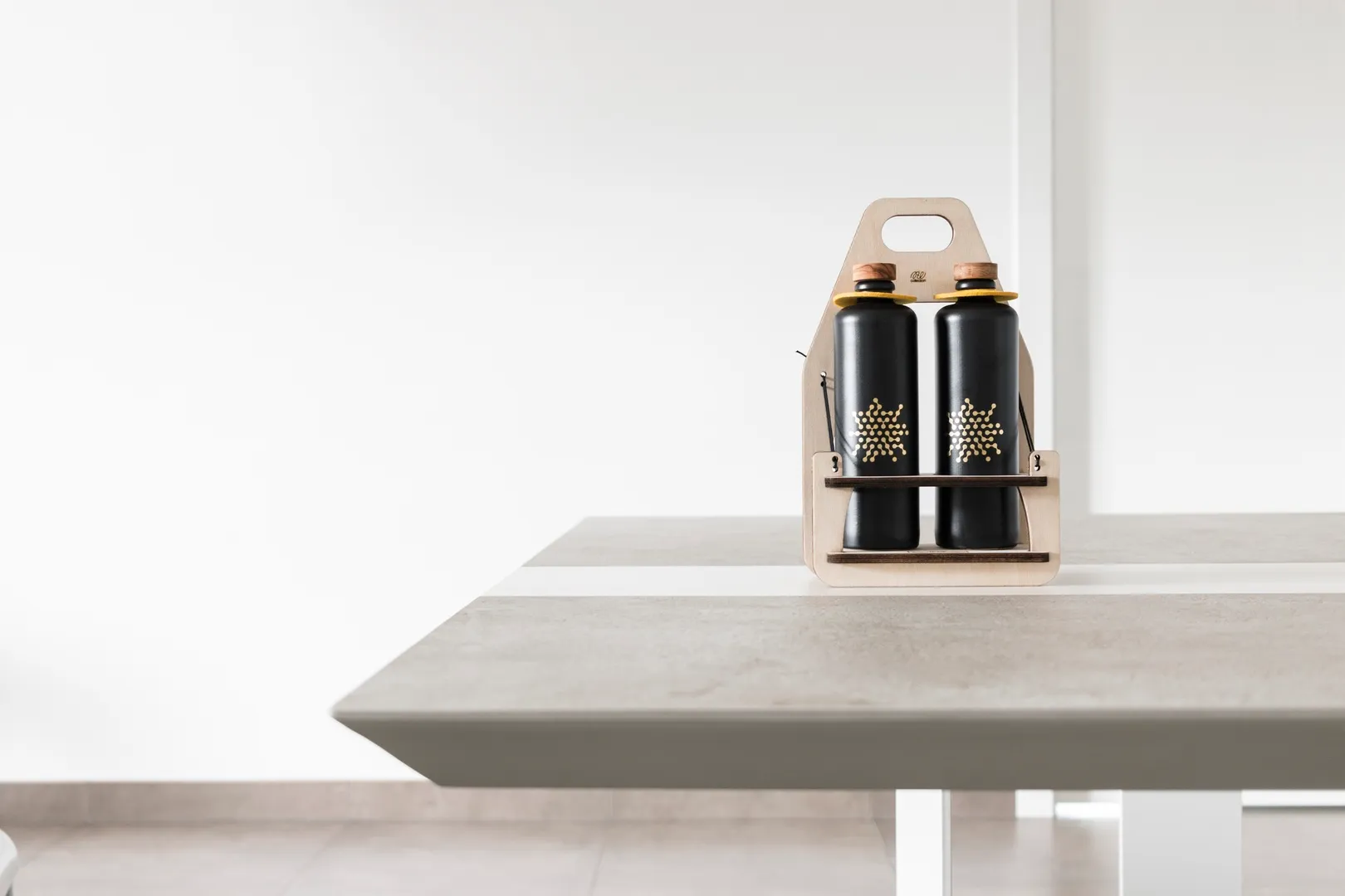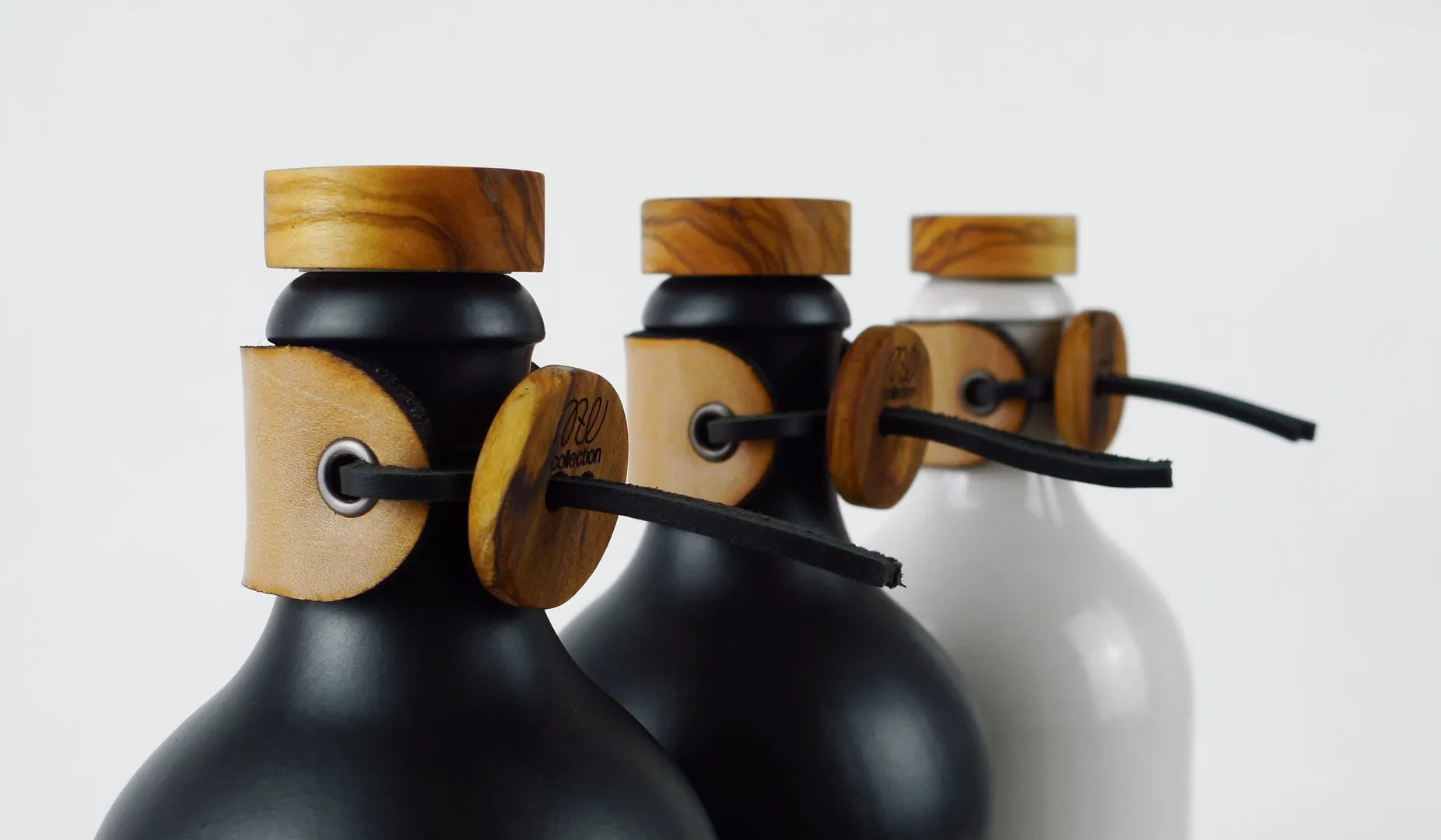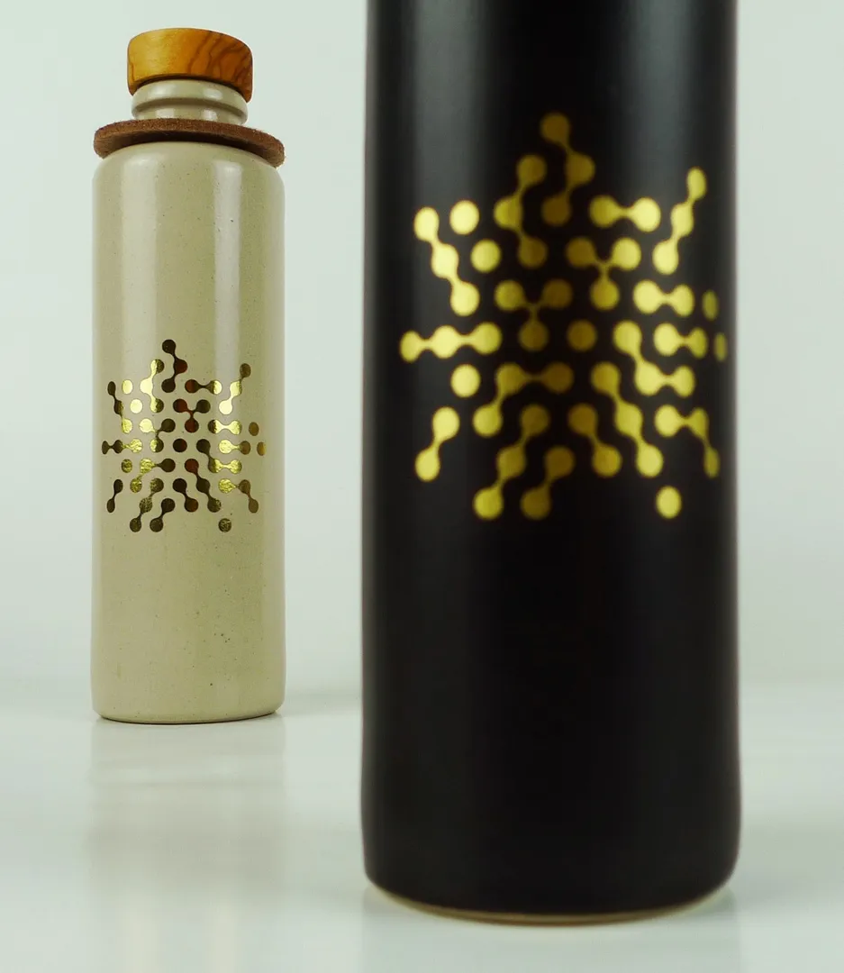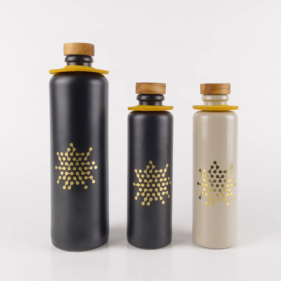 E ora passiamo ad analizzare i prodotti AZE COLLECTION, tutti corredati di packaging e etichette illustrative che ne spiegano i dettagli; cominceremo da "CRUETTA" e "MMÏLI", due collezioni di bottiglie in gres porcellanato cotte ad alta temperatura (1380°), adatte per contenere olio o liquori. Le bottiglie “CRUETTA” sono state ideate da 250 ml e 500 ml in materiale gres (“MMÏLI” nella versione da 1 litro) perché grazie a questo materiale le "pareti" della bottiglia hanno un coefficiente di assorbimento pari a zero; pertanto il materiale con cui sono composte non permette la "trasudazione", fenomeno che invece è molto facile che possa avvenire con materiali come la ceramica maiolica che cuoce invece ad una temperatura intorno ai 900°. Sono bottiglie che oltre ad assolvere la loro funzione contenitiva di liquidi, impreziosiscono la tavola in modo originale.