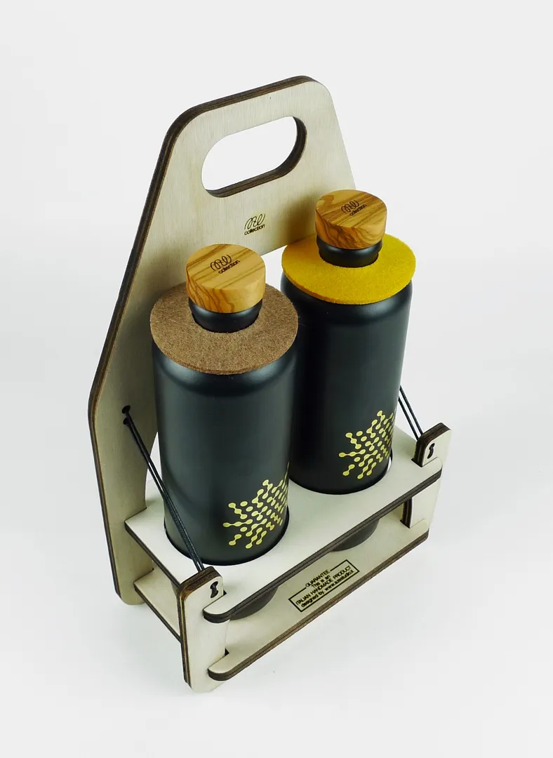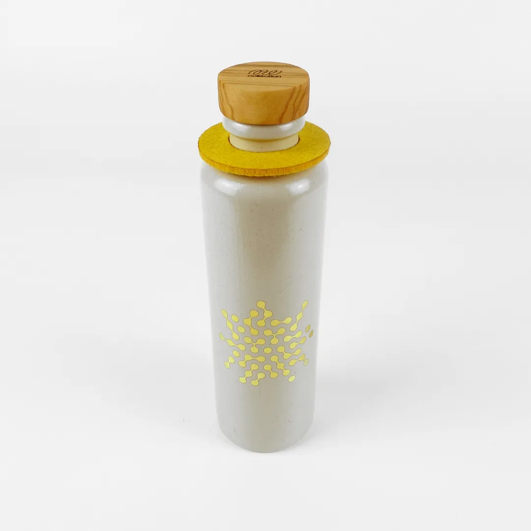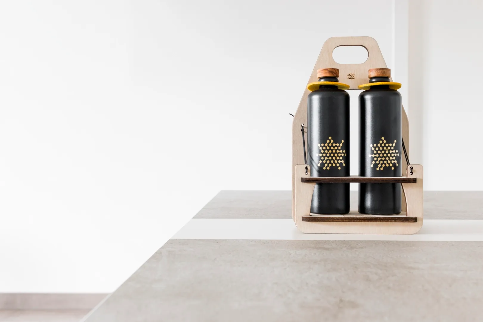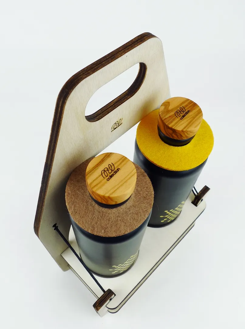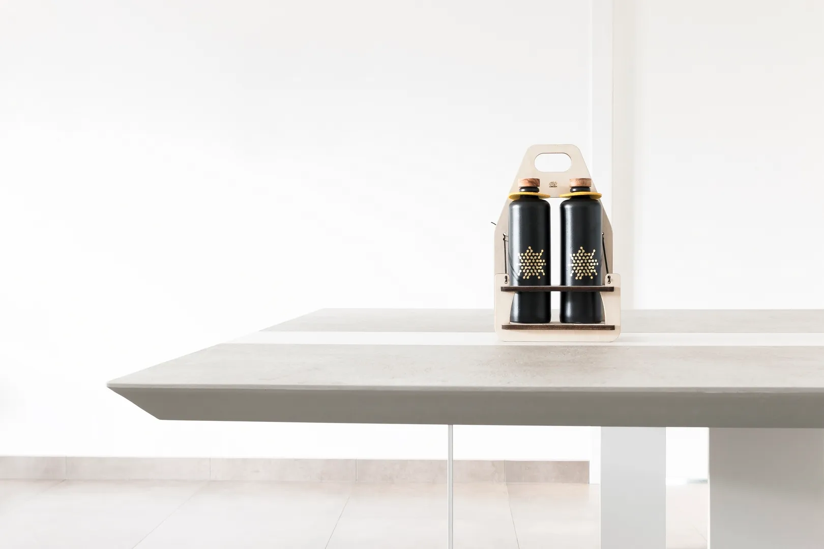 E ora passiamo ad analizzare i prodotti AZE COLLECTION, tutti corredati di packaging e etichette illustrative che ne spiegano i dettagli; cominceremo da "CRUETTA" e "MMÏLI", due collezioni di bottiglie in gres porcellanato cotte ad alta temperatura (1380°), adatte per contenere olio o liquori. Le bottiglie “CRUETTA” sono state ideate da 250 ml e 500 ml in materiale gres (“MMÏLI” nella versione da 1 litro) perché grazie a questo materiale le "pareti" della bottiglia hanno un coefficiente di assorbimento pari a zero; pertanto il materiale con cui sono composte non permette la "trasudazione", fenomeno che invece è molto facile che possa avvenire con materiali come la ceramica maiolica che cuoce invece ad una temperatura intorno ai 900°. Sono bottiglie che oltre ad assolvere la loro funzione contenitiva di liquidi, impreziosiscono la tavola in modo originale.