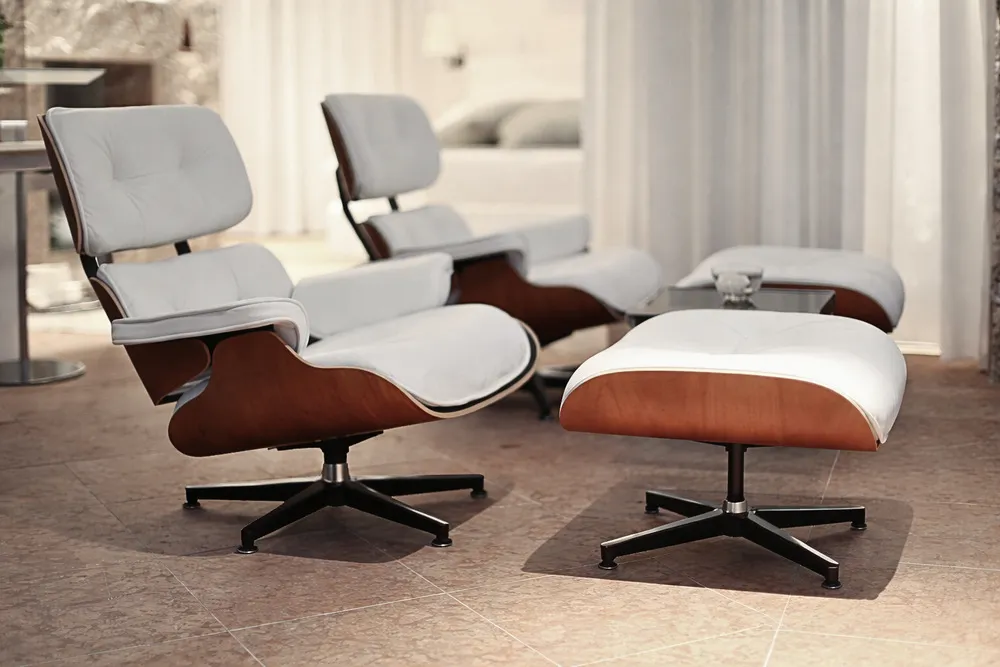 Ma non solo; il controsoffitto, completo di gole e ribassamenti, ha determinato gli spazi utili di alloggiamento per le tende divisorie: quella che chiude il guardaroba a destra del camino e quella che divide trasversalmente i 2 ambienti principali, la zona letto e la zona bar, in cui successivamente sono state posizionate le 2 "Lounge Chair & Ottoman" (comprese di pouff) by Vitra, disegnate dai designer marito e moglie Charles Eames Jr. and Ray-Bernice Eames.