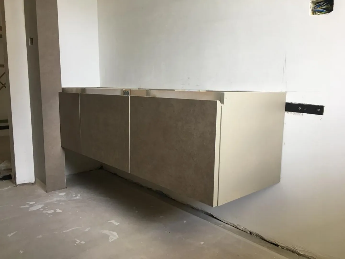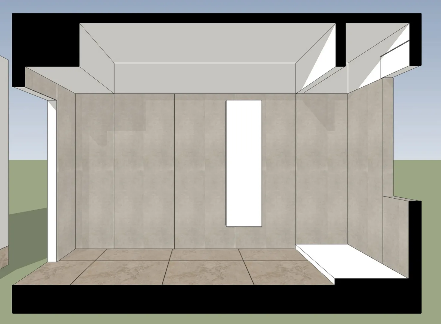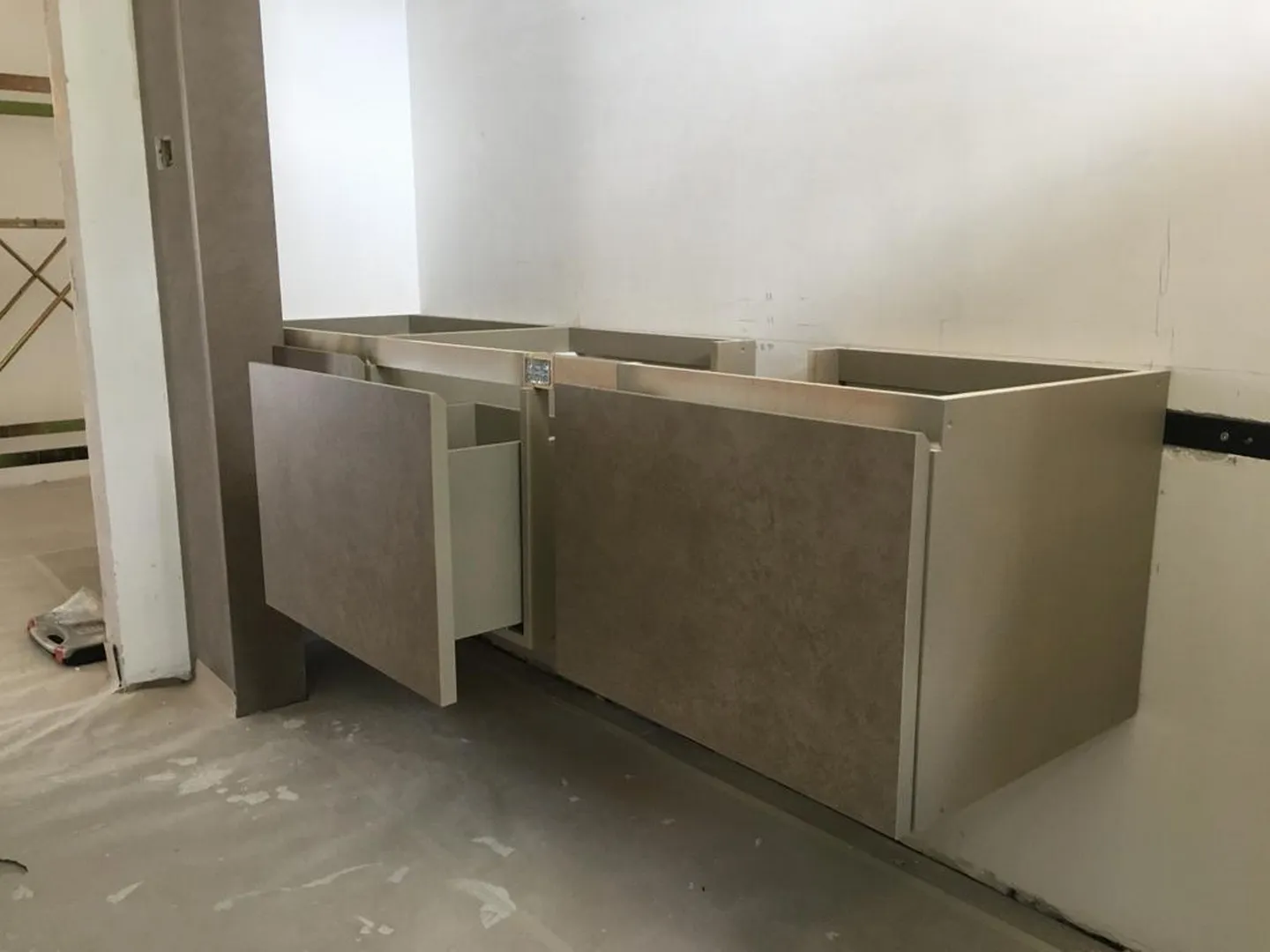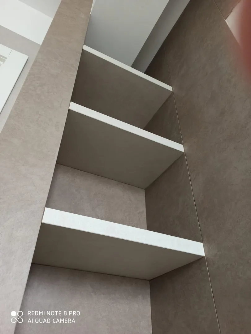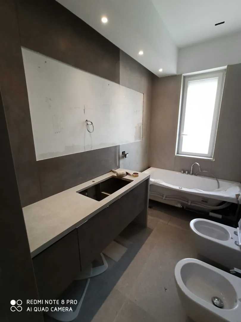 Nel bagno-vasca, invece, è il mobile del lavabo ad essere stato progettato interamente in gres; la struttura di questo mobile comprende un fianco (ugualmente sotto-strutturato) rivolto verso la vasca idromassaggio e situato alla minima distanza utile da essa per salvaguardarne l’usabilità. La direttrice su cui si allinea lo stesso fianco, crea però sulla parete una linea di confine tra i toni del rivestimento, definendo anche gli ambiti di utilizzo. Il mobile bagno, inoltre, si integra nello spazio che lo circonda, sfruttando “su misura” anche la rientranza creatasi tra cavedio (ugualmente rivestito con il grande formato) e parete; nella stessa rientranza, in alto, prendono posto 3 comodi ripiani in gres. Il rivestimento con i grandi formati quindi letteralmente si “spalma” sui volumi, sulla falegnameria, sulle pareti, nelle nicchie non solo “decorando” l’ambiente, ma aggiungendo capacità di resistenza verso gli agenti usuranti.