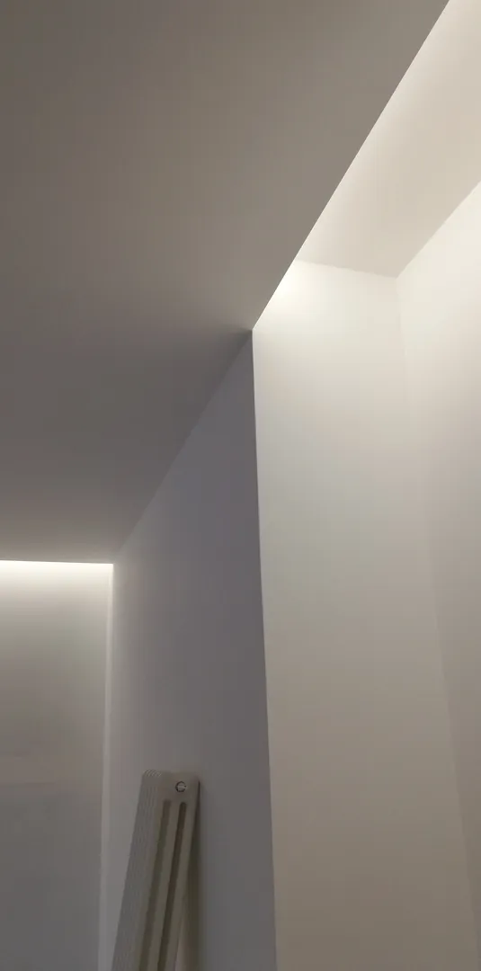 Il concetto di progettazione TOUT-COURT viene ripreso anche nello sviluppo dei controsoffitti della sala living, caratterizzata da gole e linee di luce in prossimità dei tendaggi e dello scatolato che conterrà il televisore.