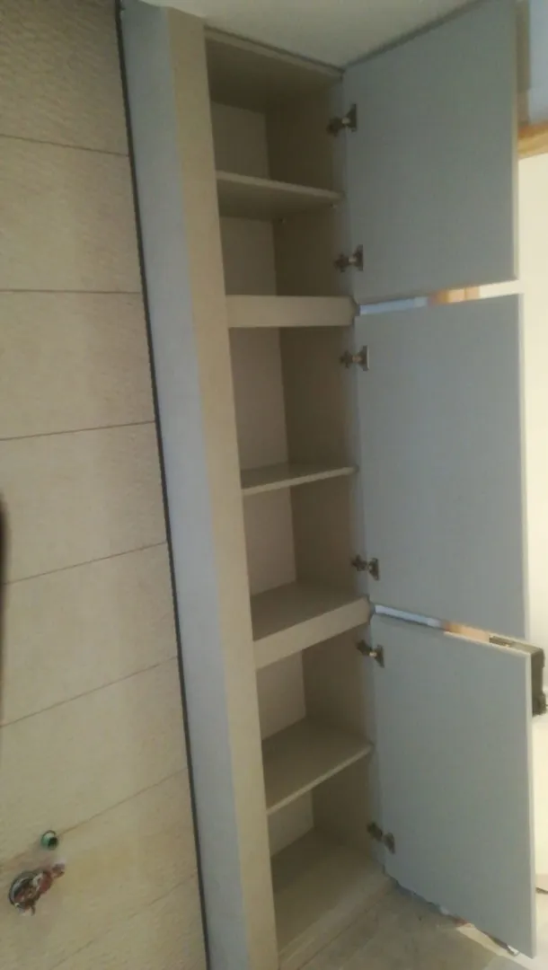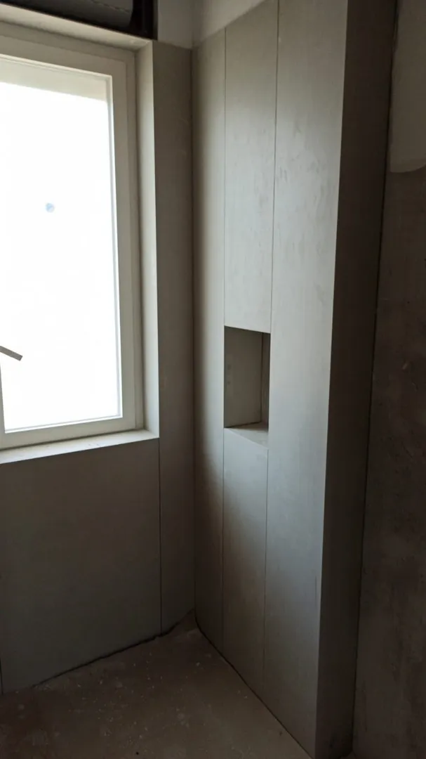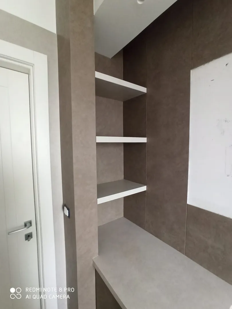 Nel bagno-doccia, il mobile verticale è rivestito in gres e si erge sfruttando al massimo lo spazio tra lavandino e rinfianco della porta di ingresso, utile, contenitivo ma anche sobrio ed elegante.