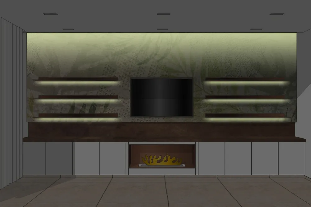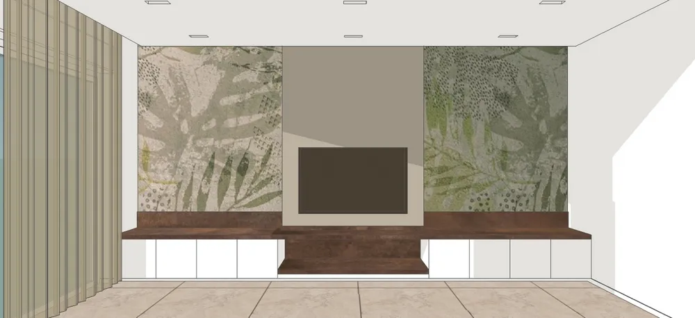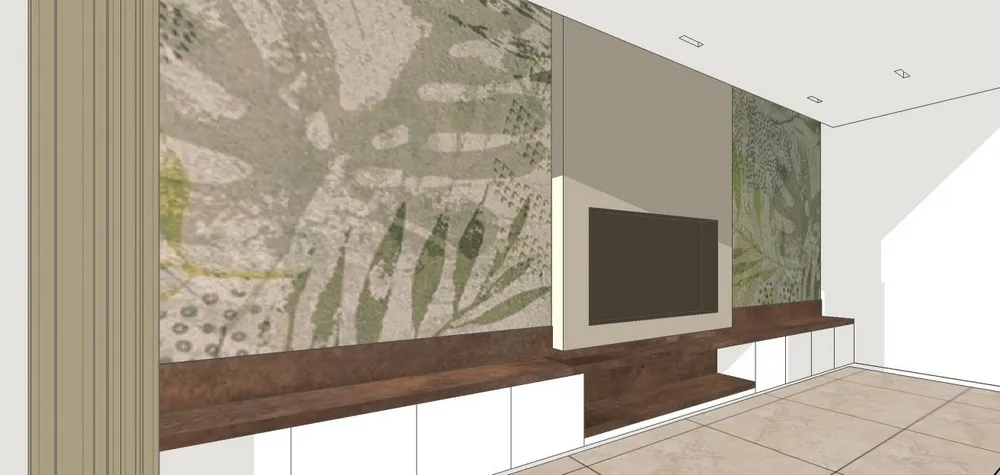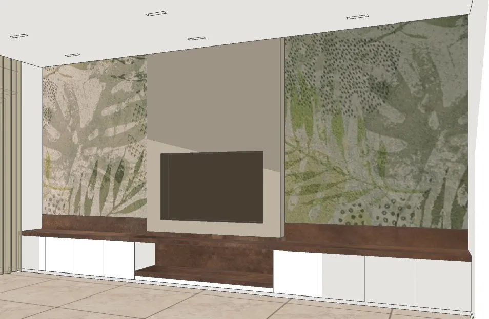 Qui sono invece rappresentate le proposte per la parete TV della sala living, caratterizzata da uno sfondo rivestito con carta da parati in "stile vegetale" by Styl'Editions e mobile da parete a parete con top in gres effetto ossido.