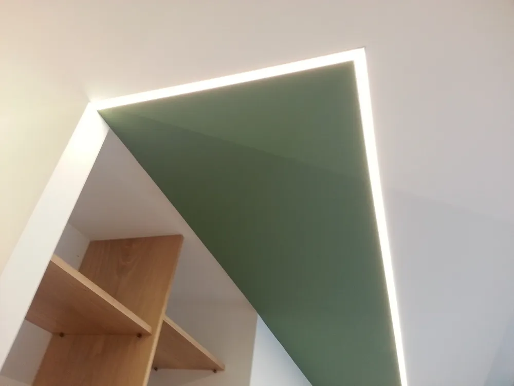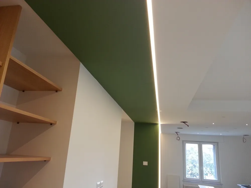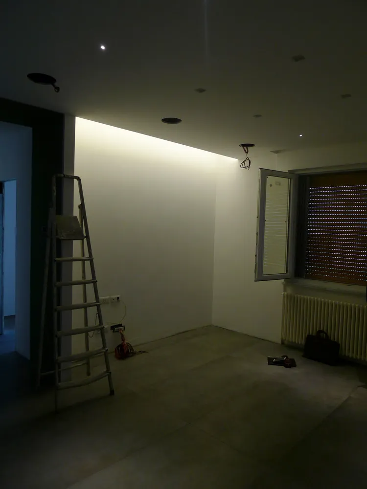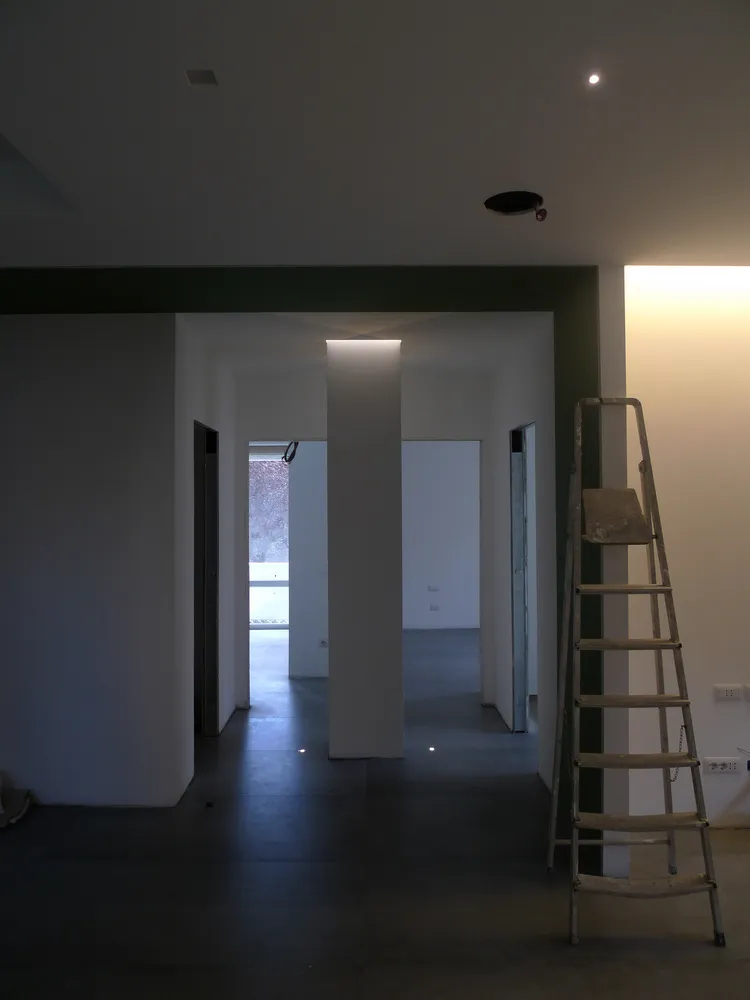 Per completare la fase impiantistica, è stato infine realizzato l'elemento più distintivo del progetto: la linea di luce che incornicia la “lingua verde”. Si tratta di un profilo in alluminio con diffusore opale, incassato e complanare , attraversato da una striscia LED ad alta luminosità, capace di valorizzare e rafforzare il segno architettonico di questo elemento. Nelle immagini si intravedono già anche i primi arredi integrati, installati all’interno degli spazi da me progettati, che iniziano a definire con maggiore chiarezza l’identità complessiva dell’intervento.
