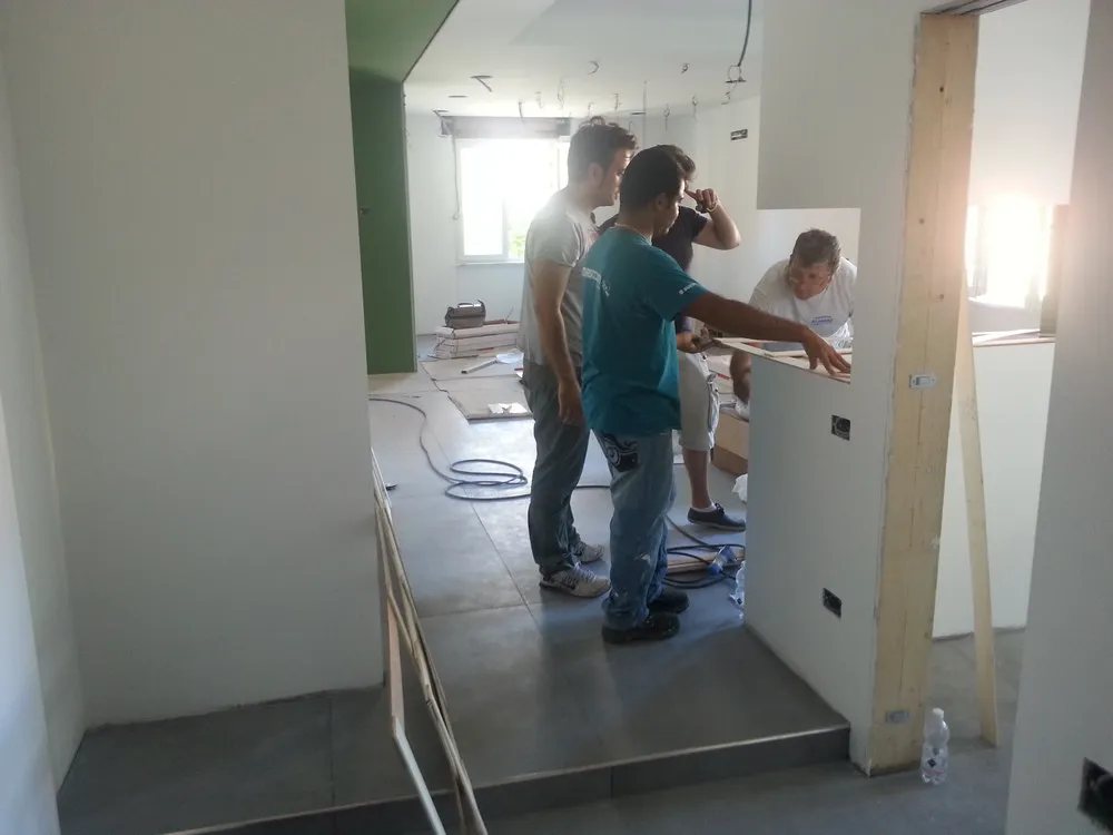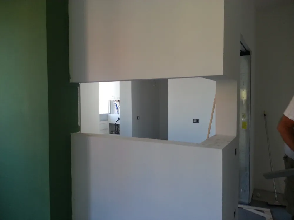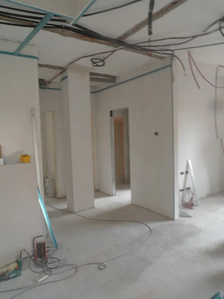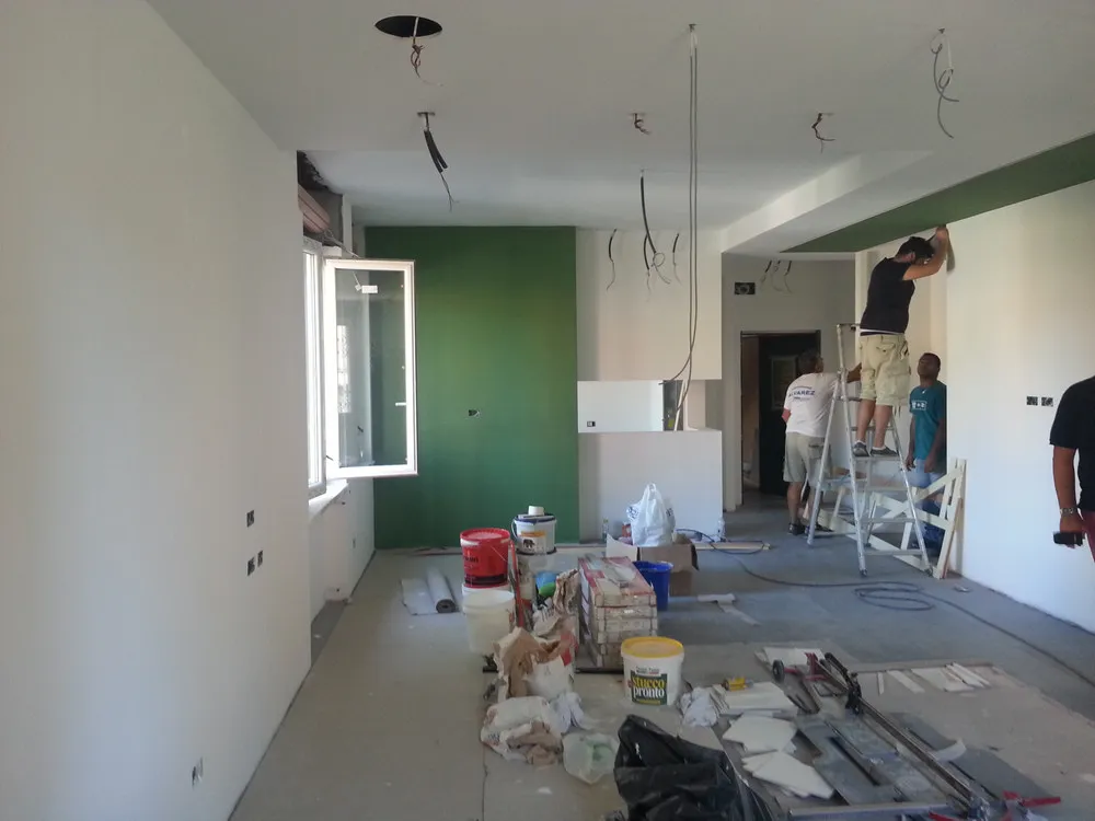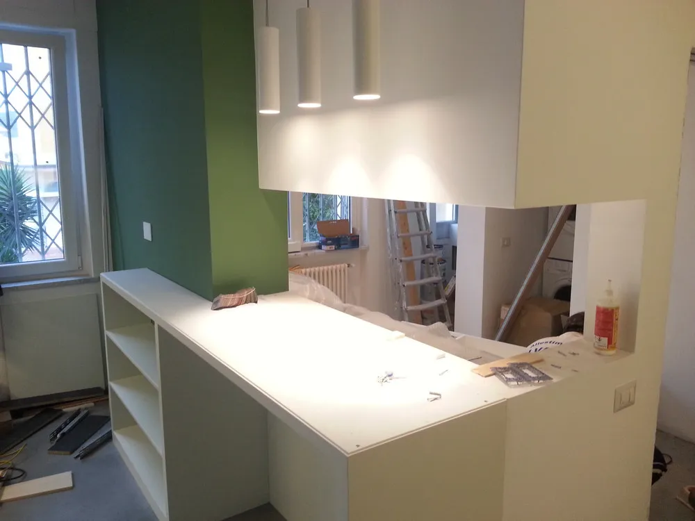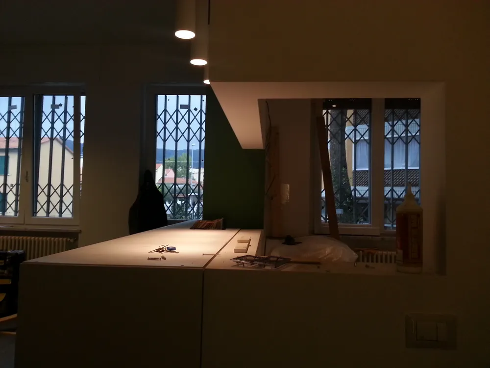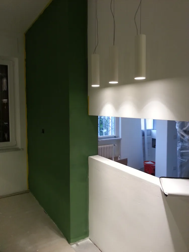 A un certo punto, l’avanzamento del cantiere ha subito una significativa accelerazione: nel giro di poche settimane sono stati completati pavimenti, cartongessi e pitture. Durante una visita in cantiere ho finalmente potuto apprezzare in modo più concreto la materializzazione delle mie idee progettuali. In una delle foto si intravede anche la proprietaria della residenza, visibilmente colpita dalla “lingua verde”, elemento architettonico distintivo e fortemente caratterizzante dell’intervento (vedi LINK della relativa news). Altri scatti di questa fase mettono in evidenza la grande operosità di tutte le maestranze, coordinate da Epoke, oltre ad alcuni dettagli costruttivi degni di nota, come le gole realizzate in prossimità del pilastro del disimpegno e l’apertura della cucina, dove sarà collocato il bancone snack.