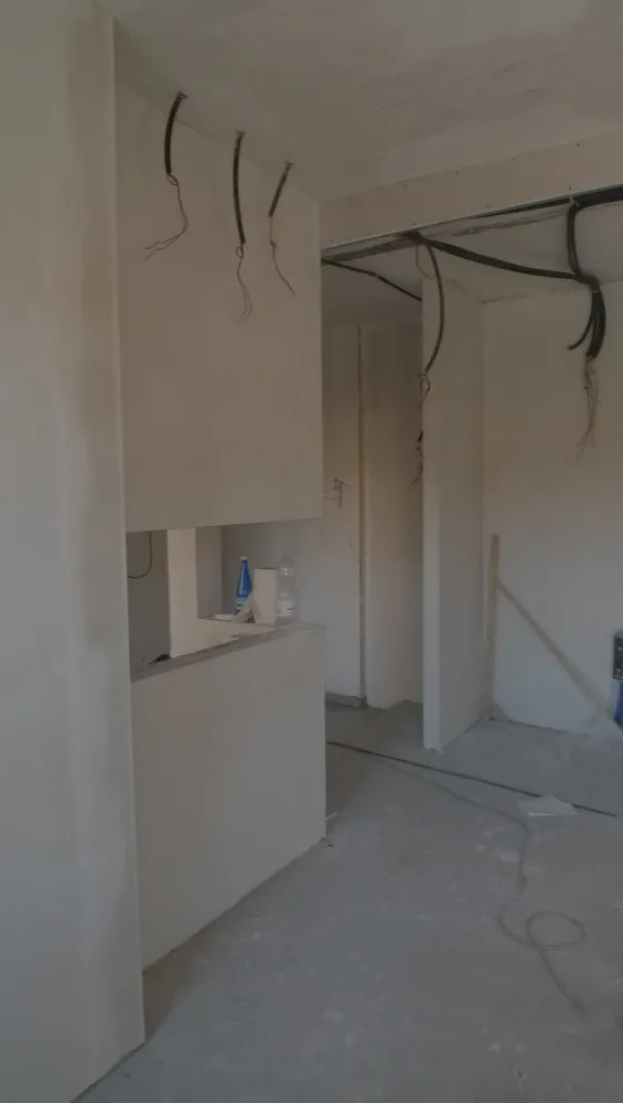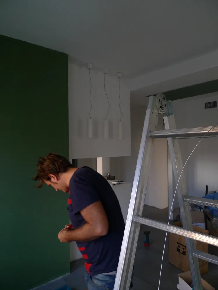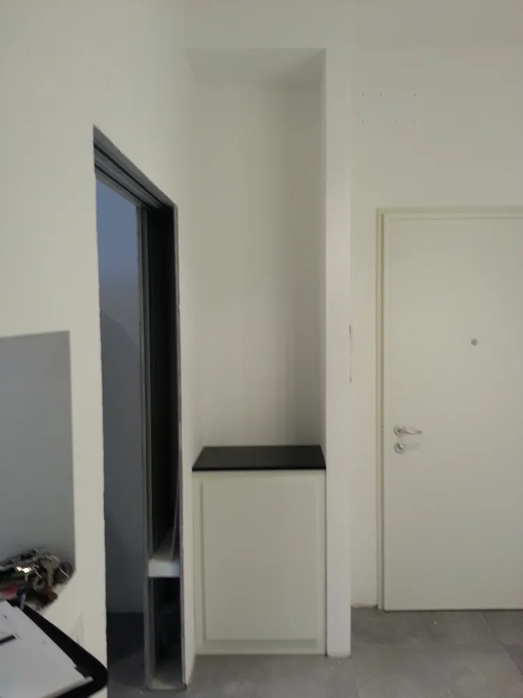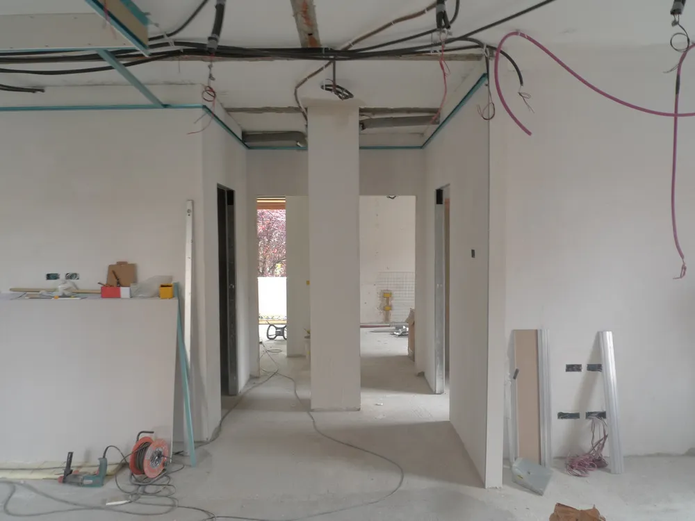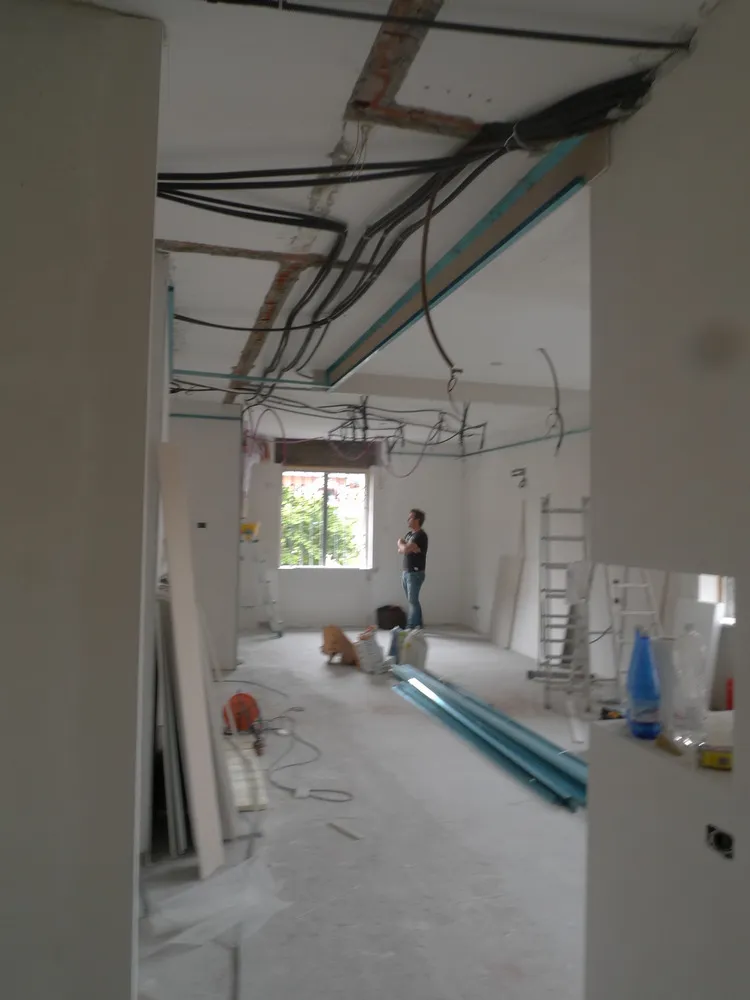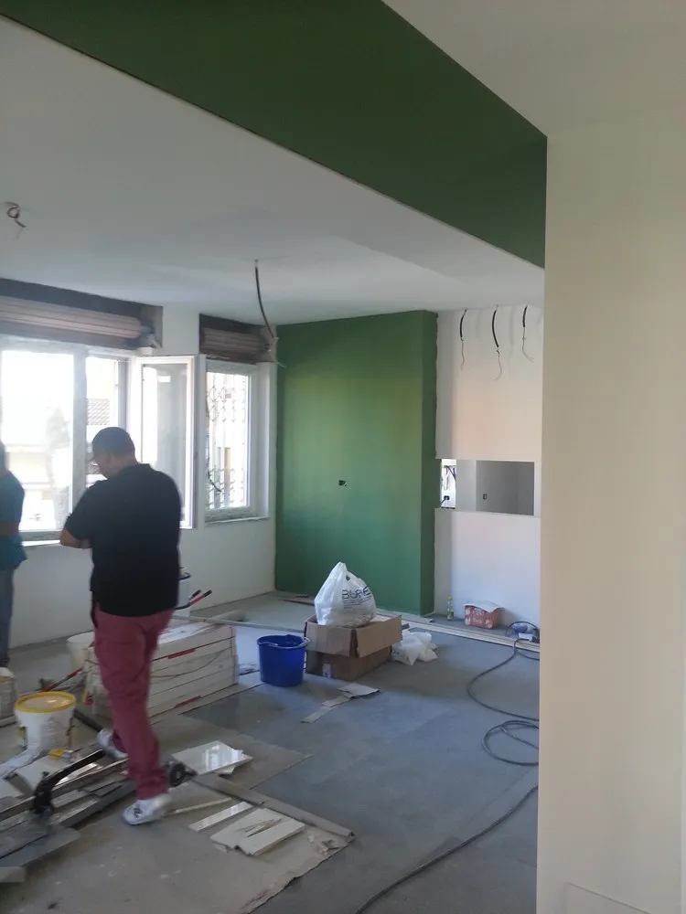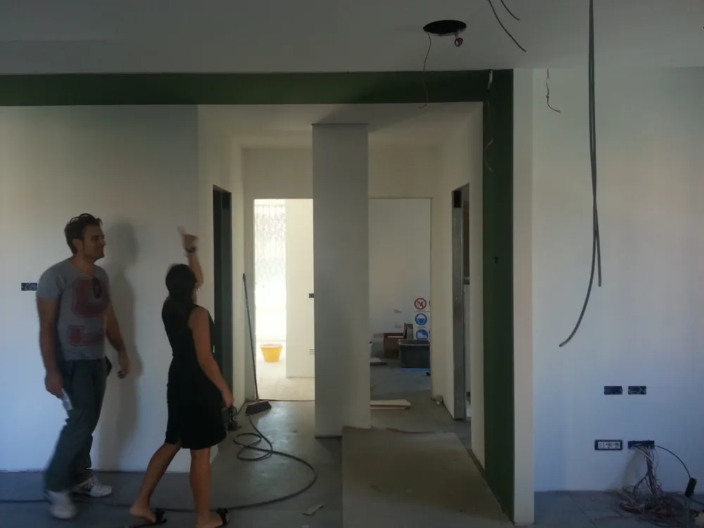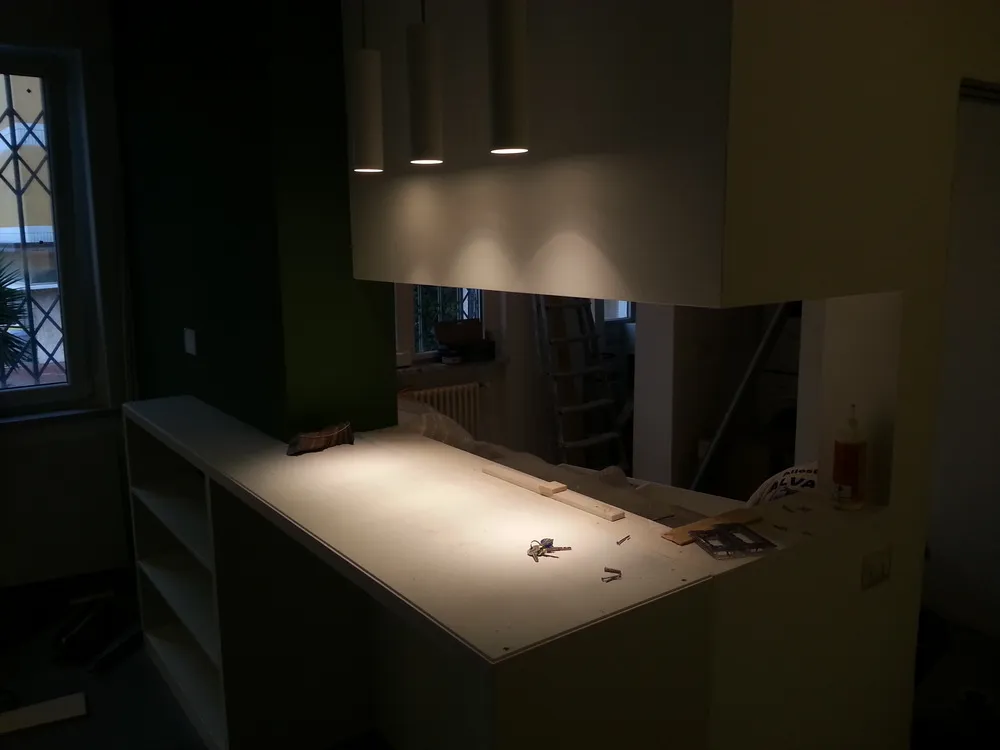 A un certo punto, l’avanzamento del cantiere ha subito una significativa accelerazione: nel giro di poche settimane sono stati completati pavimenti, cartongessi e pitture. Durante una visita in cantiere ho finalmente potuto apprezzare in modo più concreto la materializzazione delle mie idee progettuali. In una delle foto si intravede anche la proprietaria della residenza, visibilmente colpita dalla “lingua verde”, elemento architettonico distintivo e fortemente caratterizzante dell’intervento (vedi LINK della relativa news). Altri scatti di questa fase mettono in evidenza la grande operosità di tutte le maestranze, coordinate da Epoke, oltre ad alcuni dettagli costruttivi degni di nota, come le gole realizzate in prossimità del pilastro del disimpegno e l’apertura della cucina, dove sarà collocato il bancone snack.