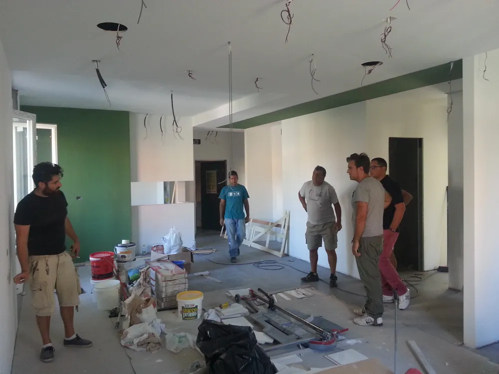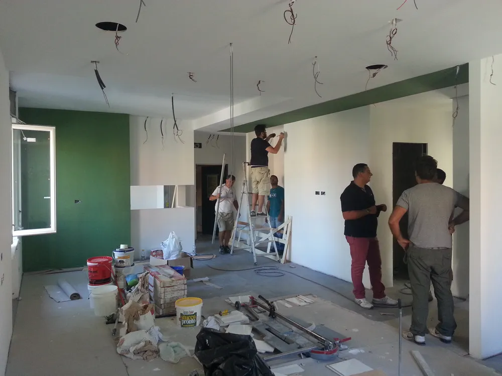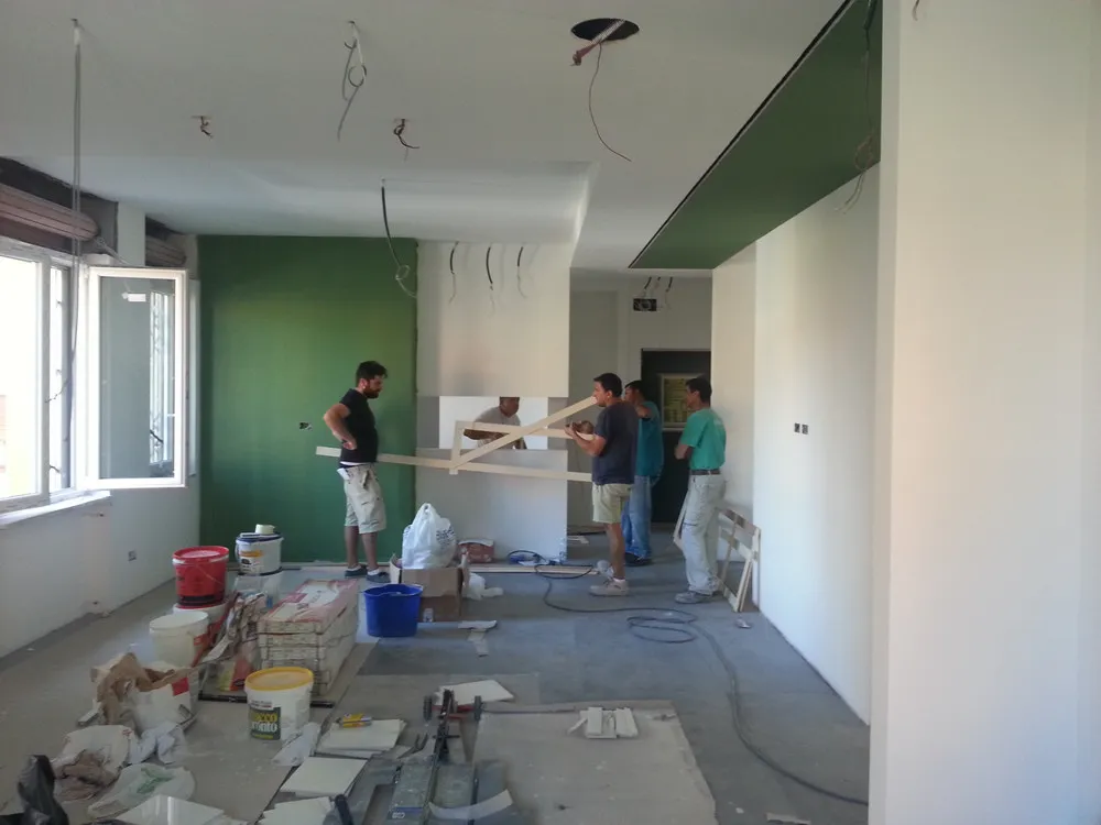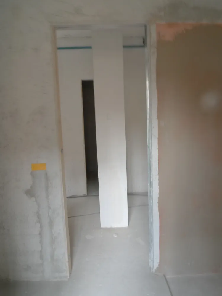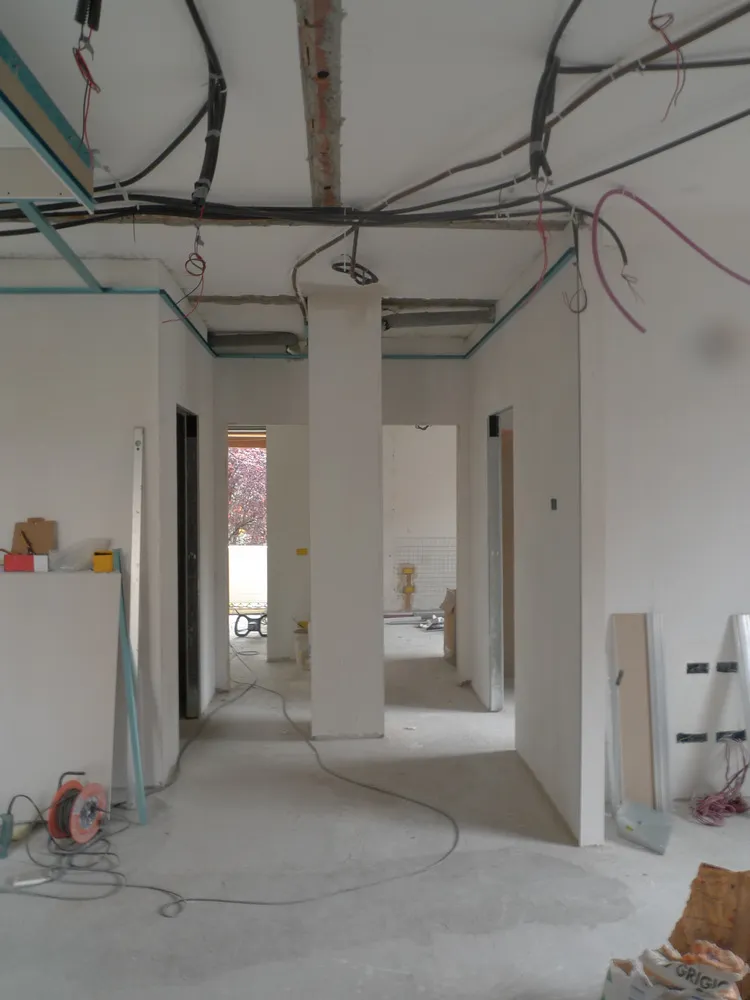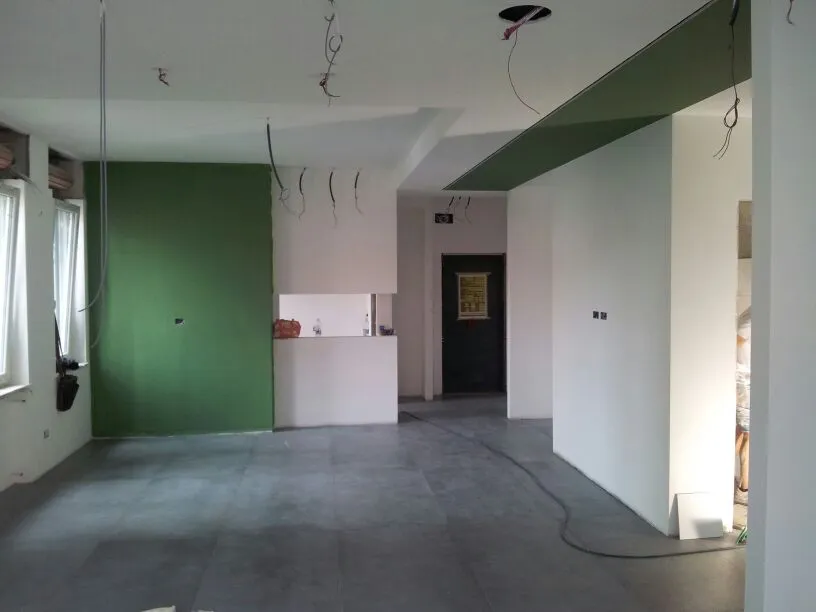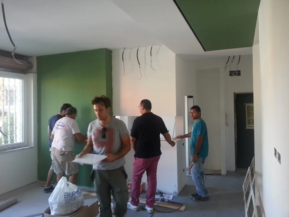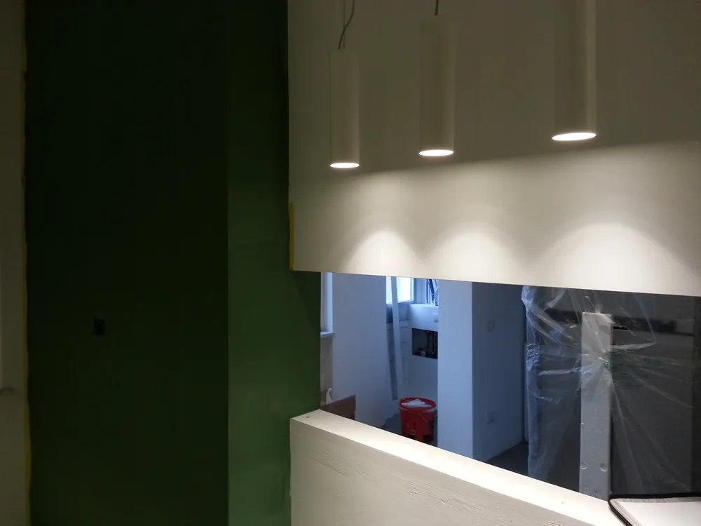 A un certo punto, l’avanzamento del cantiere ha subito una significativa accelerazione: nel giro di poche settimane sono stati completati pavimenti, cartongessi e pitture. Durante una visita in cantiere ho finalmente potuto apprezzare in modo più concreto la materializzazione delle mie idee progettuali. In una delle foto si intravede anche la proprietaria della residenza, visibilmente colpita dalla “lingua verde”, elemento architettonico distintivo e fortemente caratterizzante dell’intervento (vedi LINK della relativa news). Altri scatti di questa fase mettono in evidenza la grande operosità di tutte le maestranze, coordinate da Epoke, oltre ad alcuni dettagli costruttivi degni di nota, come le gole realizzate in prossimità del pilastro del disimpegno e l’apertura della cucina, dove sarà collocato il bancone snack.