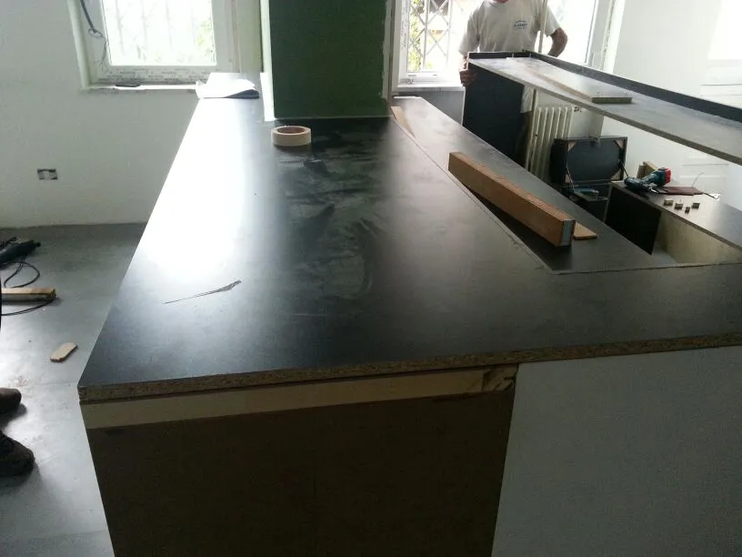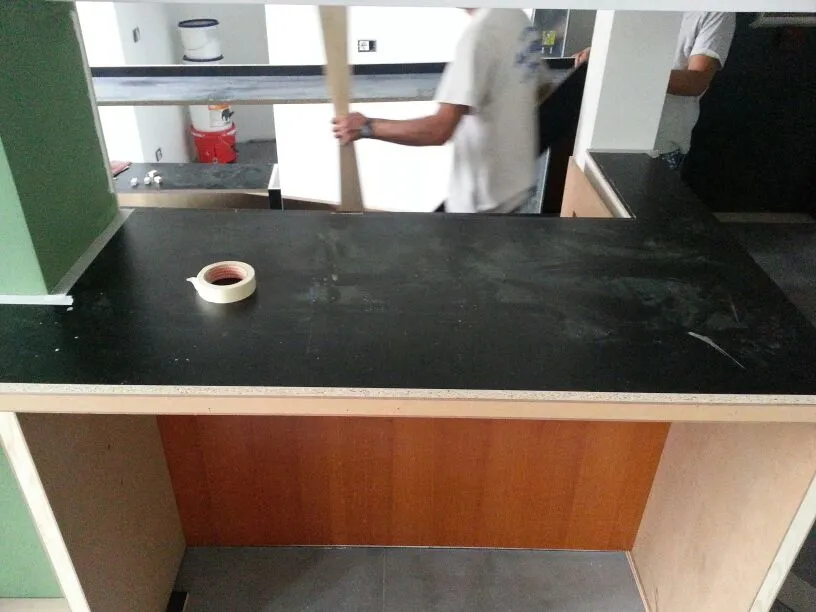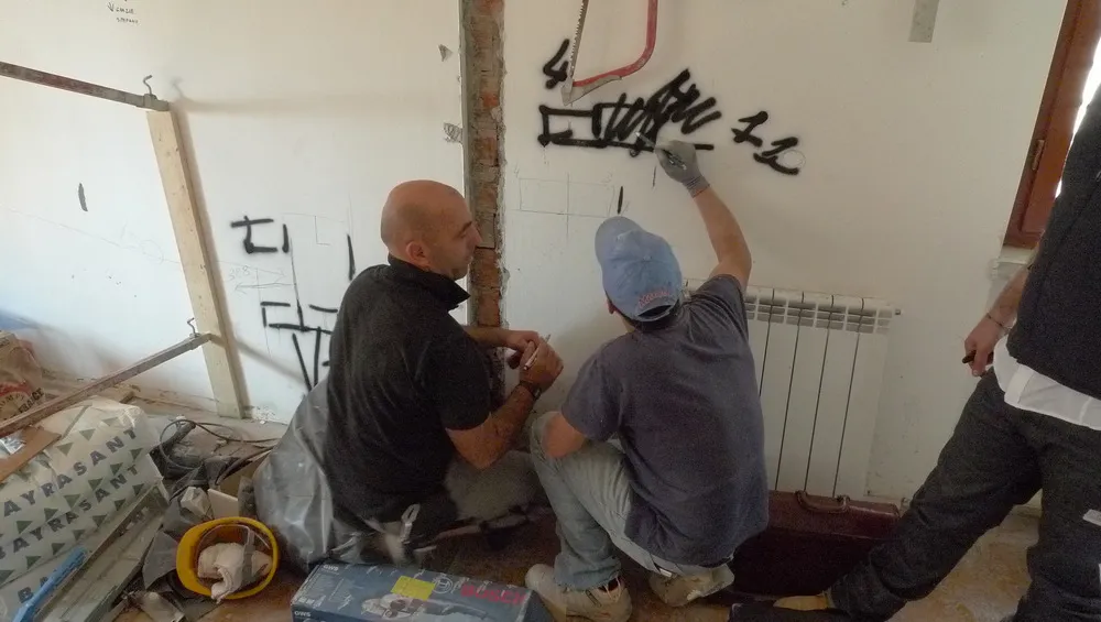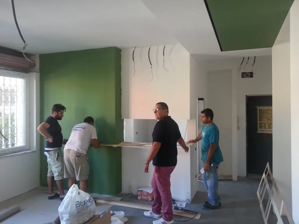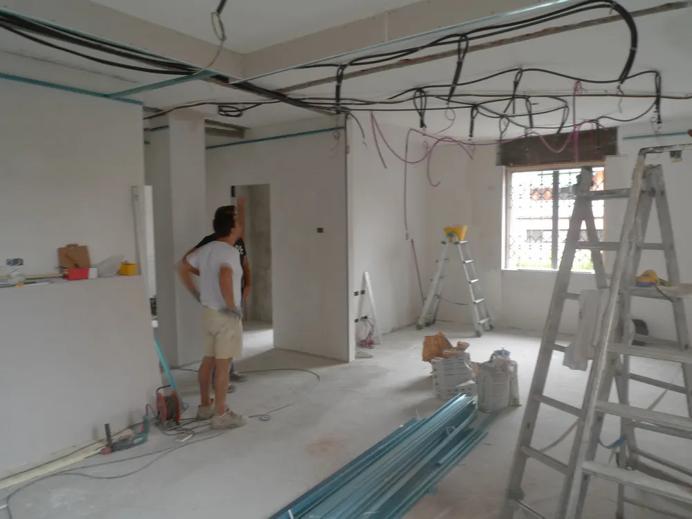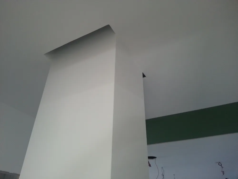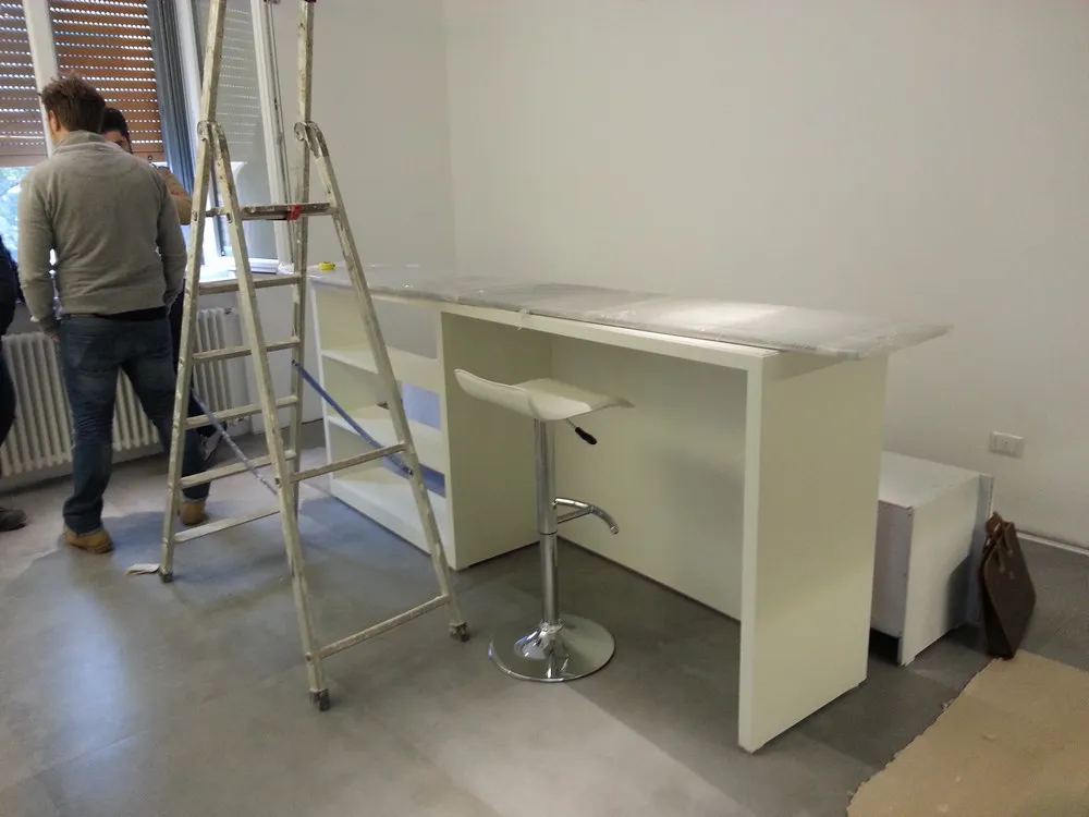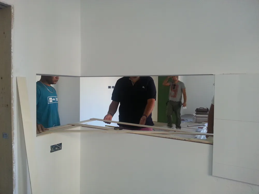 A un certo punto, l’avanzamento del cantiere ha subito una significativa accelerazione: nel giro di poche settimane sono stati completati pavimenti, cartongessi e pitture. Durante una visita in cantiere ho finalmente potuto apprezzare in modo più concreto la materializzazione delle mie idee progettuali. In una delle foto si intravede anche la proprietaria della residenza, visibilmente colpita dalla “lingua verde”, elemento architettonico distintivo e fortemente caratterizzante dell’intervento (vedi LINK della relativa news). Altri scatti di questa fase mettono in evidenza la grande operosità di tutte le maestranze, coordinate da Epoke, oltre ad alcuni dettagli costruttivi degni di nota, come le gole realizzate in prossimità del pilastro del disimpegno e l’apertura della cucina, dove sarà collocato il bancone snack.