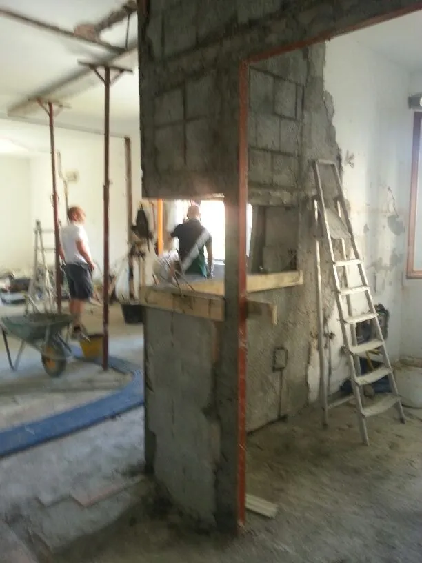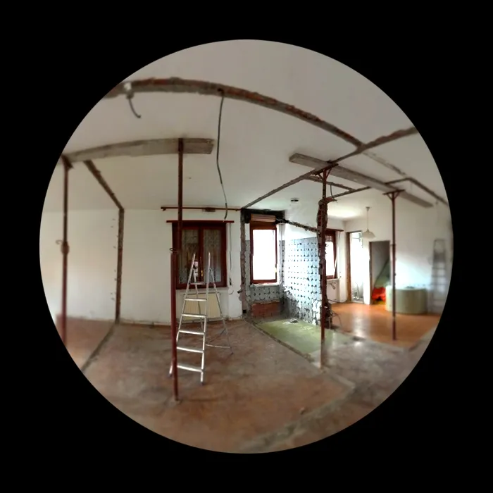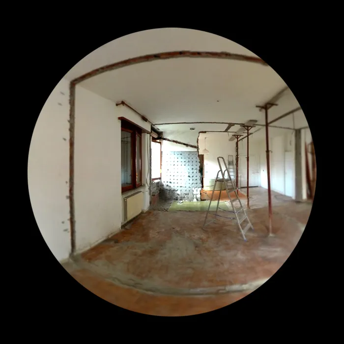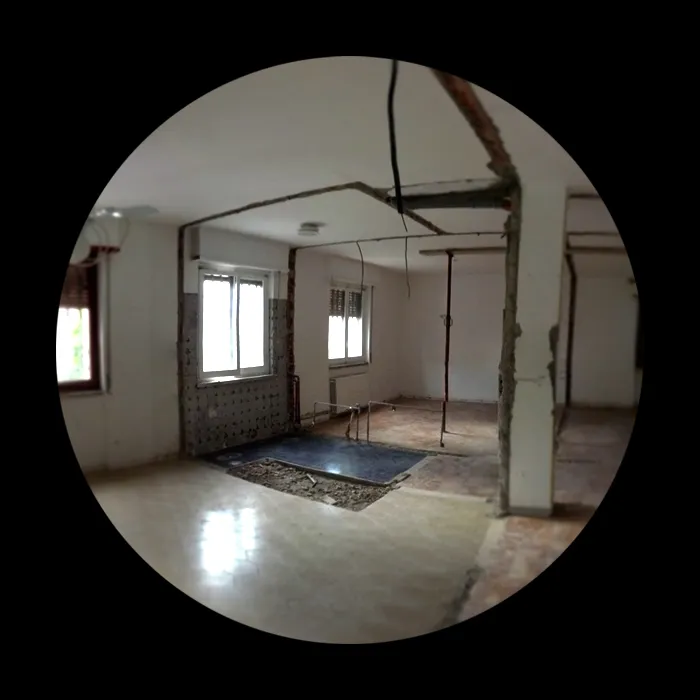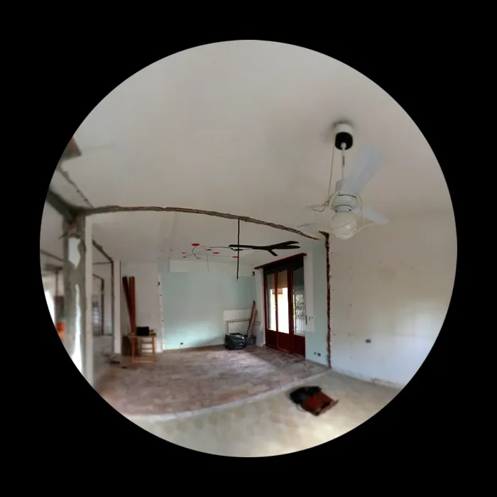 Proseguiamo con le foto delle demolizioni, in cui si può comprendere bene l’estensione della piccola residenza, la quale presenta uno spazio compartimentato che fin da subito ho pensato di convertire in un open-space. Si vedrà successivamente che l’eliminazione delle partizioni interne ha permesso di restituire continuità visiva e funzionale all’ambiente, valorizzando la luce naturale e rendendo gli spazi più fluidi e vivibili. Questa fase si è rivelata fondamentale per ridefinire l’identità dell’abitazione, trasformando un insieme di ambienti separati in un unico spazio armonico e contemporaneo.