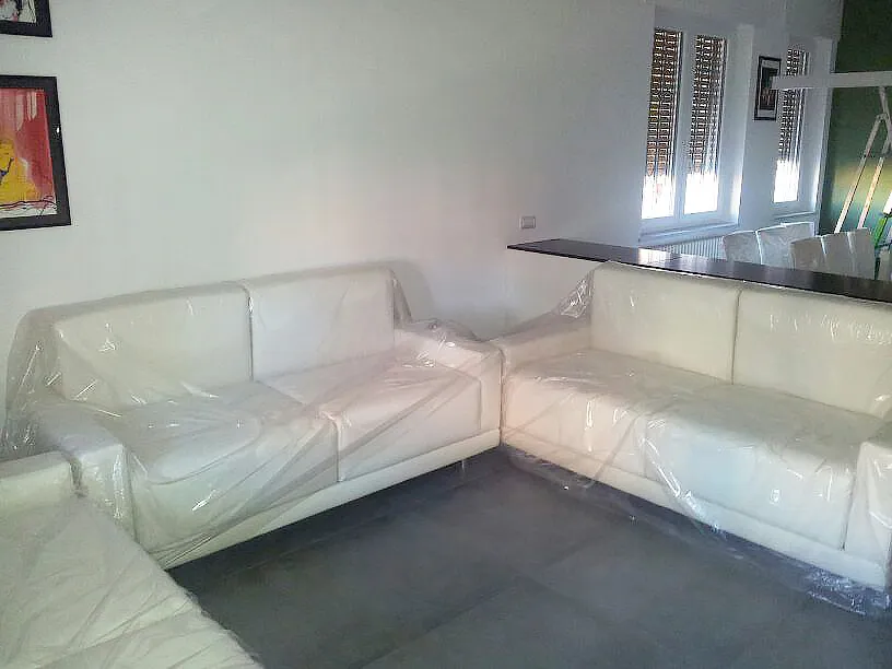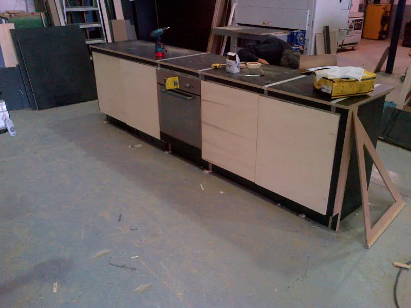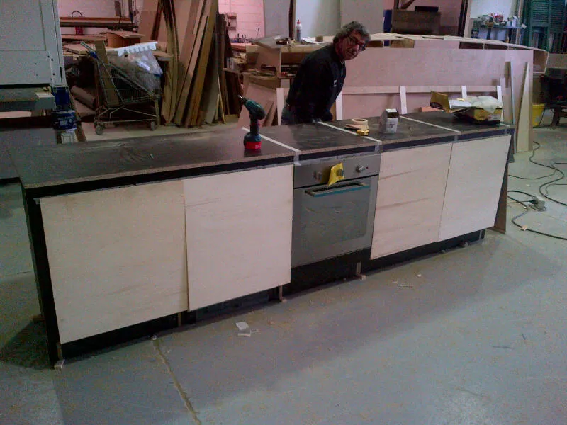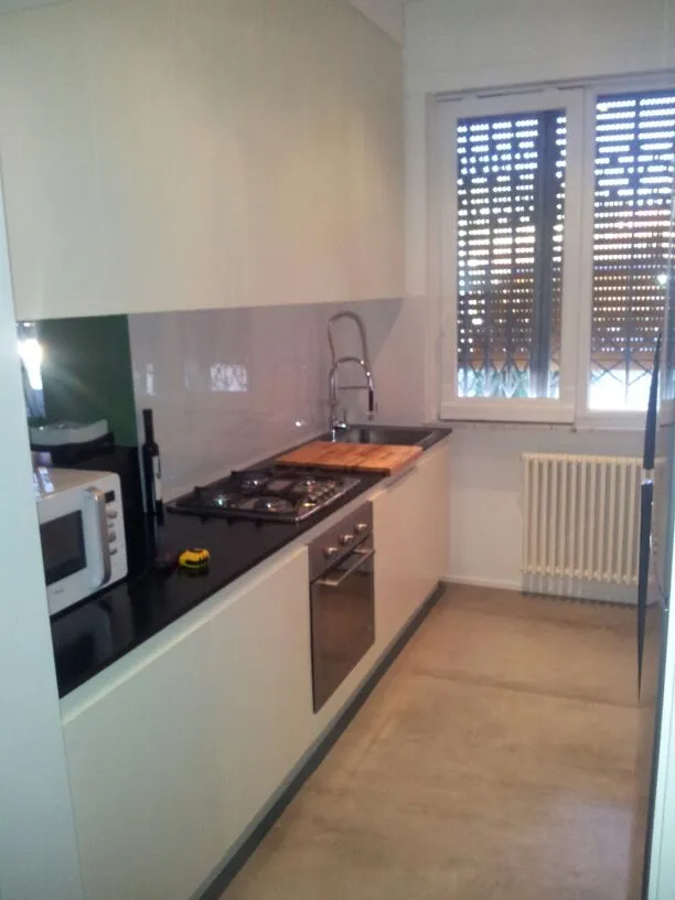 In conclusione, vengono presentate ulteriori immagini relative alla realizzazione in laboratorio della cucina e al suo successivo montaggio nella residenza. Sono inoltre documentati i divani realizzati artigianalmente e fotografati nella loro collocazione definitiva, uno dei due bagni, caratterizzato da linee essenziali, un ulteriore mobiletto integrato nella muratura (quello adiacente alla porta di ingresso all'appartamento) e alcuni arredi della camera da letto, anch’essi progettati e realizzati su misura.