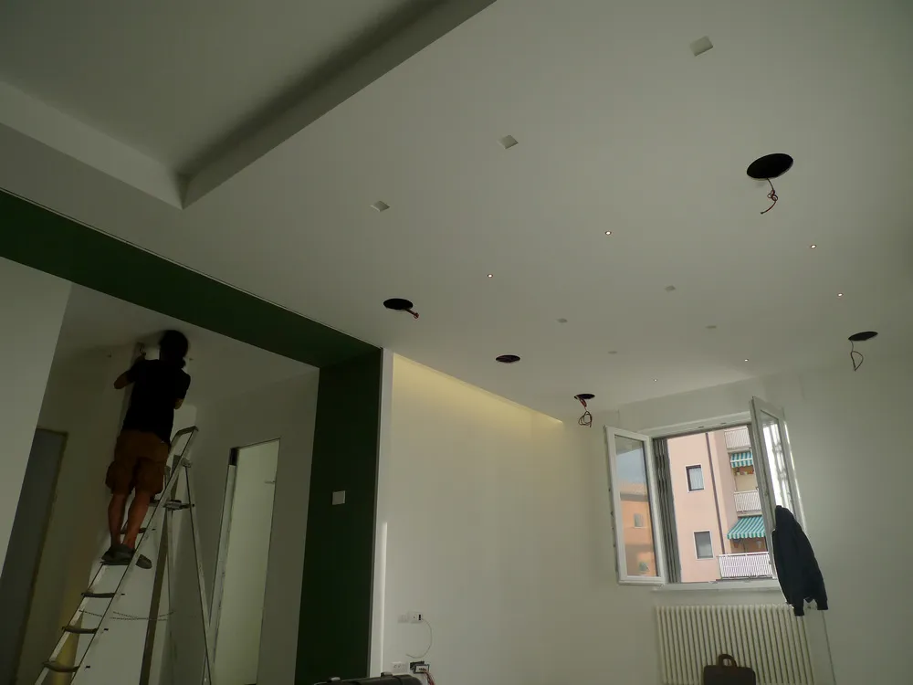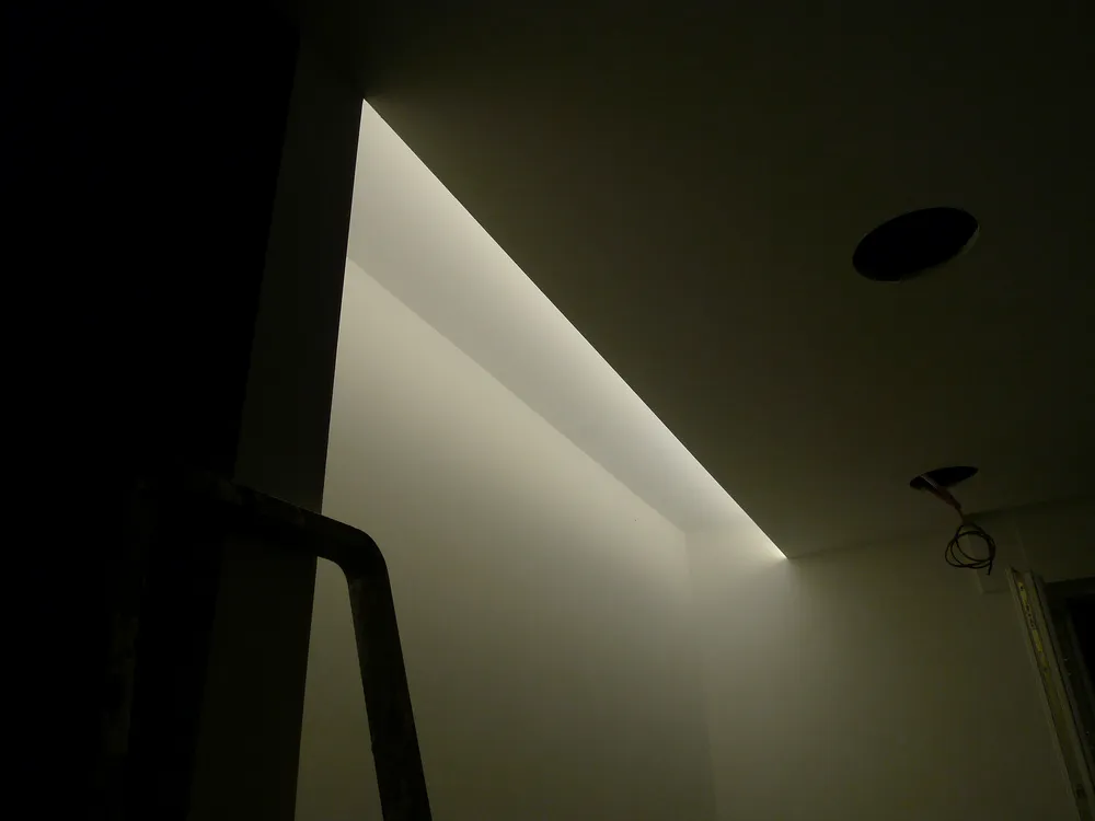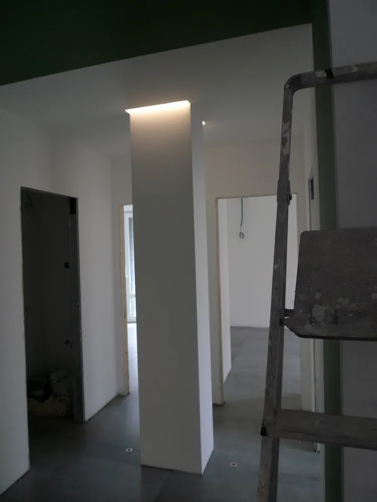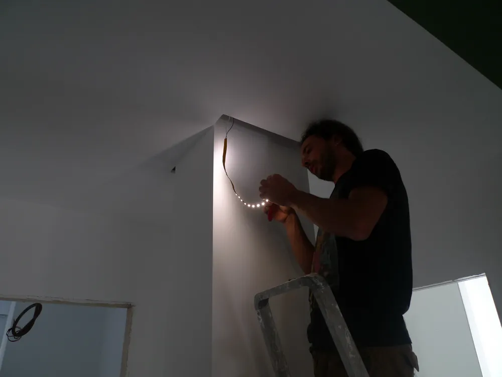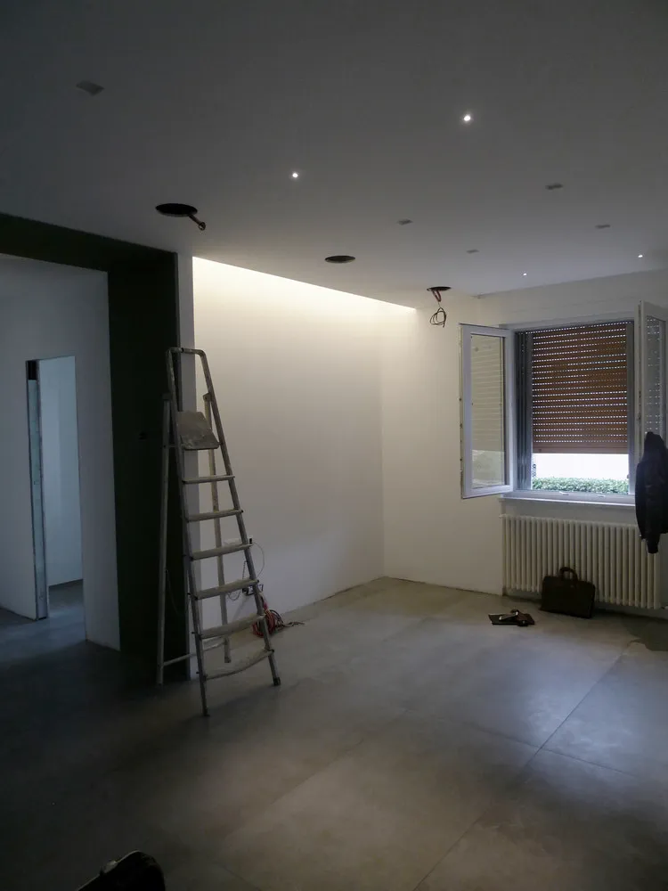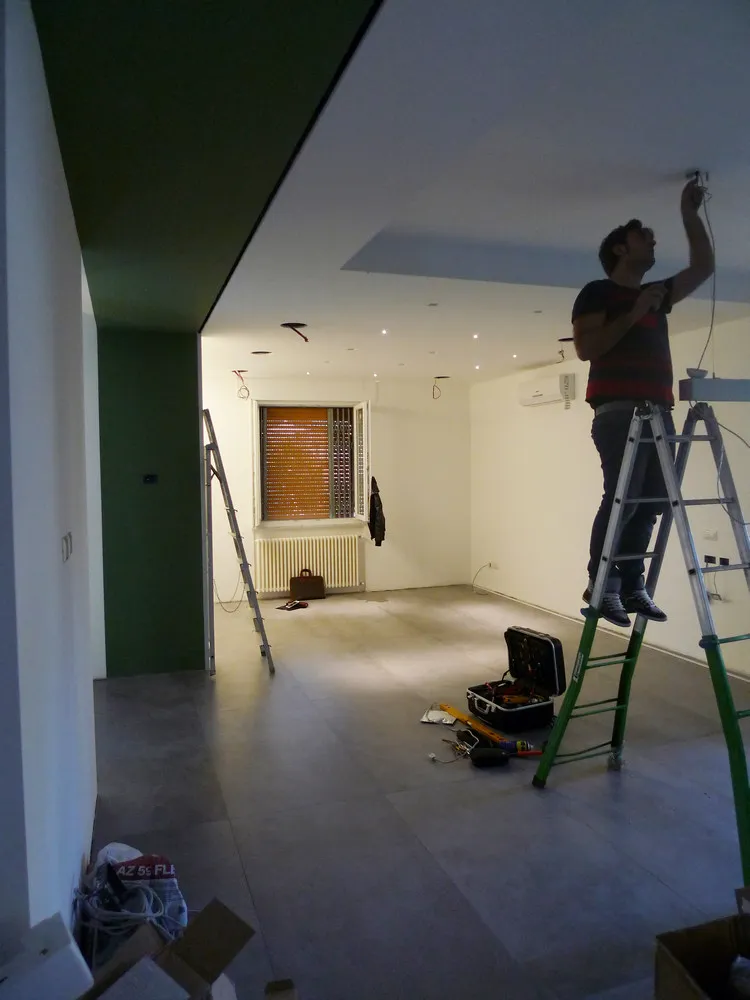 Tengo particolarmente a mostrare, anche attraverso le prossime immagini, quanta dedizione e precisione siano necessarie da parte degli operai affinché ogni elemento venga montato correttamente. In questo caso, ad esempio, uno degli operai è impegnato nell’illuminazione delle gole adiacenti al pilastro del disimpegno. In origine, avrei voluto rivestire il pilastro con una superficie a specchio, così da annullarne completamente la percezione geometrica. Tuttavia, per una serie di vincoli legati al budget, la soluzione realizzata è stata diversa: ho scelto di inserire due gole in corrispondenza dell’attaccatura al solaio, rendendole luminose. Ne risultano due piccoli segni di luce, discreti ma efficaci, che aggiungono un tocco di carattere allo spazio.