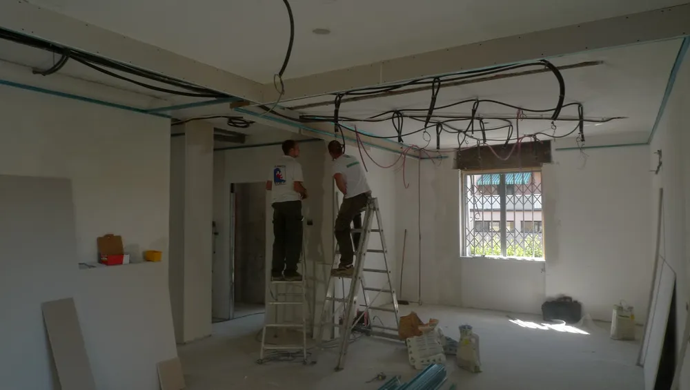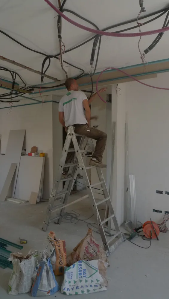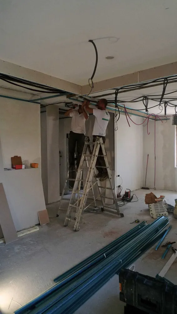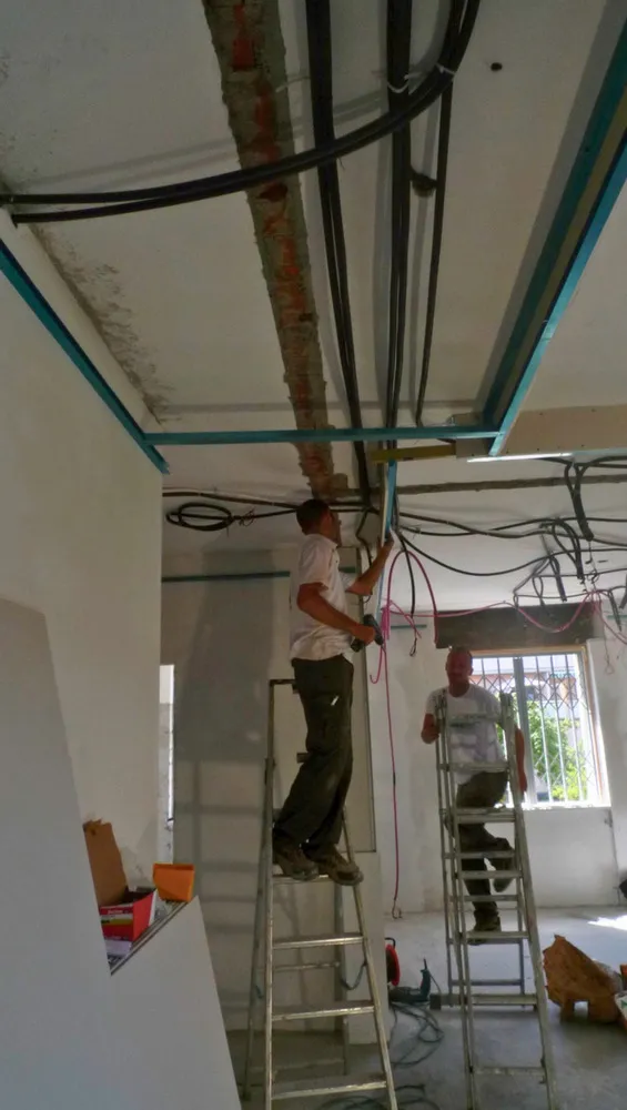 Dato che il progetto è stato concepito per garantire la massima versatilità nella posa degli impianti, prevedendone il passaggio all’interno di un controsoffitto in cartongesso, le immagini illustrano proprio questa fase operativa. Si tratta di un momento particolarmente delicato: sebbene quanto visibile rappresenti solo un passaggio preliminare (poiché la posizione definitiva di uscita dei corrugati viene stabilita solo dopo la realizzazione del controsoffitto) è comunque essenziale prestare grande attenzione. Risulta infatti fondamentale supportare adeguatamente gli impiantisti, affinché possano operare in modo fluido, senza incertezze nella configurazione dei cablaggi.