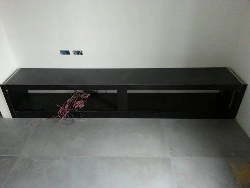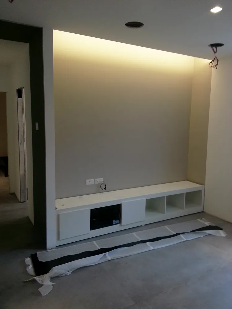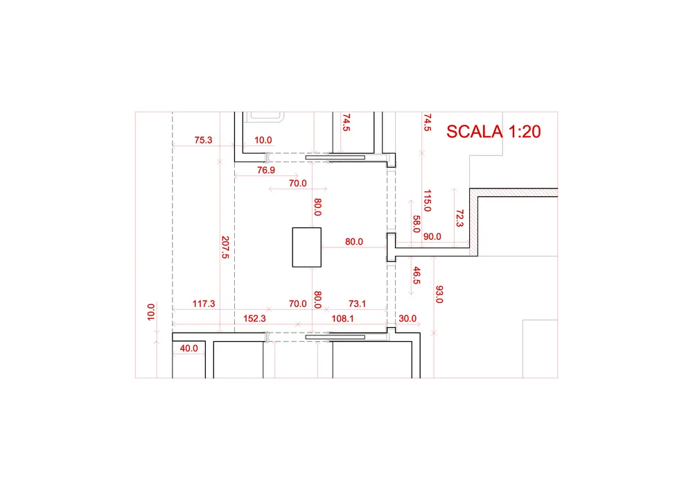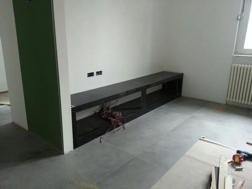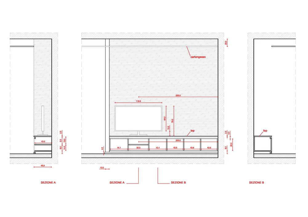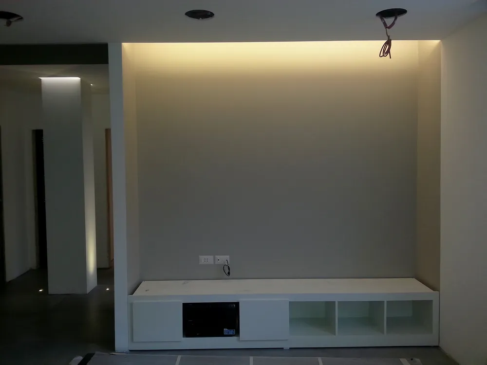 Anche l’angolo TV è stato progettato come parte integrante delle geometrie dell’ambiente. In questo spazio ho ideato un mobile basso su misura, perfettamente integrato nella muratura, valorizzato da una elegante gola luminosa superiore che diffonde una luce morbida con effetto wall-washing. Dedico sempre particolare attenzione alle dimensioni del mobile TV: la sua altezza, infatti, è determinante per garantire un corretto centro di osservazione dello schermo. Questo deve essere accuratamente calibrato in relazione sia alle dimensioni del televisore sia alla distanza del divano frontale, al fine di assicurare il massimo comfort visivo. Di seguito sono illustrate tutte le fasi di realizzazione del progetto.