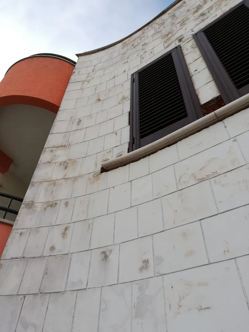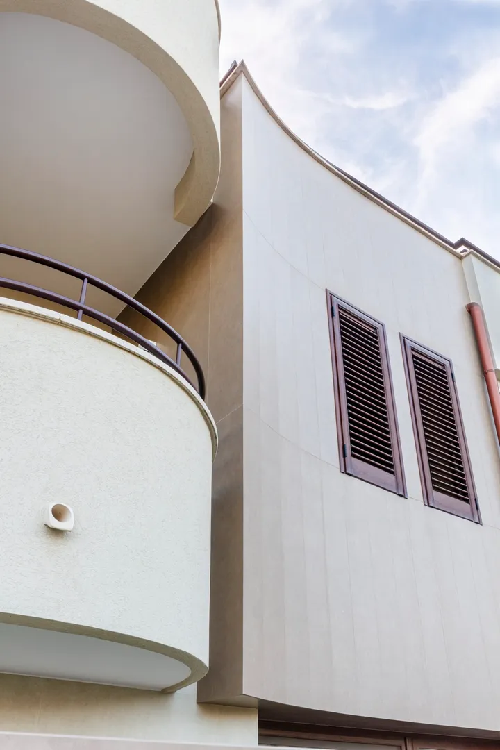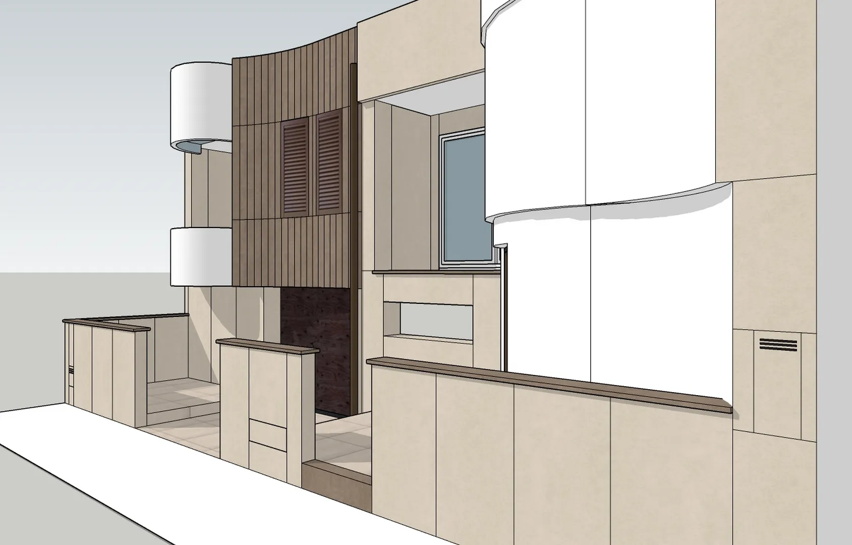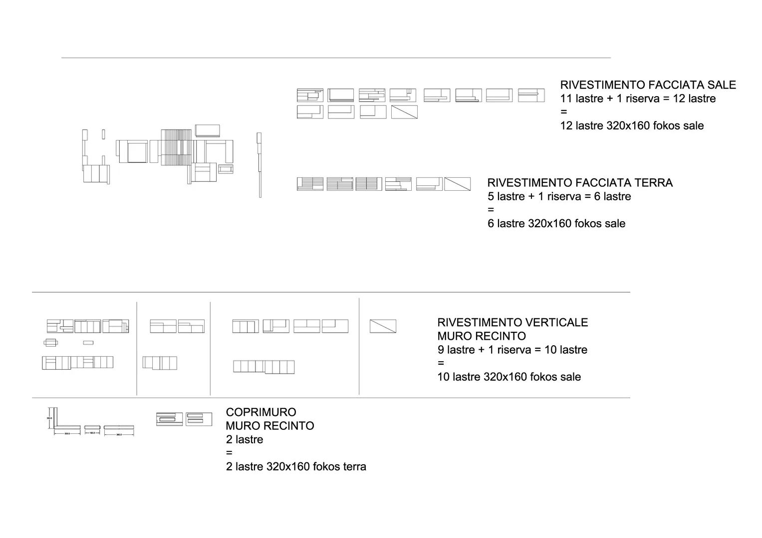 FACCIATA MAR è uno dei primi progetti condotti in collaborazione con o.key, la divisione di Olivieri Ceramiche (Avetrana - TA) che si occupa di contract e "chiavi in mano". Il tema del progetto affrontato è il seguente: "Come rivestire una facciata con il gres porcellanato slim grande formato?". Un obiettivo complesso da raggiungere, trattandosi di un prospetto con una morfologia articolata, costituito da superfici curvilinee oppure leggermente spanciate in una condizione di deterioramento piuttosto importante. La creazione del modello è stata fondamentale per distinguere le porzioni in cui effettuare la rimozione del vecchio rivestimento in pietra e per individuare le regioni che sarebbero state rivestite con gres oppure trattate semplicemente con normale intonaco da esterni. Con il supporto del team o.key, ho sviluppato il rivestimento in gres (calibrato a doghe) anche nella porzione centrale spanciata, ideata con fasce in gres, scelta fortemente voluta dal cliente per conferire alla facciata un accento di “innovazione”.
