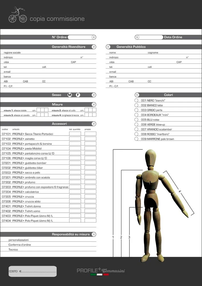 Il logotipo PROFILE+ rappresenta perfettamente lo spirito del progetto; così come anche tutta la grafica a corredo, tra cui il copia-commissione per effettuare l'ordine della bicicletta con le misure interamente personalizzabili e la nostra brochure visibile cliccando di seguito.