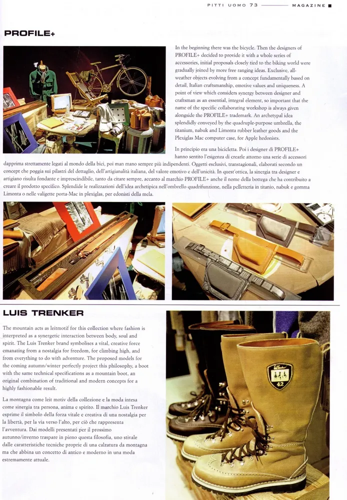 L'esperienza PROFILE+ va osservata come un contenitore pulsante di idee nel quale prendono vita oggetti e accessori che ruotano sì attorno al mondo della bicicletta, ma intesa come stile di vita. Ecco che prende forma una linea di pelletteria realizzata con tessuto in gomma nobilitata by Limonta® e inserti in pelle scamosciata e trapuntature fatte a mano. Di particolare rilevanza il marsupio ergonomico da uomo, realizzato con cover termoformata all'acqua.