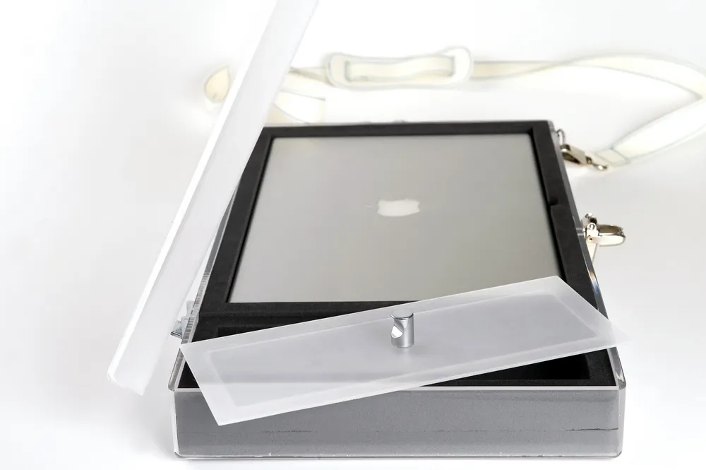 A seguire invece la collezione di contenitori in plexiglass, tra cui il porta-mac e il porta sacco a pelo.