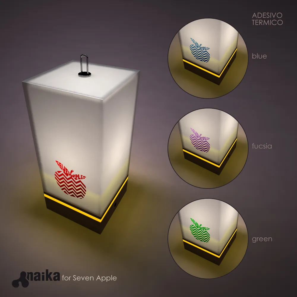 La prima produzione di lampade è stata effettuata per il famoso SEVENAPPLES, live music e disco pub di Marina di Pietrasanta (LU), che necessitava di un sistema snello per illuminare i tavoli sparsi nell'estesa area della discoteca; in aggiunta, la richiesta prevedeva anche l'incisione del logo del pub sullo scatolato opalino. Di seguito alcuni scatti effettuati nel Sevenapples.
