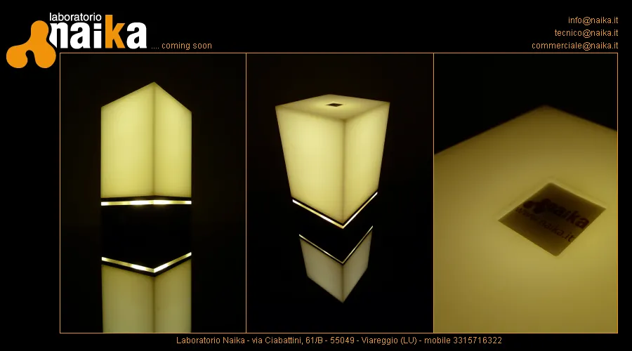 Durante il mio soggiorno toscano, ho avuto modo di collaborare con Epoke srl, un'azienda di Viareggio (LU) che si occupa di illuminotecnica integrata e cablaggi in ambito yatch e imbarcazioni da diporto. Insieme a Luigi Ferrari, titolare di Epoke, ho creato una divisione dell'azienda, dal nome Laboratorio NAIKA, il cui core business è incentrato sulla produzione di lampade artigianali prodotte con processi semi-industriali. I modelli delle lampade NAIKA sono dei "prodotti a catalogo" che in parte possono essere personalizzati. In particolare in questo articolo viene presentata la lampada "SEVEN EVEN LAMP", una lampada wireless ricaricabile con base in teak, pulsante in acciaio aisi 316, testata per la resistenza IP 65, quindi per uso outdoor, con doppia emissione di luce: una dall'intero scatolato in plexiglass opalino e l'altra dallo spessore del pannello in plexiglass traslucido collocato in corrispondenza della base in teak.
